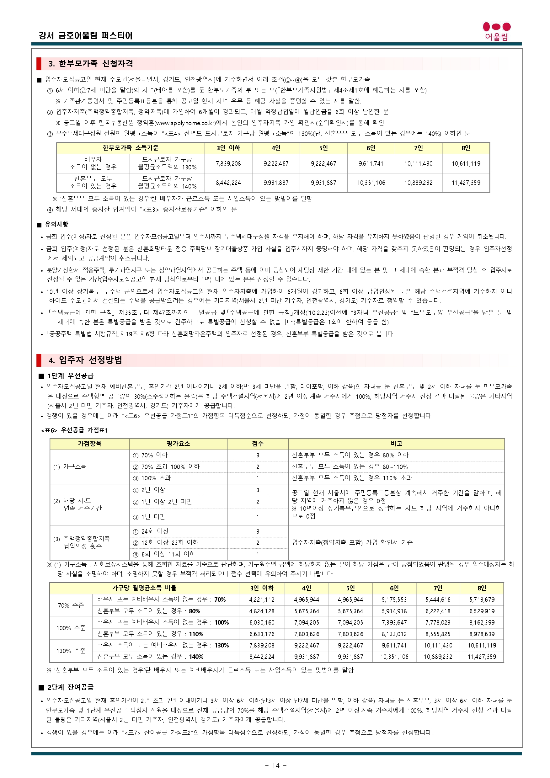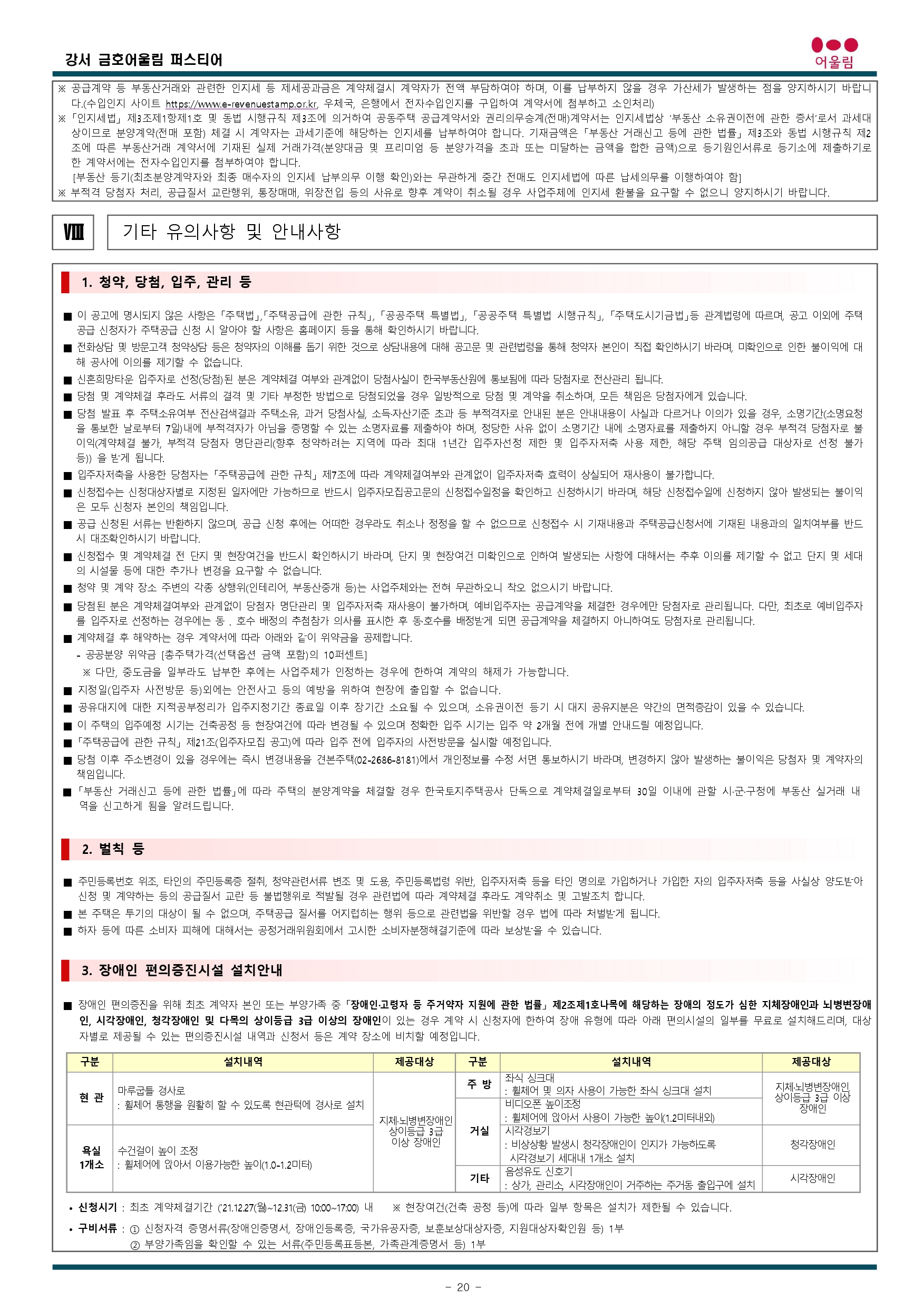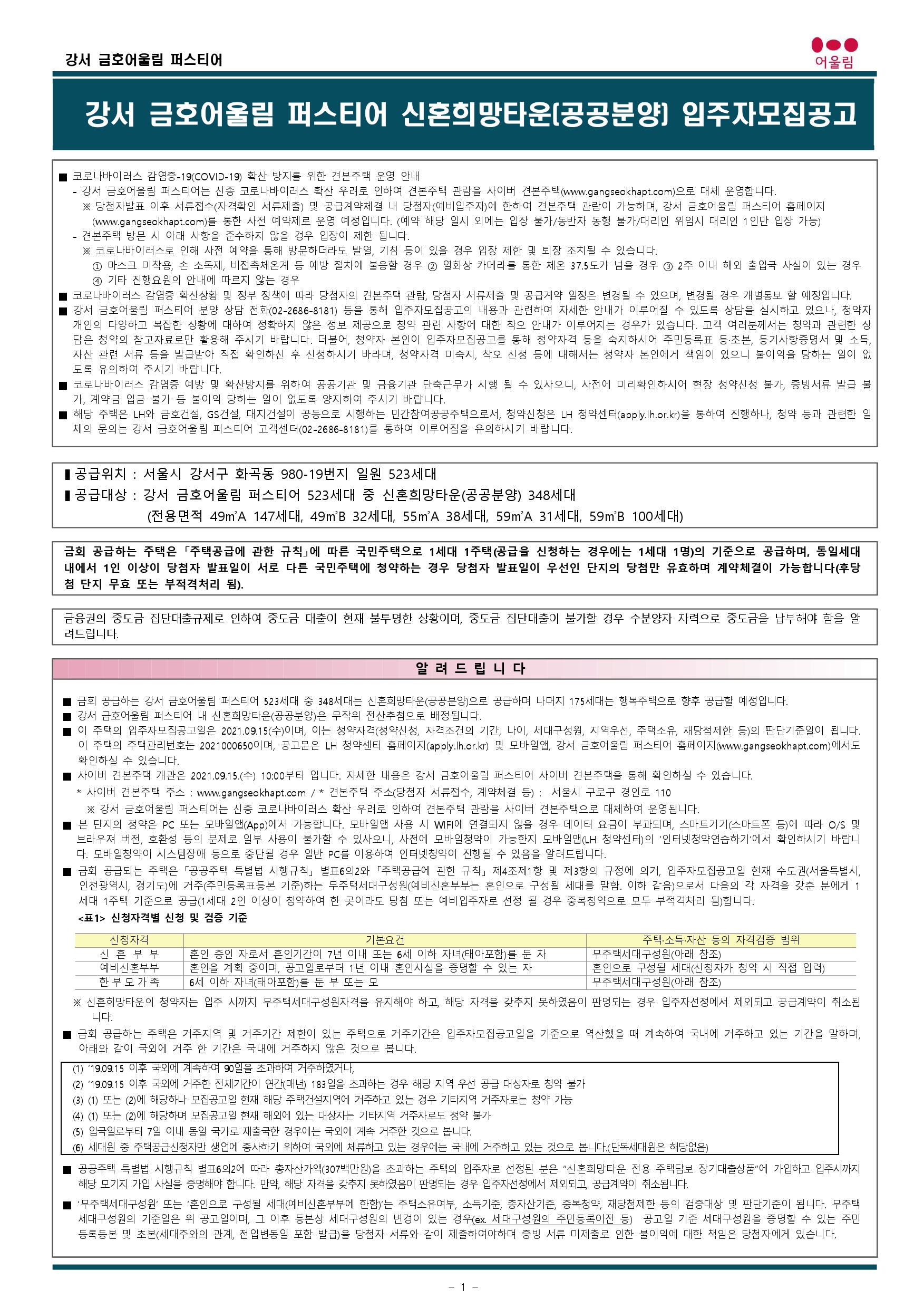■ 이 주택의 입주자모집공고일은 2021.09.15(수)이며, 이는 청약자격(청약신청, 자격조건의 기간, 나이, 세대구성원, 지역우선, 주택소유, 재당첨제한 등)의 판단기준일이 됩니다. 이 주택의 주택관리번호는 2021000650이며, 공고문은 LH 청약센터 홈페이지(apply.lh.or.kr) 및 모바일앱, 강서 금호어울림 퍼스티어 홈페이지(www.gangseokhapt.com)에서도 확인하실 수 있습니다.