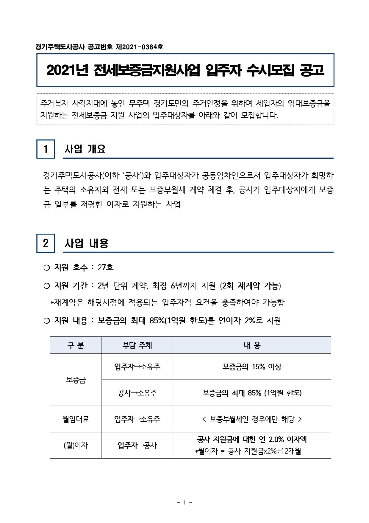경기주택도시공사(이하 ‘공사’)와 입주대상자가 공동임차인으로서 입주대상자가 희망하는 주택의 소유자와 전세 또는 보증부월세 계약 체결 후, 공사가 입주대상자에게 보증 금 일부를 저렴한 이자로 지원하는 사업입니다.