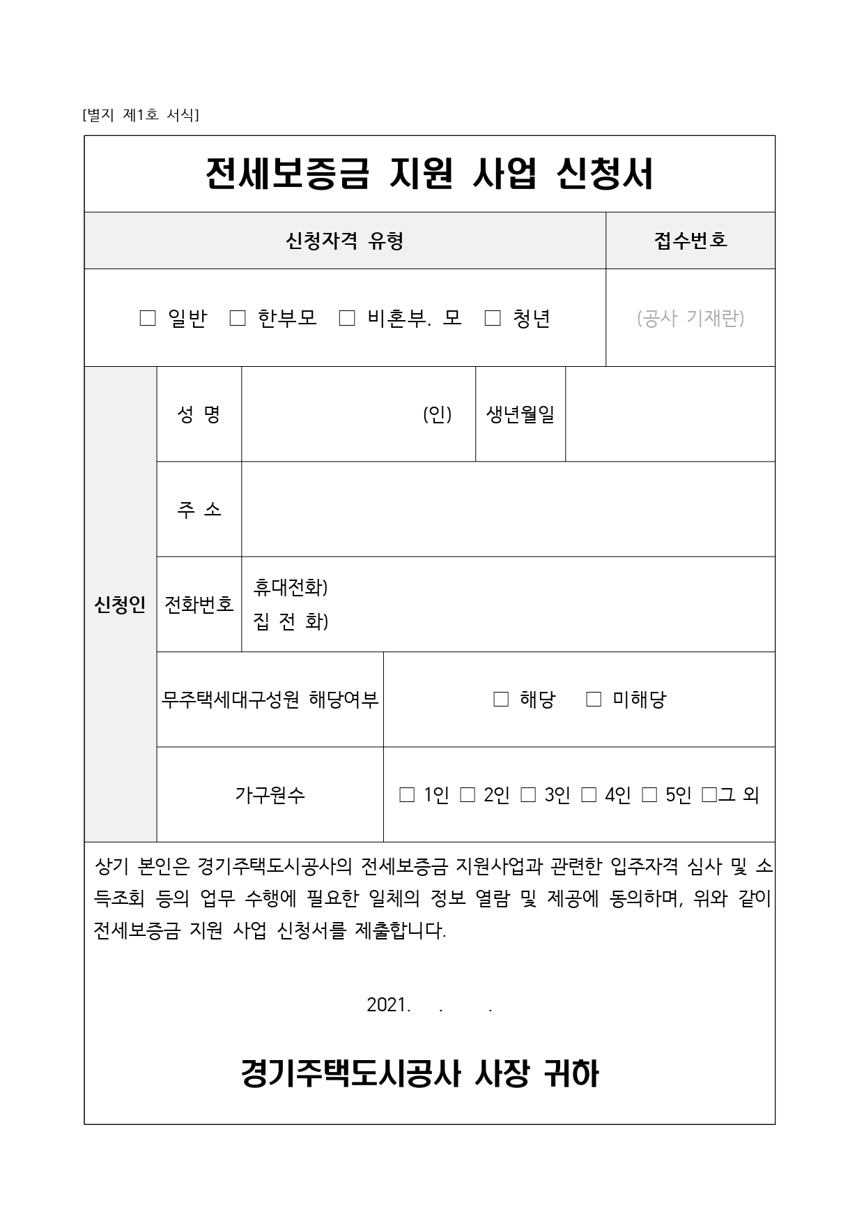 주거복지 사각지대에 놓인 무주택 경기도민의 주거안정을 위하여 세입자의 임대보증금을 지원하는 전세보증금 지원 사업의 입주대상자를 아래와 같이 모집합니다.