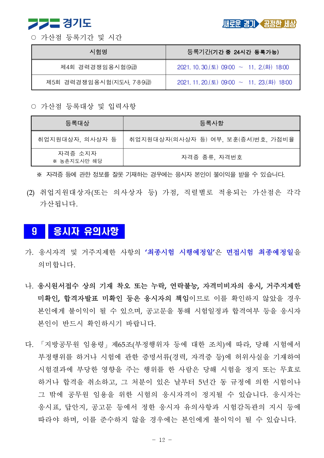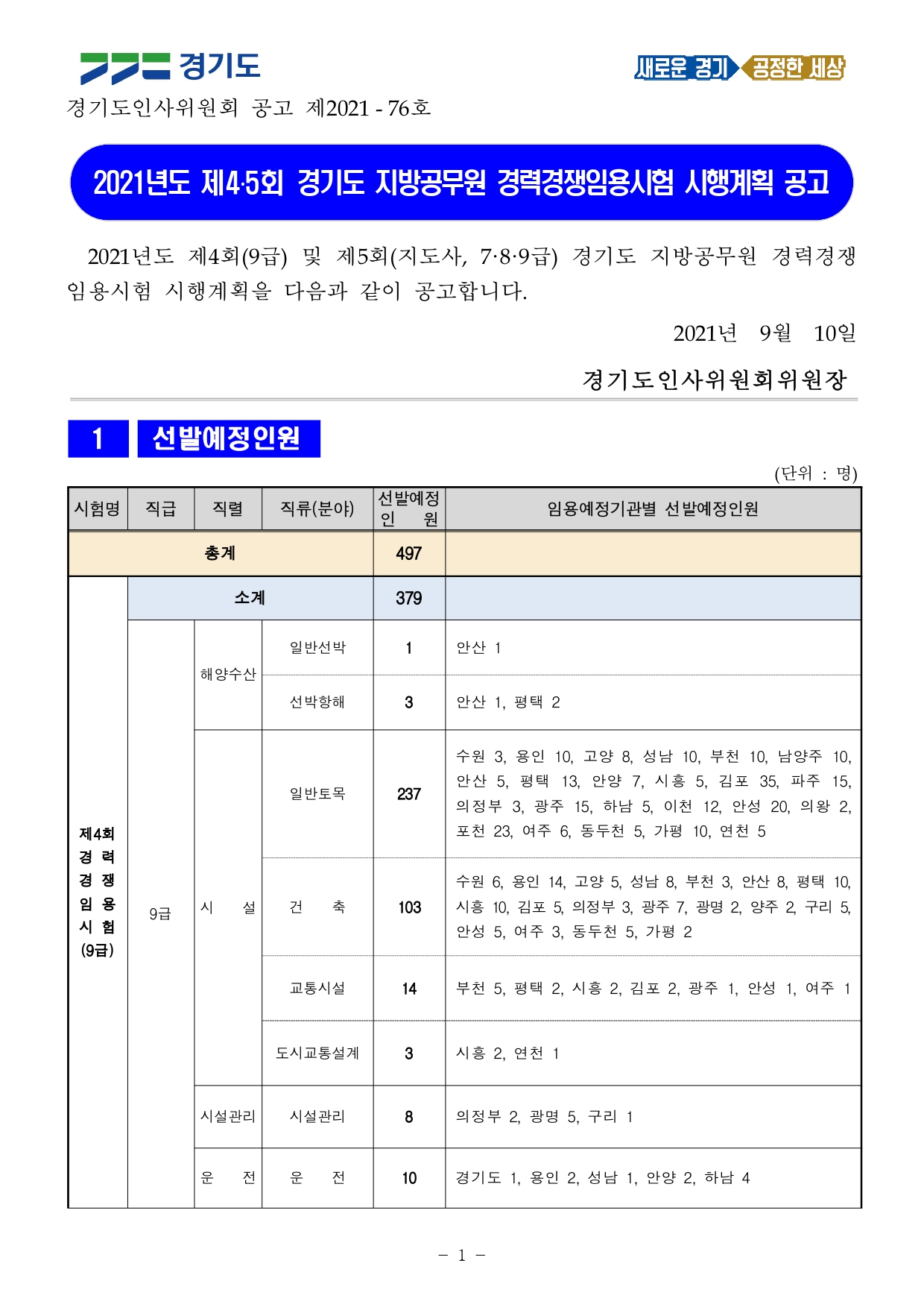 2021년도 제4회 제5회 경기도 지방공무원 경력경쟁임용시험 시행계획 공고(9.10)입니다.