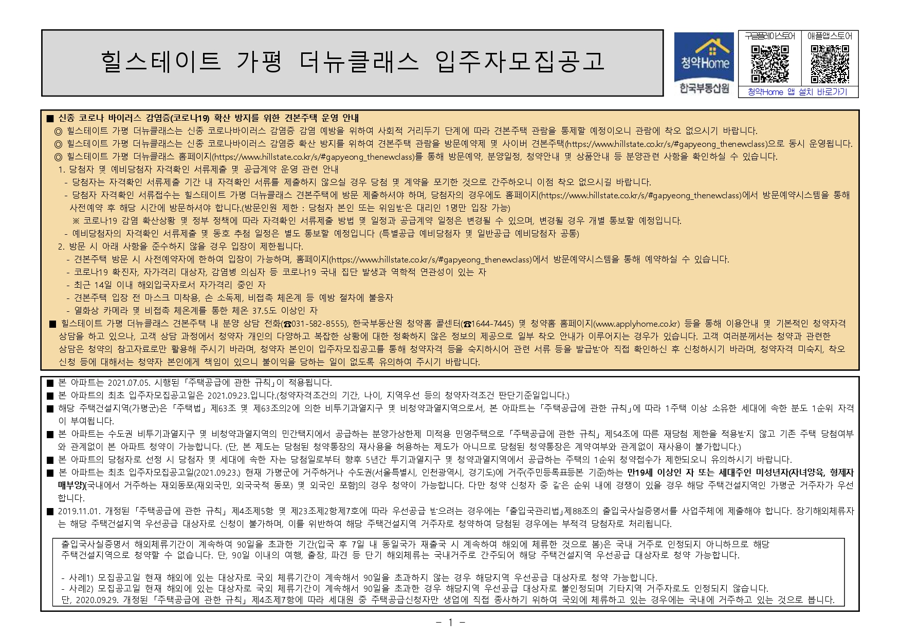 ■ 해당 주택건설지역(가평군)은 「주택법」 제63조 및 제63조의2에 의한 비투기과열지구 및 비청약과열지역으로서, 본 아파트는 「주택공급에 관한 규칙」에 따라 1주택 이상 소유한 세대에 속한 분도 1순위 자격 이 부여됩니다.