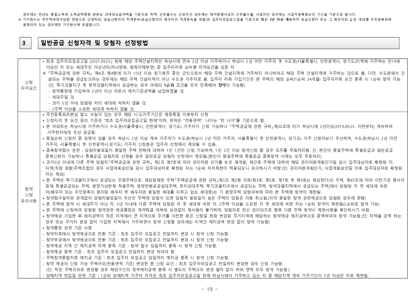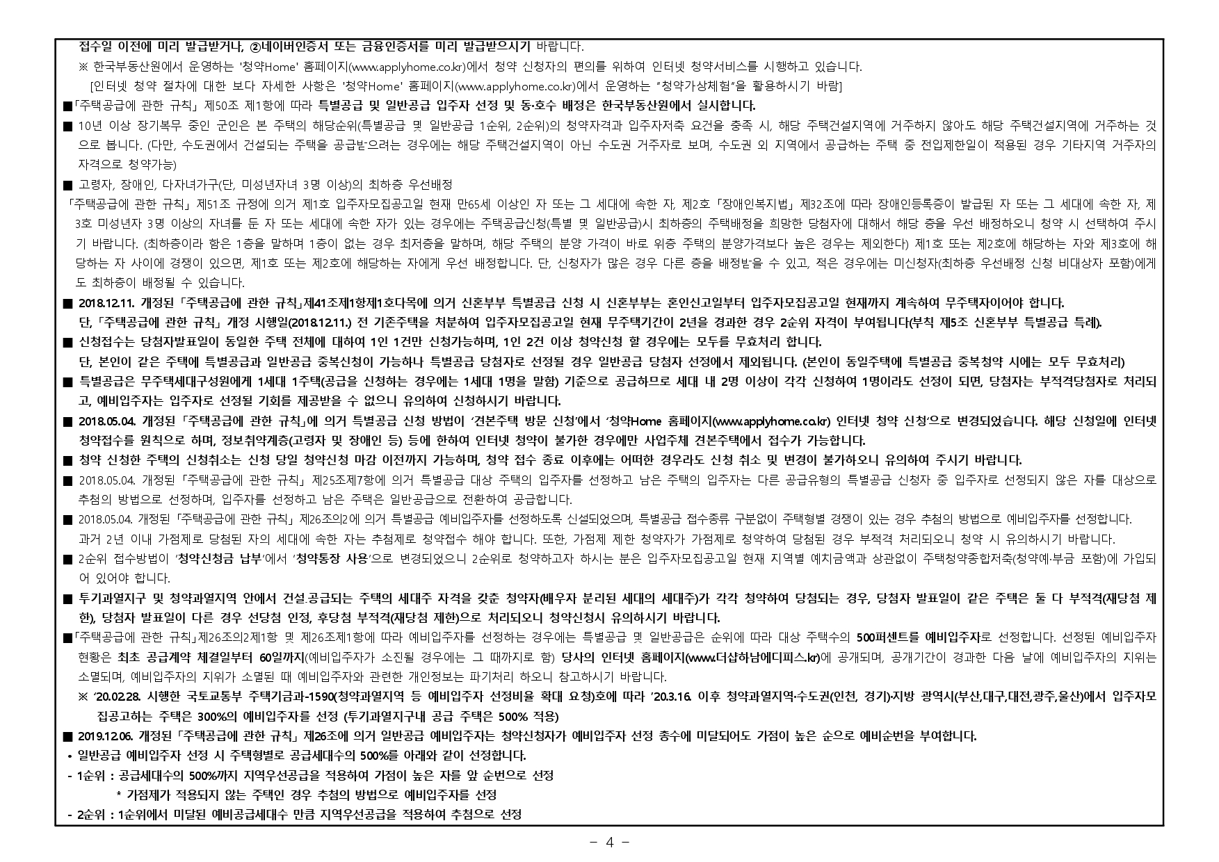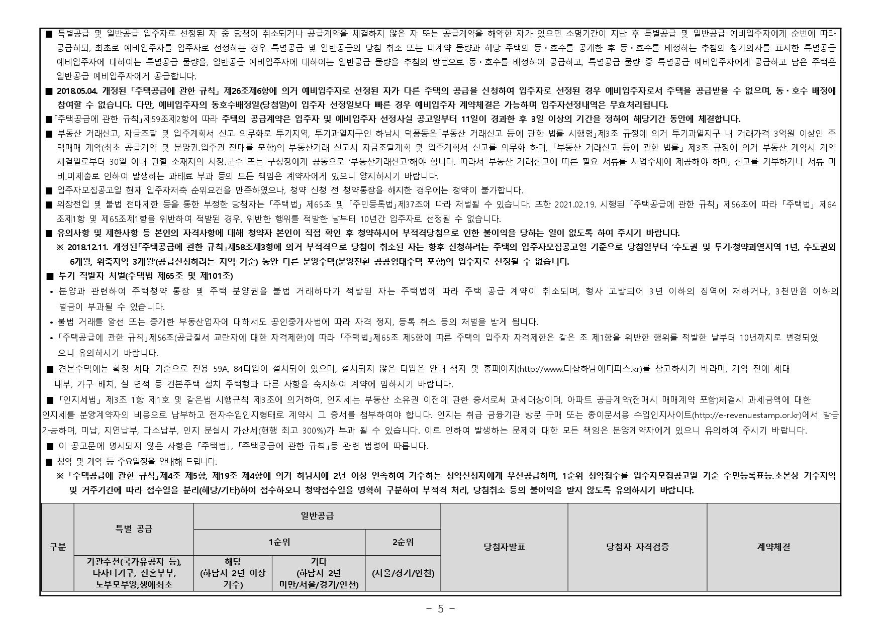 - 재당첨 제한 : 본 아파트의 당첨자로 선정된 자 및 세대에 속한 자는 당첨 주택형별 재당첨 제한 기간 내에 다른 분양주택(분양전환공공임대주택을 포함하되, 투기과열지구 및 청약과열지역이 아닌 지역 에서 공급되는 민영주택은 제외한다)의 입주자로 선정될 수 없습니다. (향후 「주택법」 및 관계법령 개정에 따라 조정될 수 있음)