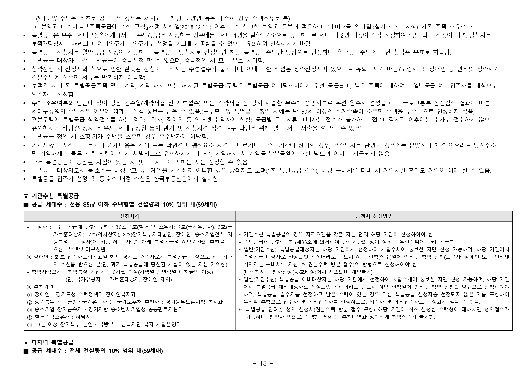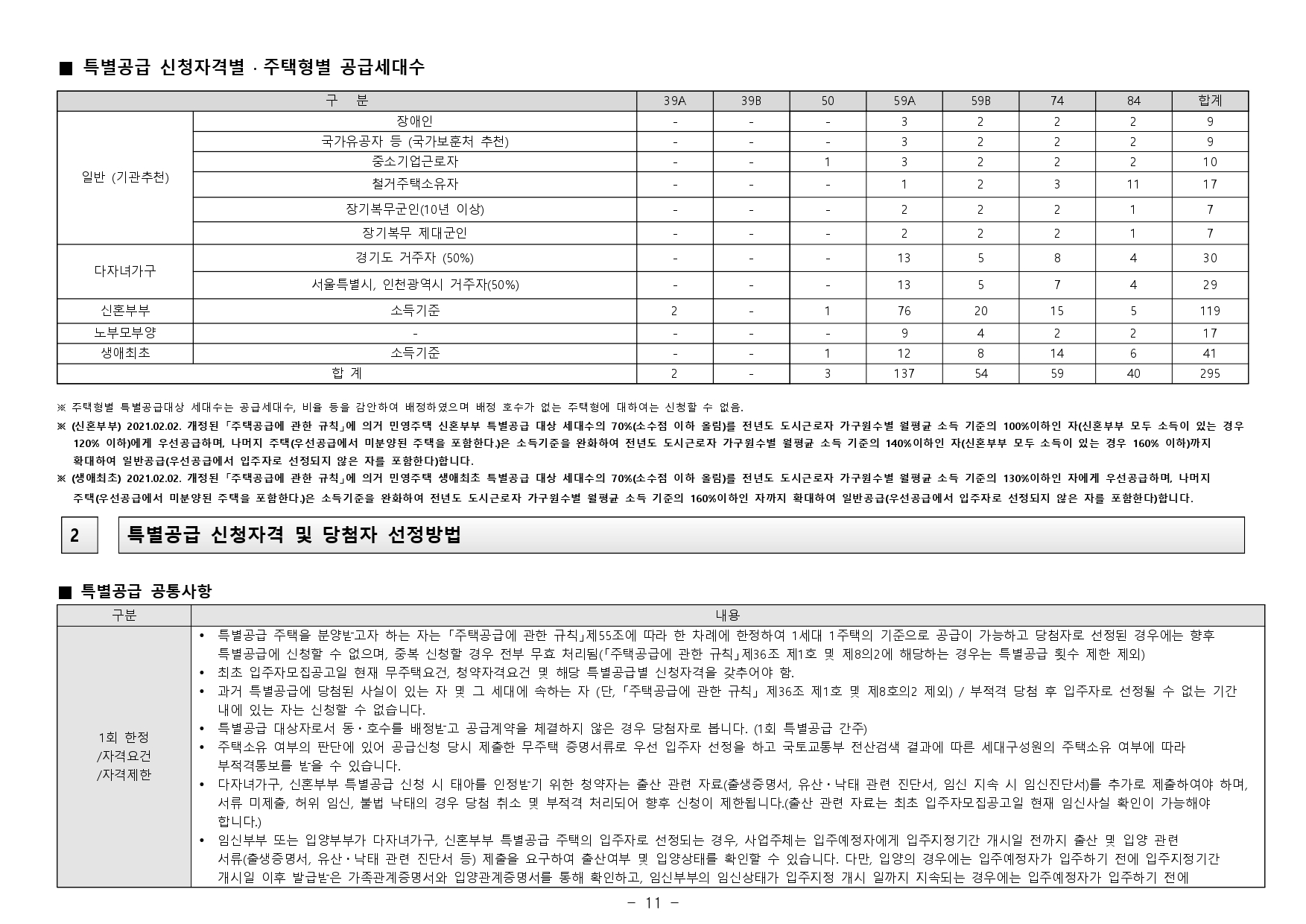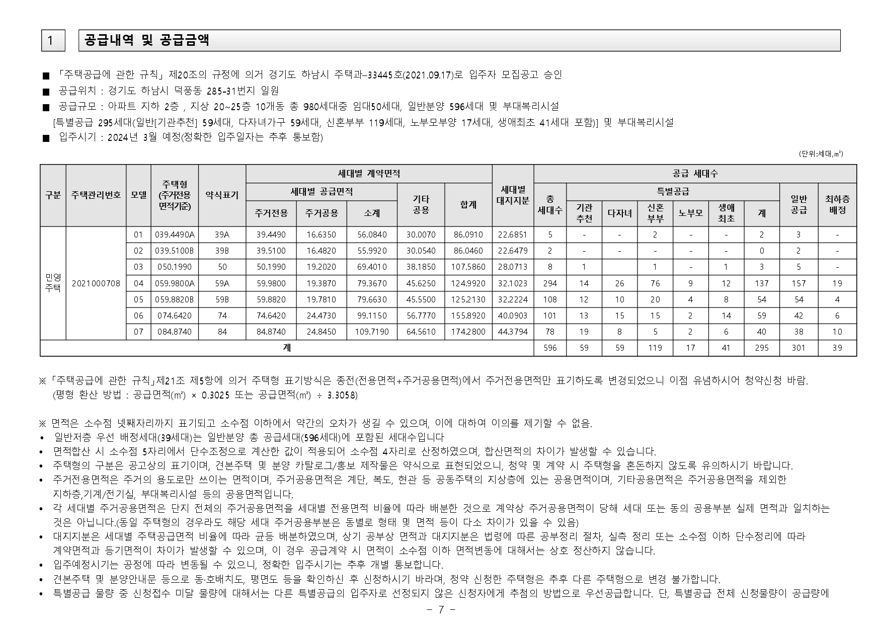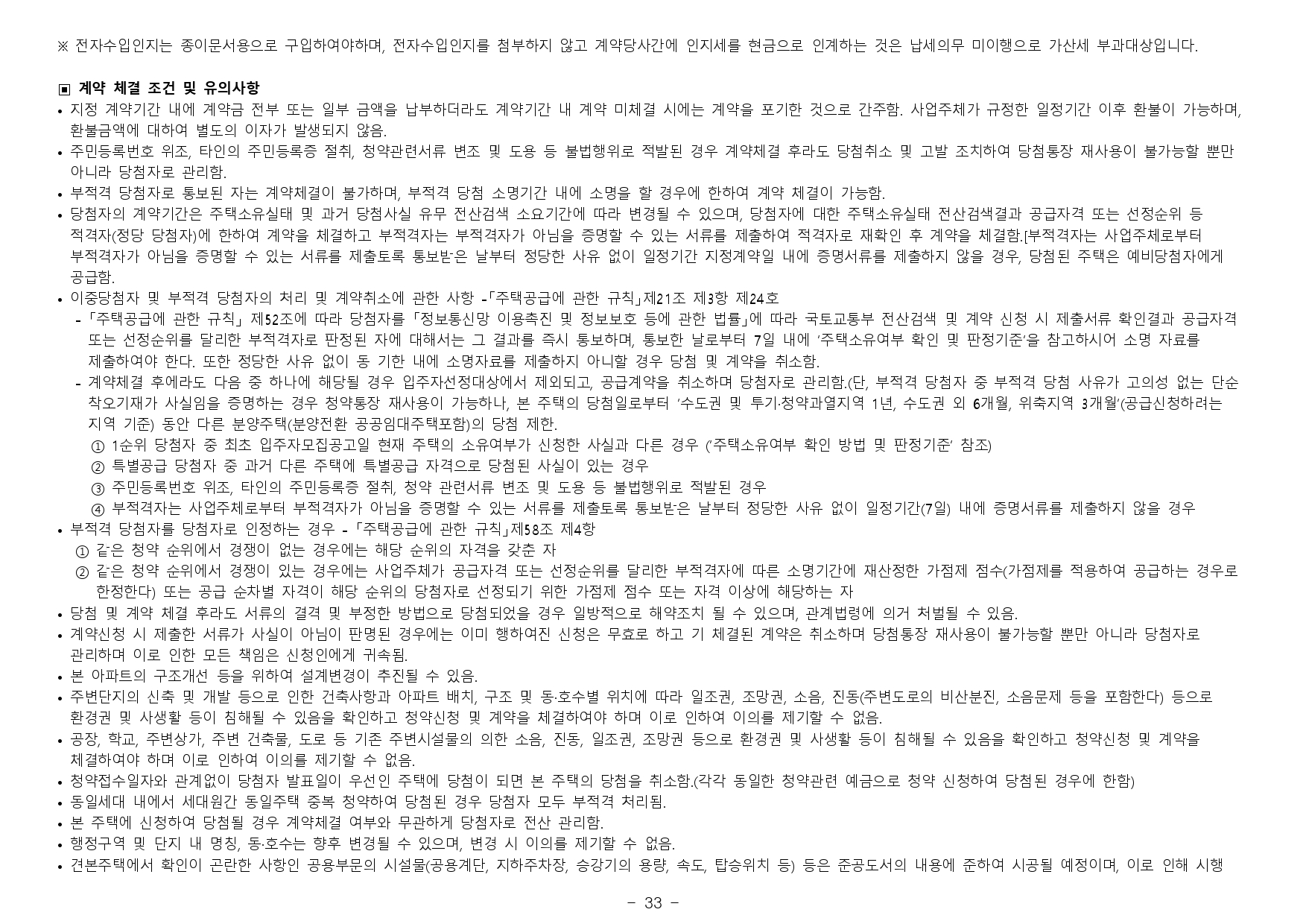 - 재당첨 제한 : 본 아파트의 당첨자로 선정된 자 및 세대에 속한 자는 당첨 주택형별 재당첨 제한 기간 내에 다른 분양주택(분양전환공공임대주택을 포함하되, 투기과열지구 및 청약과열지역이 아닌 지역 에서 공급되는 민영주택은 제외한다)의 입주자로 선정될 수 없습니다. (향후 「주택법」 및 관계법령 개정에 따라 조정될 수 있음)