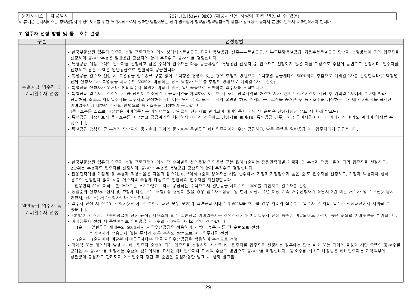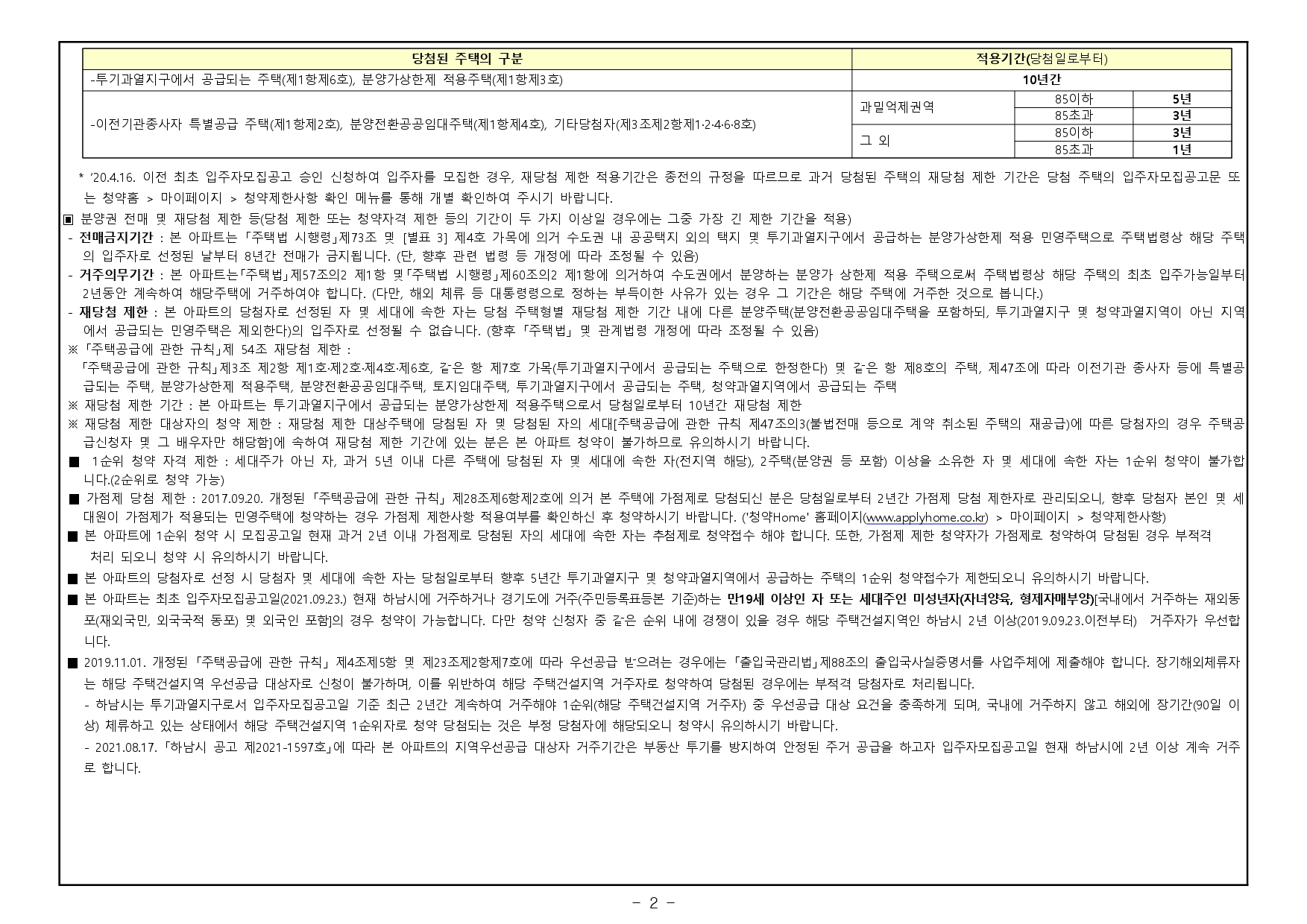 ■ 가점제 당첨 제한 : 2017.09.20. 개정된 「주택공급에 관한 규칙」 제28조제6항제2호에 의거 본 주택에 가점제로 당첨되신 분은 당첨일로부터 2년간 가점제 당첨 제한자로 관리되오니, 향후 당첨자 본인 및 세대원이 가점제가 적용되는 민영주택에 청약하는 경우 가점제 제한사항 적용여부를 확인하신 후 청약하시기 바랍니다. ('청약Home' 홈페이지(www.applyhome.co.kr) > 마이페이지 > 청약제한사항)