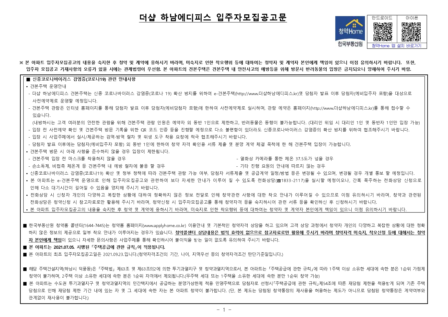 더샵 하남에디피스 입주자 모집공고(2021.9.23) 안내입니다.