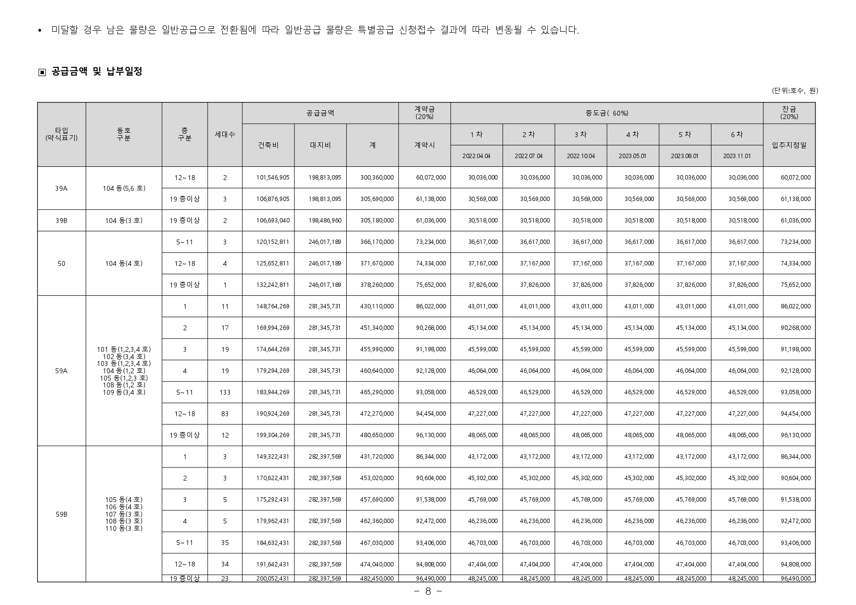 - 전매금지기간 : 본 아파트는 「주택법 시행령」제73조 및 [별표 3] 제4호 가목에 의거 수도권 내 공공택지 외의 택지 및 투기과열지구에서 공급하는 분양가상한제 적용 민영주택으로 주택법령상 해당 주택 의 입주자로 선정된 날부터 8년간 전매가 금지됩니다. (단, 향후 관련 법령 등 개정에 따라 조정될 수 있음)