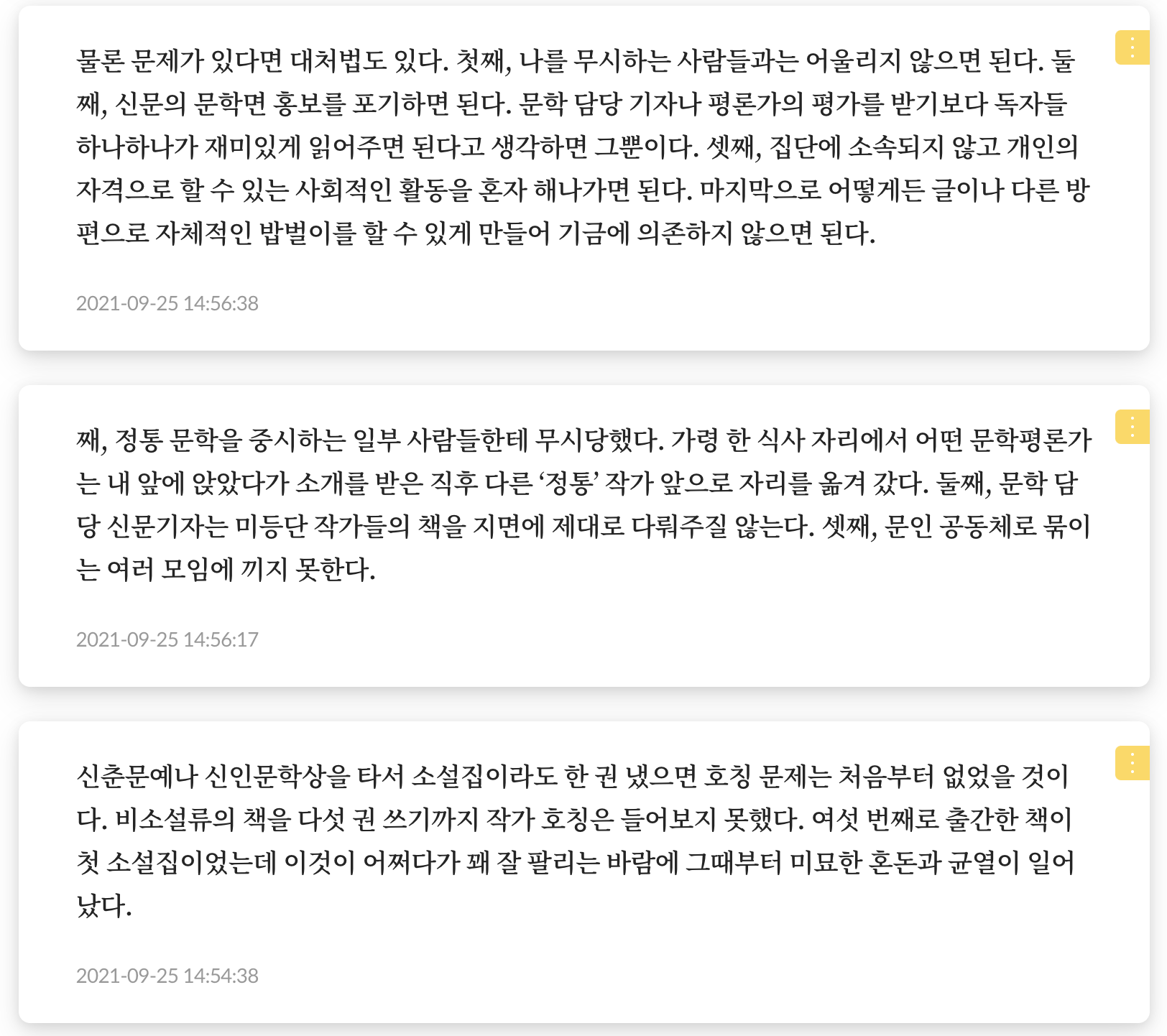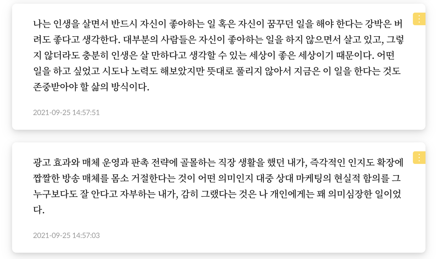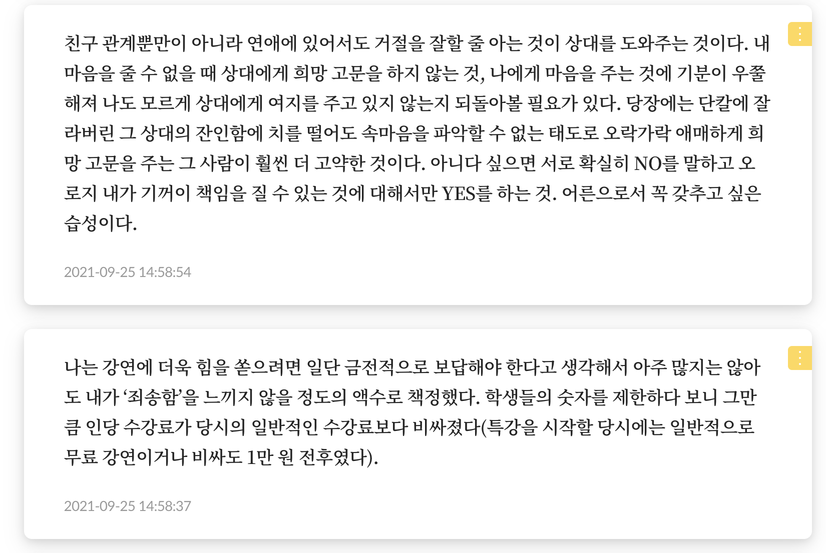 임경선 작가의 책<태도에 관하여> 밑줄. 밀리의 서재 독서노트 활용. 직장인으로서 글을 깨작깨작 쓰고 있는 사람으로서 공감이 가는 구절이 많았다.