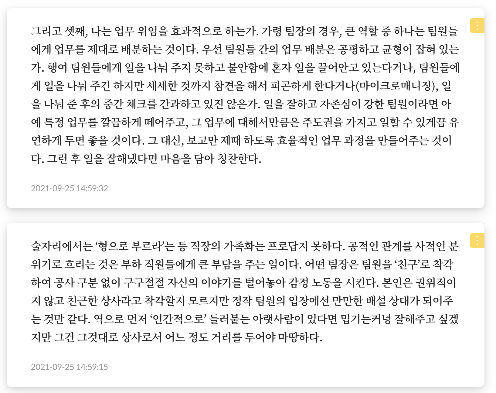 임경선 작가의 책<태도에 관하여> 밑줄. 밀리의 서재 독서노트 활용. 직장인으로서 글을 깨작깨작 쓰고 있는 사람으로서 공감이 가는 구절이 많았다.