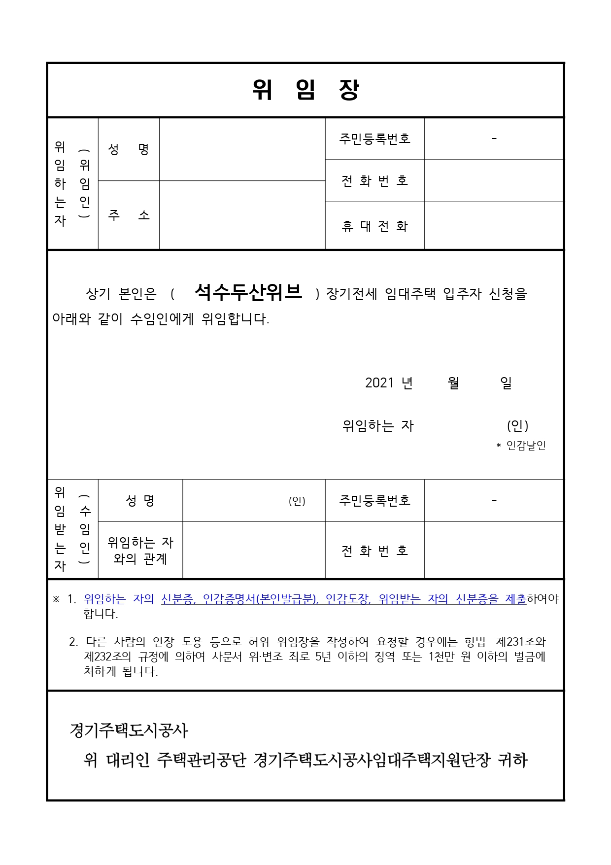 ▪ 경기주택도시공사에서 공급하는 장기전세주택은 20년의 범위에서 전세계약 방식으로 공급되는 분양전환이 되지 않는 임대주택으로 공공주택특별법 제49조의4 및 제57조의3에 의거 임차권의 양도·전대·알선행위 등 공공주택특별법에 위법한 행위 시 모두 처벌(3년 이하 징역 또는 3,000만원 이하의 벌금)을 받게 됩니다.