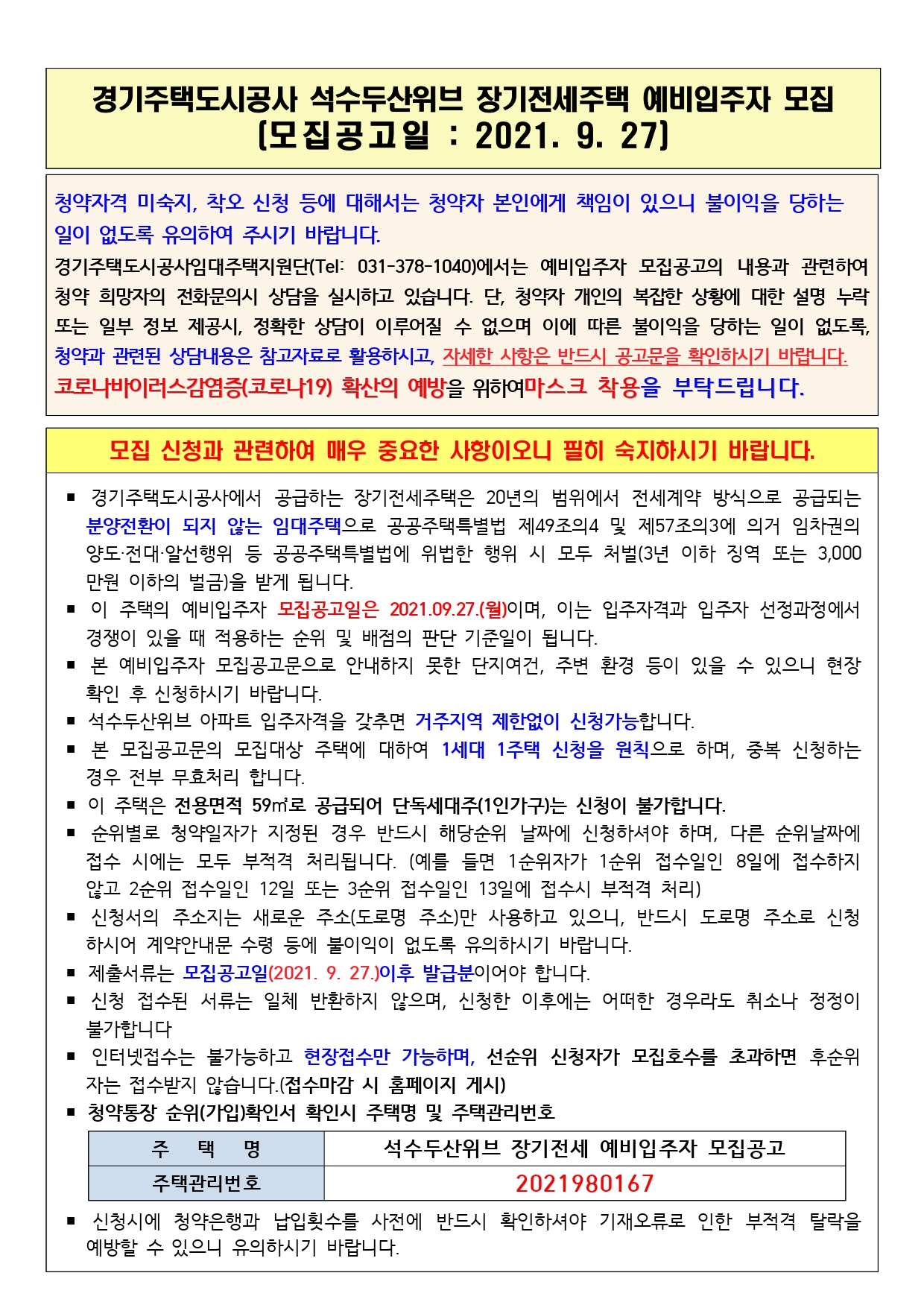 안양 석수두산위브 장기전세 예비입주자 모집공고(21.9.27)입니다.