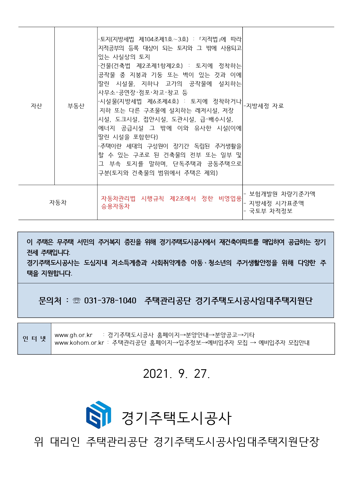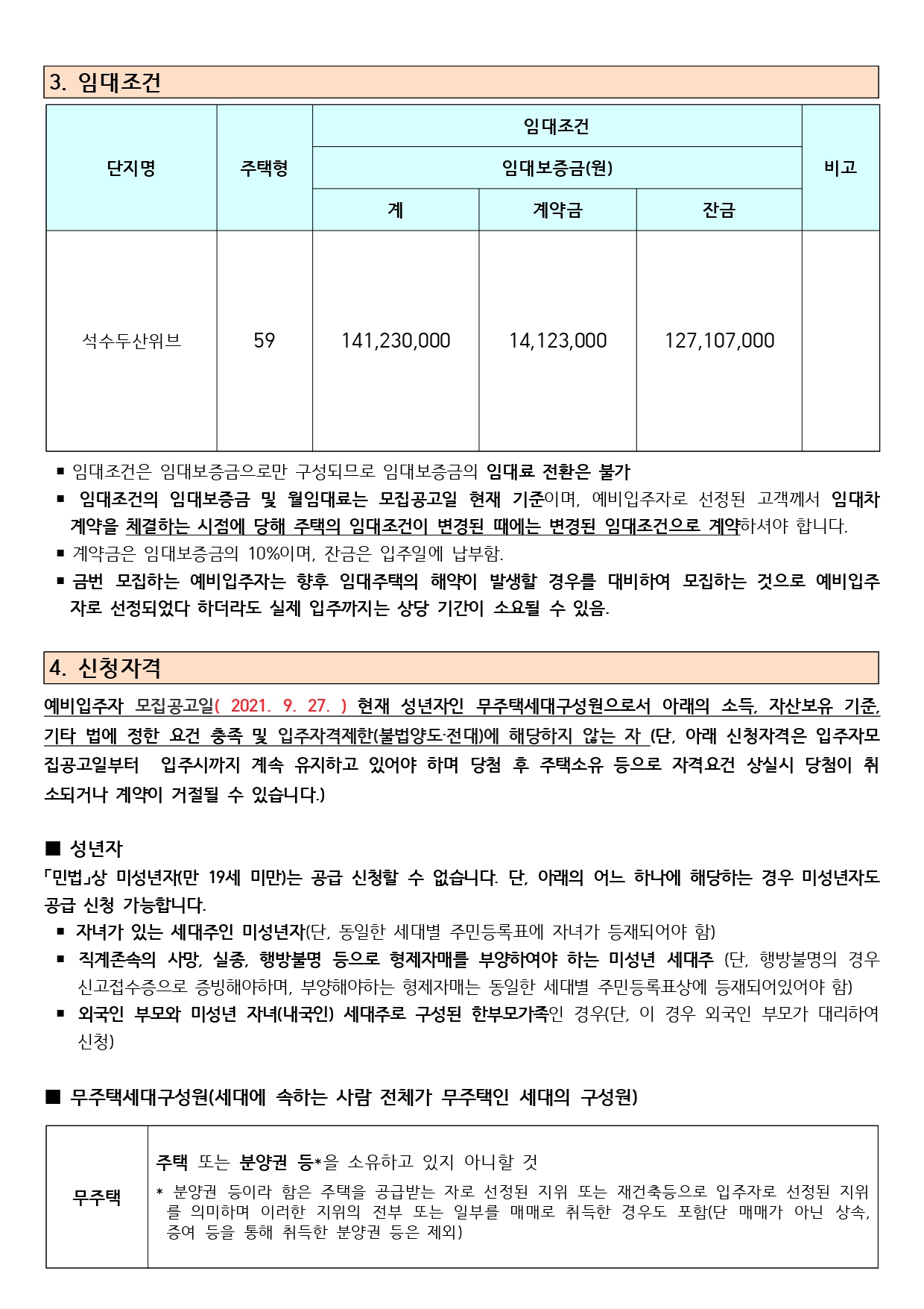 ▪ 이 주택의 예비입주자 모집공고일은 2021.09.27.(월)이며, 이는 입주자격과 입주자 선정과정에서 경쟁이 있을 때 적용하는 순위 및 배점의 판단 기준일이 됩니다.
