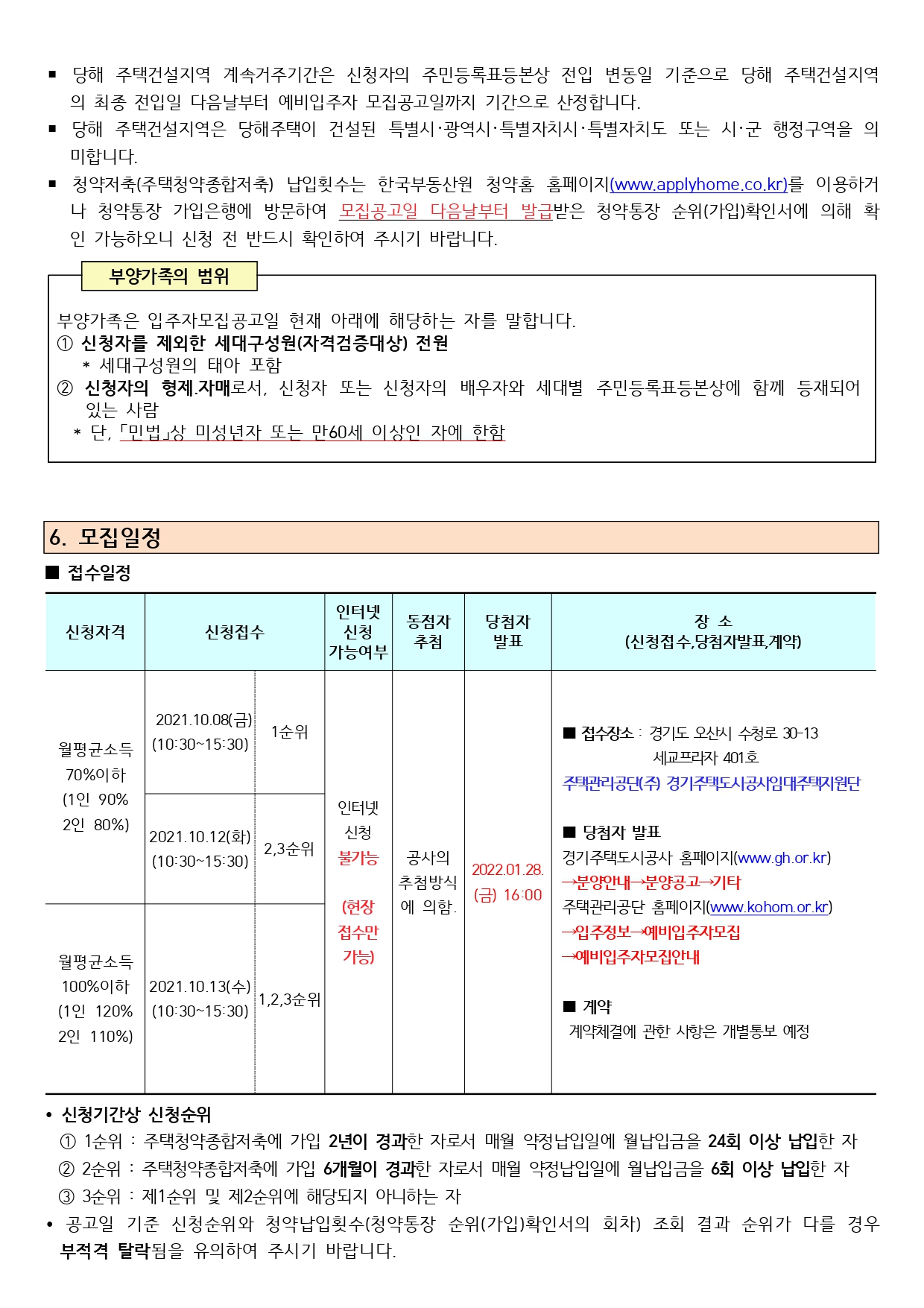 ▪ 순위별로 청약일자가 지정된 경우 반드시 해당순위 날짜에 신청하셔야 하며, 다른 순위날짜에 접수 시에는 모두 부적격 처리됩니다. (예를 들면 1순위자가 1순위 접수일인 8일에 접수하지 않고 2순위 접수일인 12일 또는 3순위 접수일인 13일에 접수시 부적격 처리)