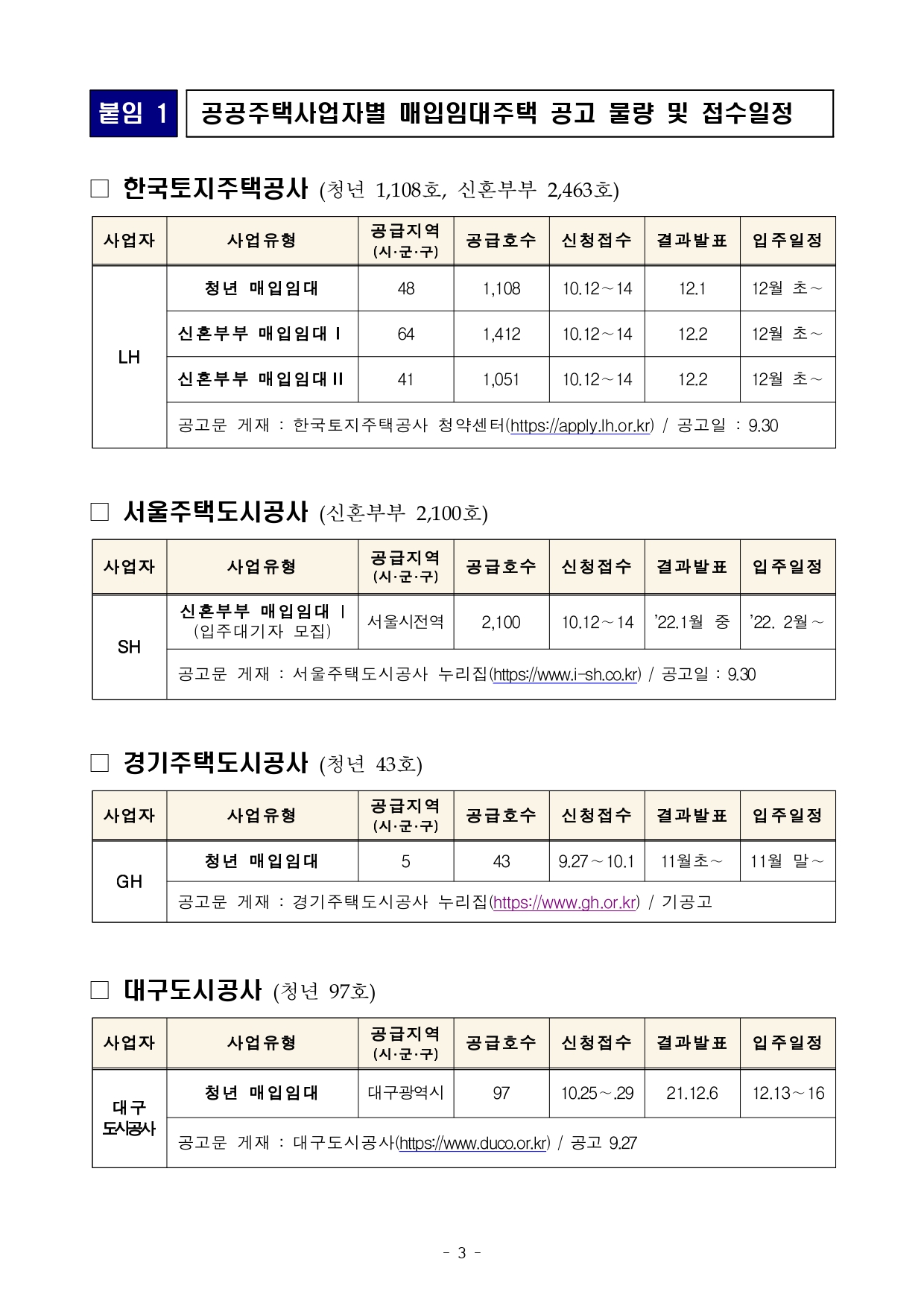 아울러, 서울주택도시공사, 경기주택도시공사, 대구도시공사가 모집하는 청년·신혼부부 매입임대주택(2,240호)에 대한 구체적인 입주자격 등은 해당 기관 누리집(붙임 참조)에 게시된 공고문에서 확인할 수 있다.