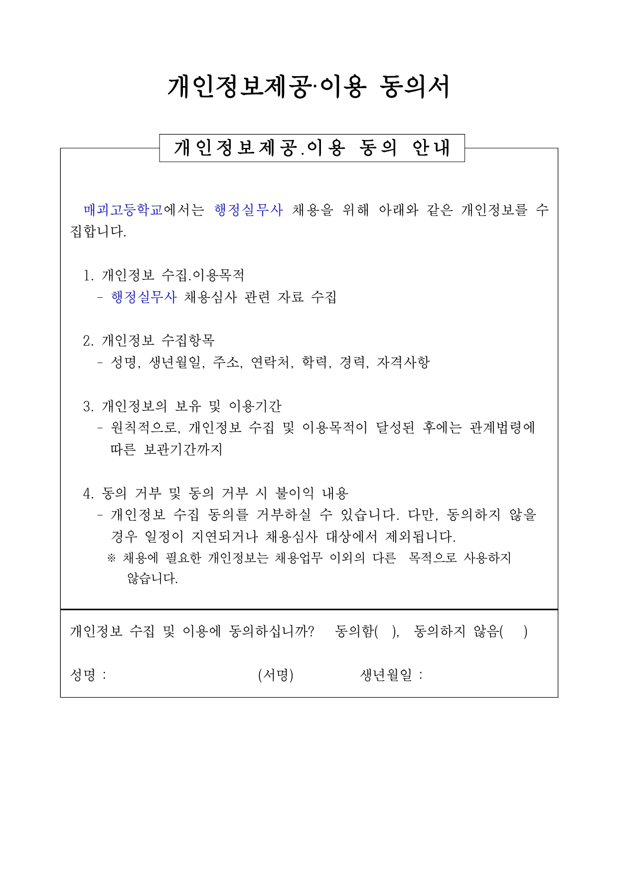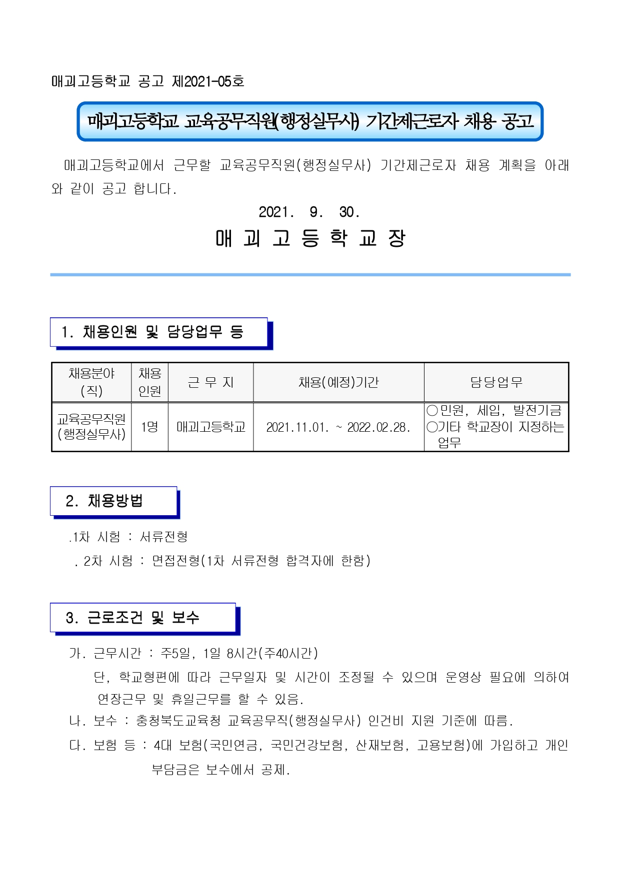 매괴고등학교에서 근무할 교육공무직원(행정실무사) 기간제근로자 채용 계획을 아래와 같이 공고 합니다.