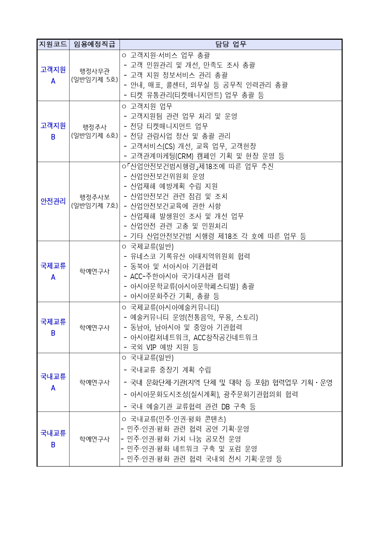 학예연구사 | 3명 | ㅇ 아시아문화 연구도서 발간 및 배포 ㅇ 문화자원 활용 콘텐츠 개발 협력 등 |