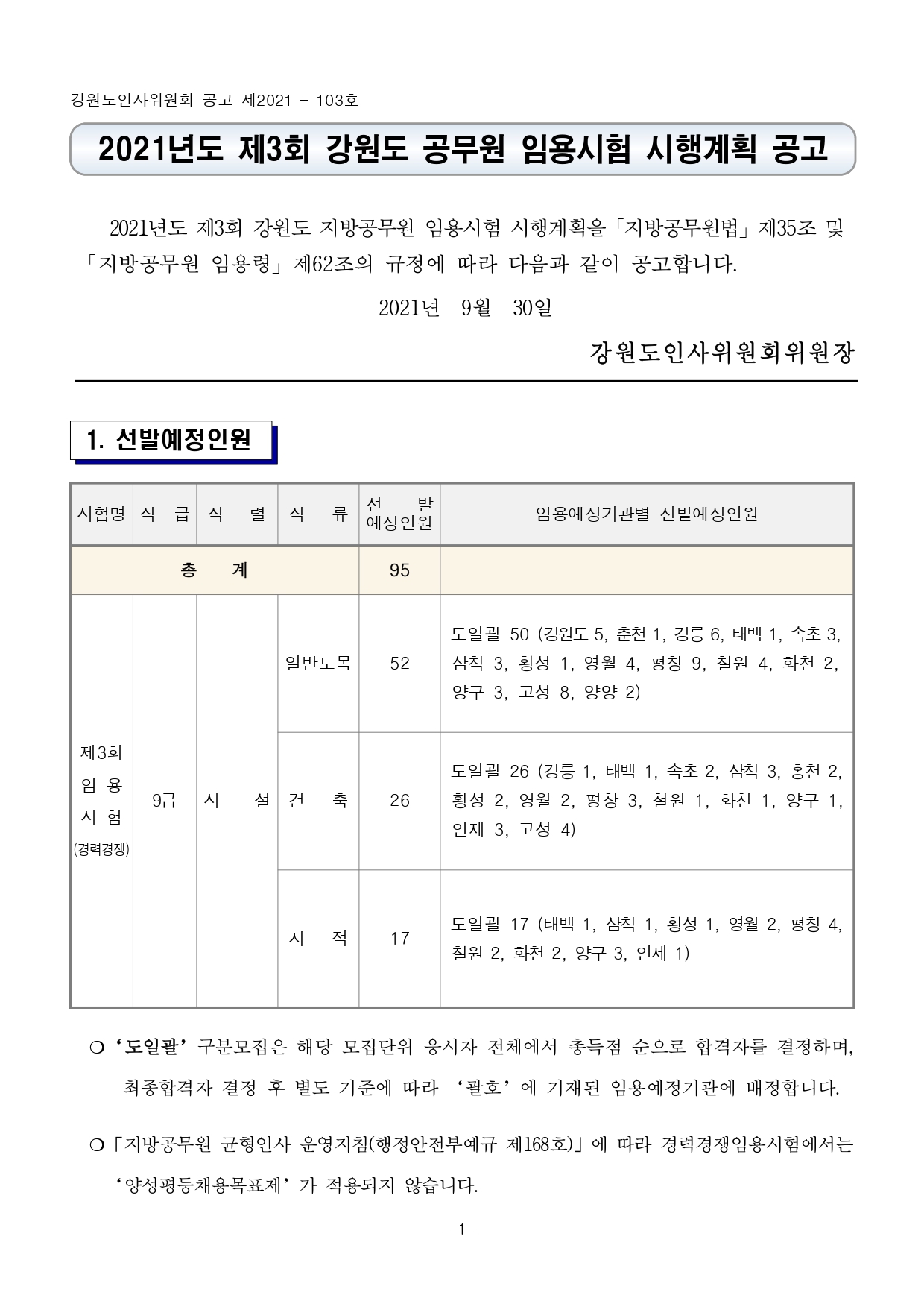 2021년도 제3회 강원도 지방공무원 임용시험 시행계획을「지방공무원법」제35조 및 「지방공무원 임용령」제62조의 규정에 따라 다음과 같이 공고합니다. 2021년 9월 30일 강원도인사위원회위원장.