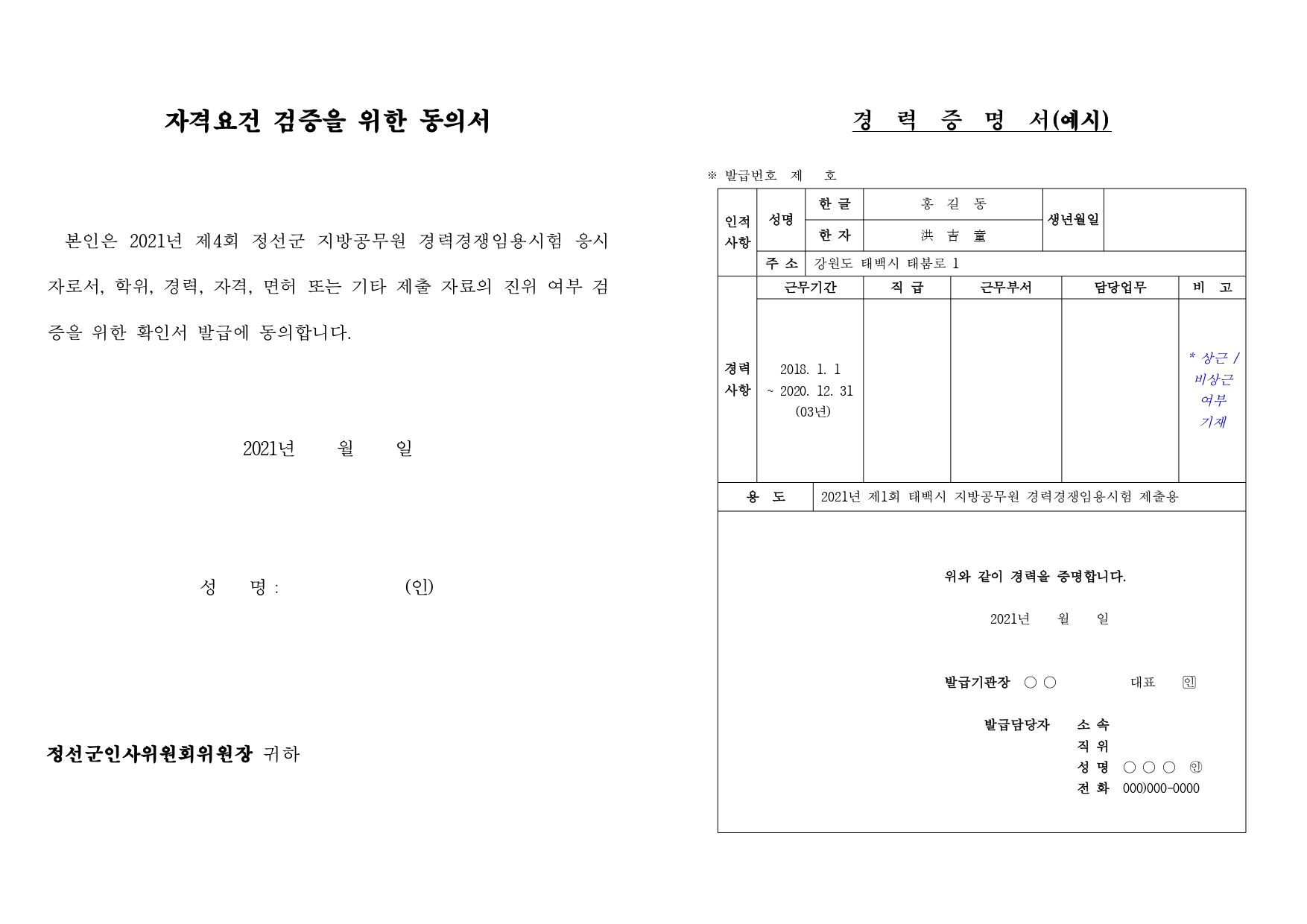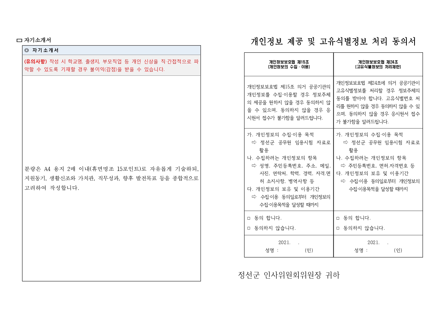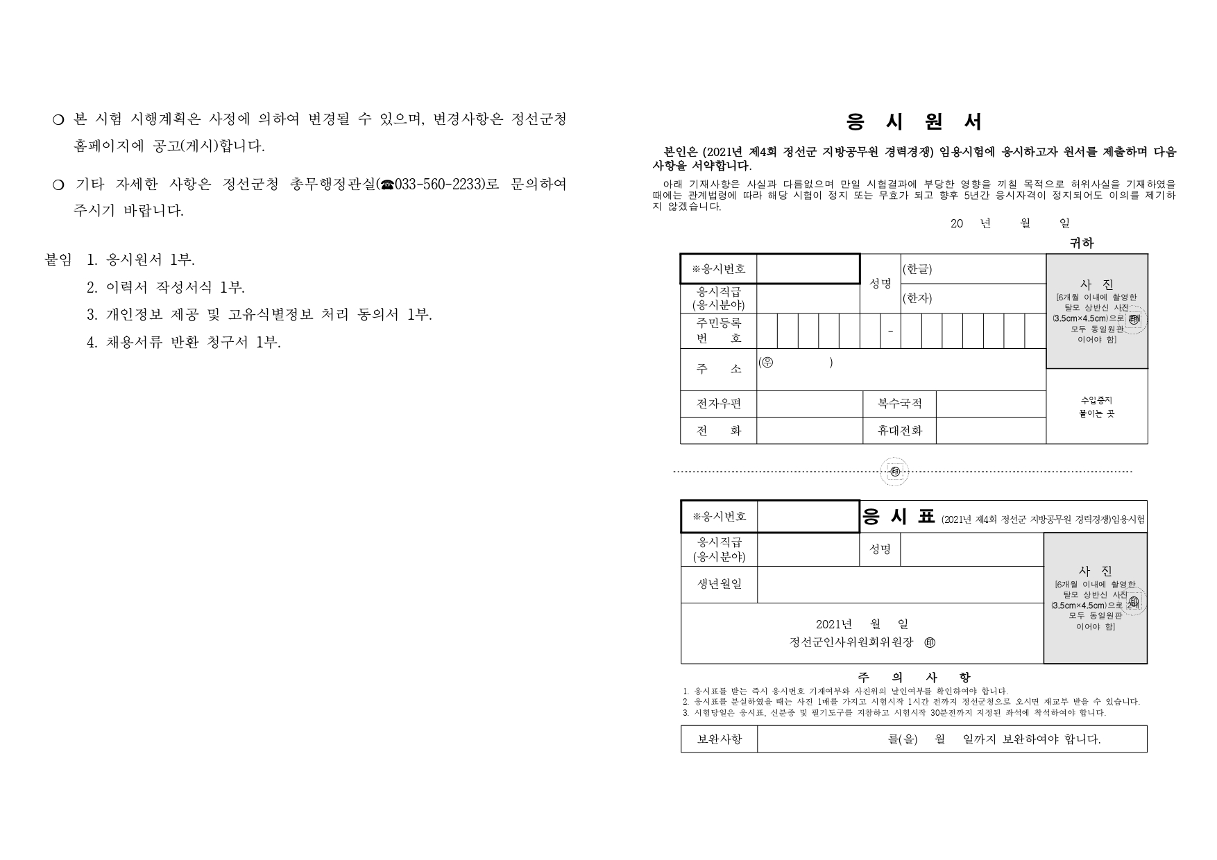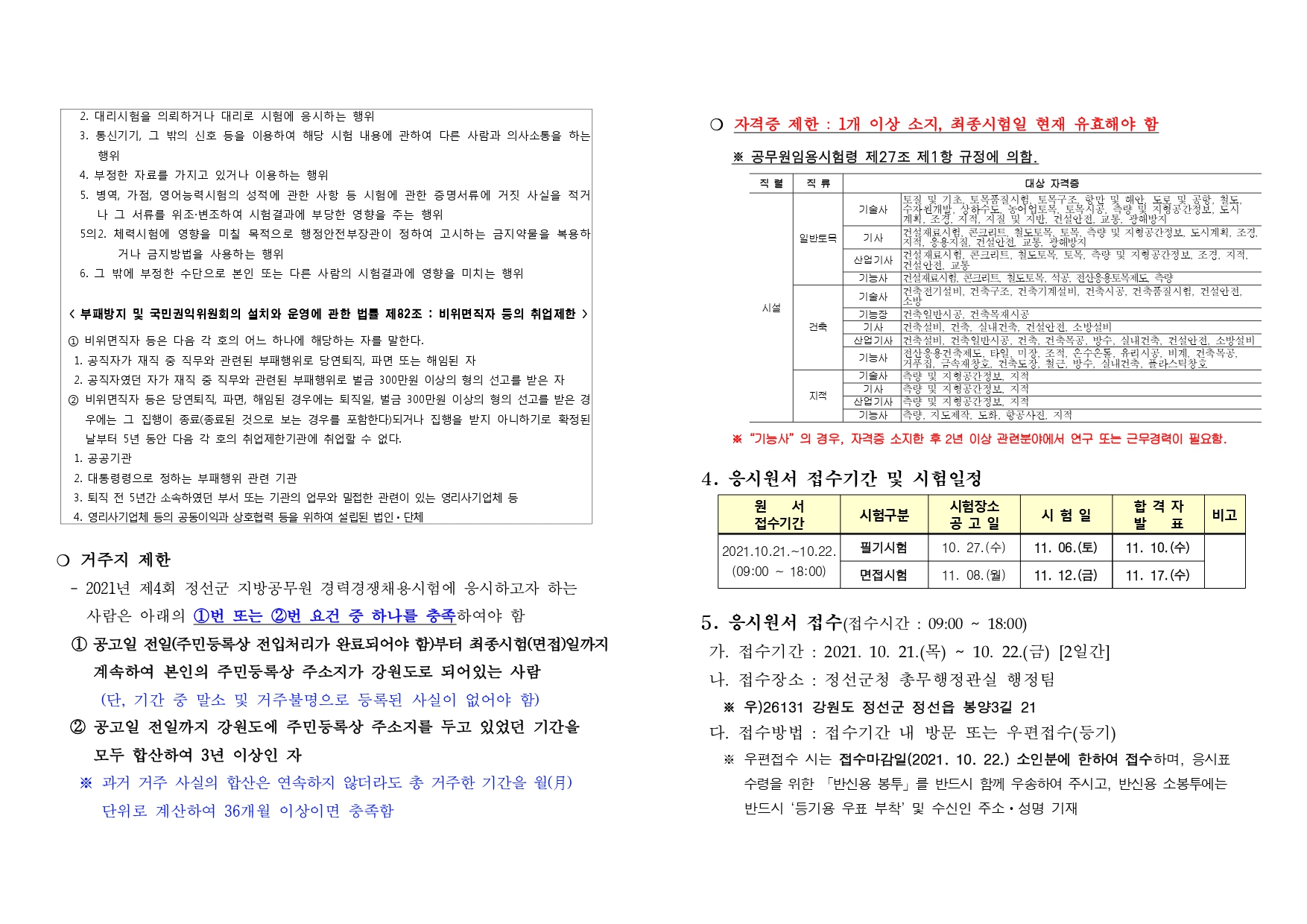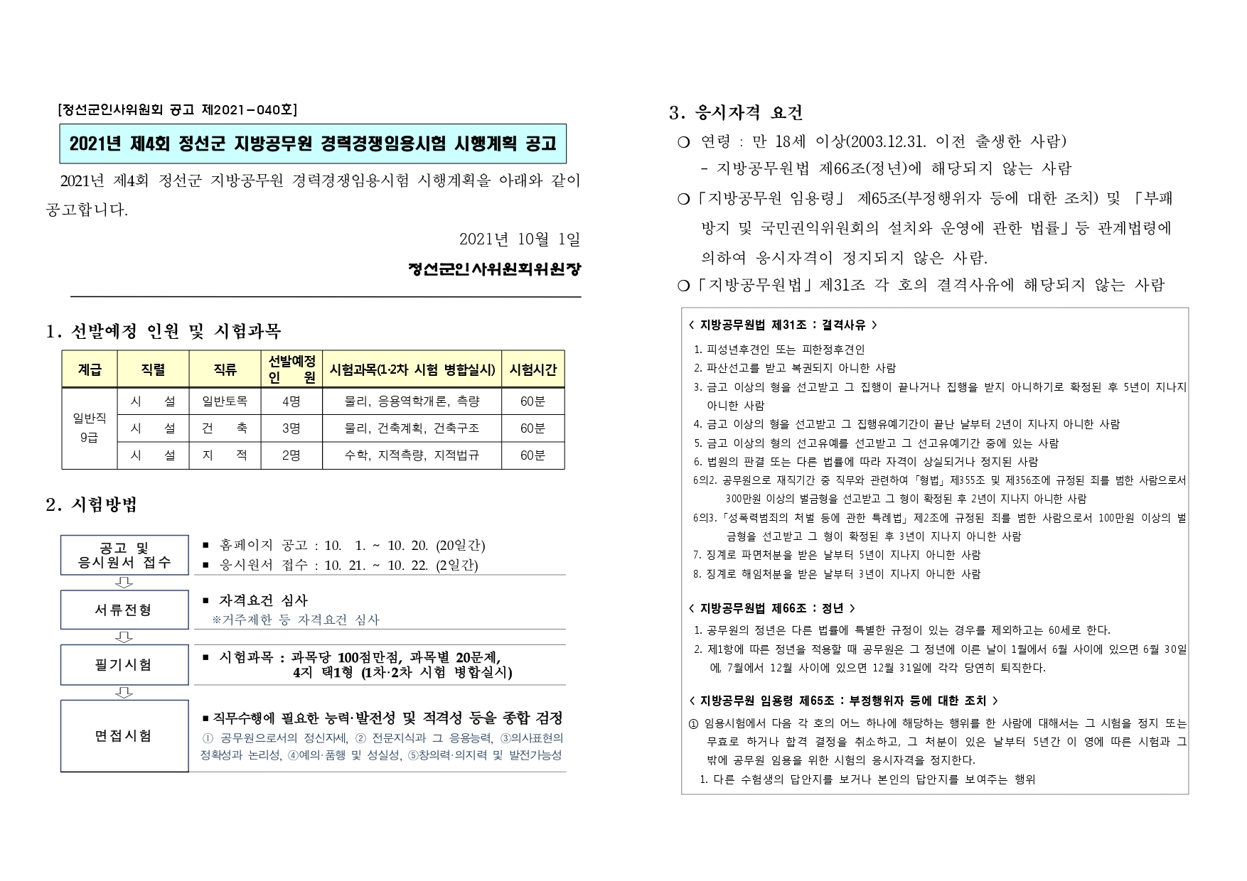 2021년 제4회 정선군 지방공무원 경력경쟁임용시험 시행계획 공고(10.1)입니다.