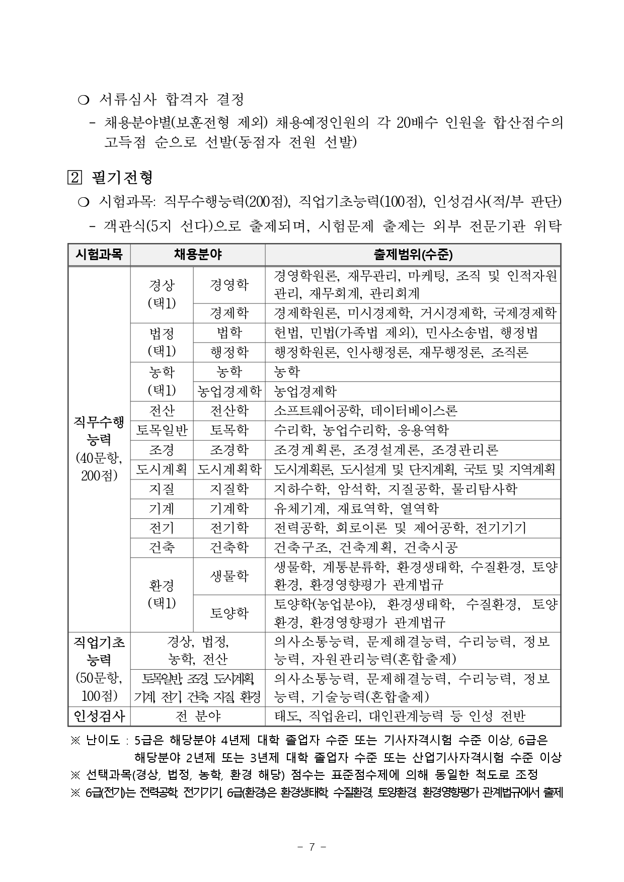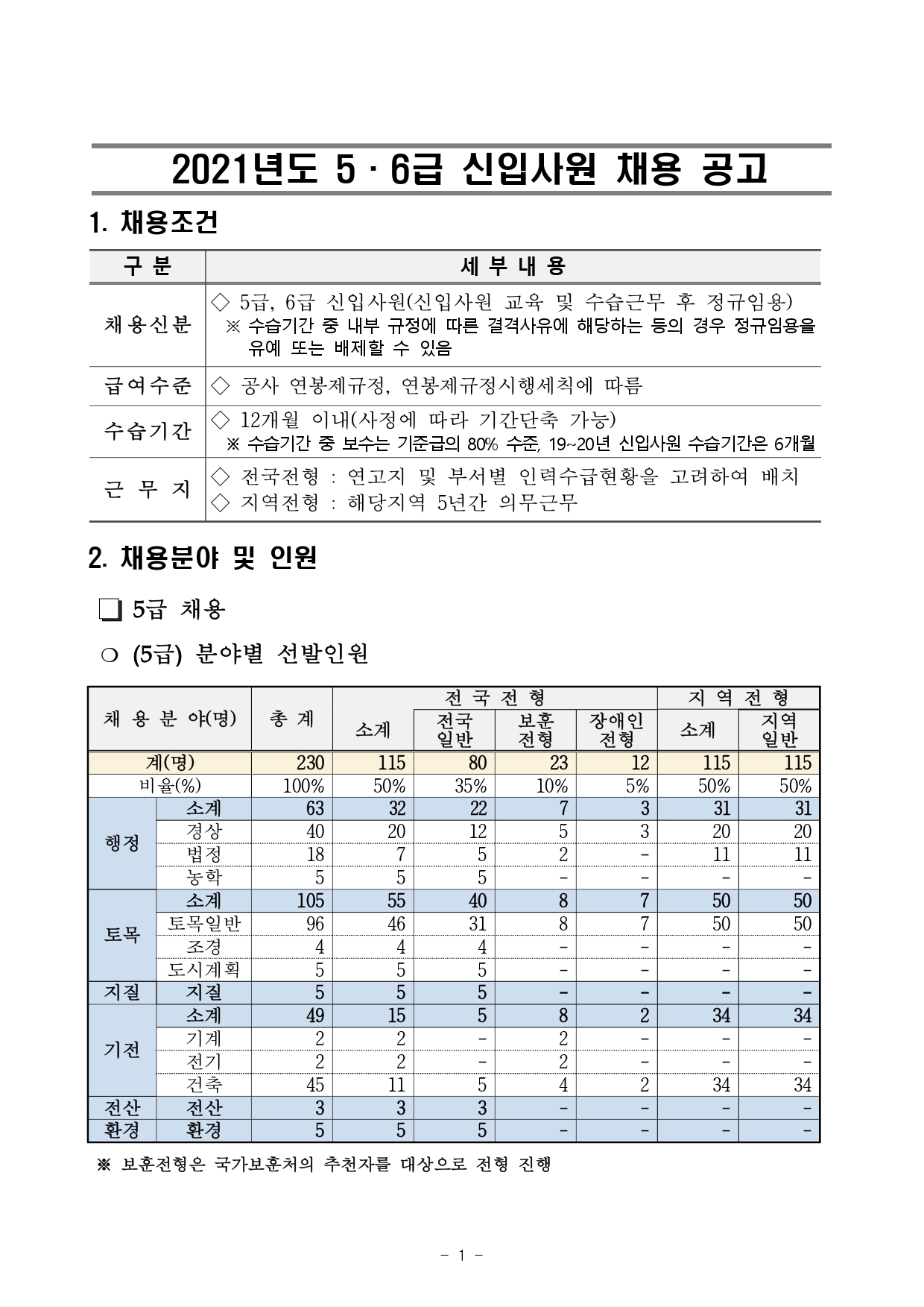 2. 채용분야 : (5급) 행정, 토목, 지질, 기전, 전산, 환경, (6급) 토목, 기전, 환경