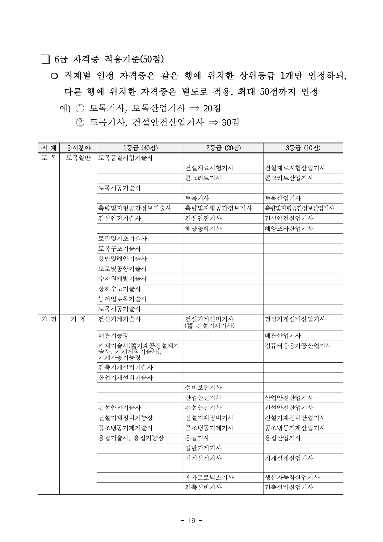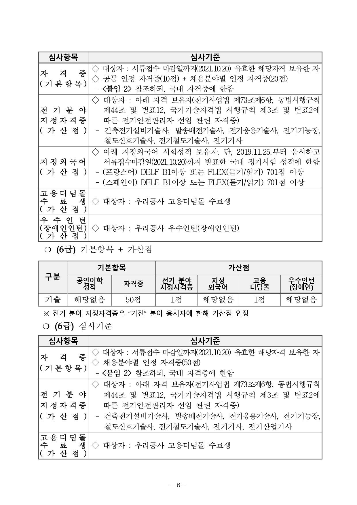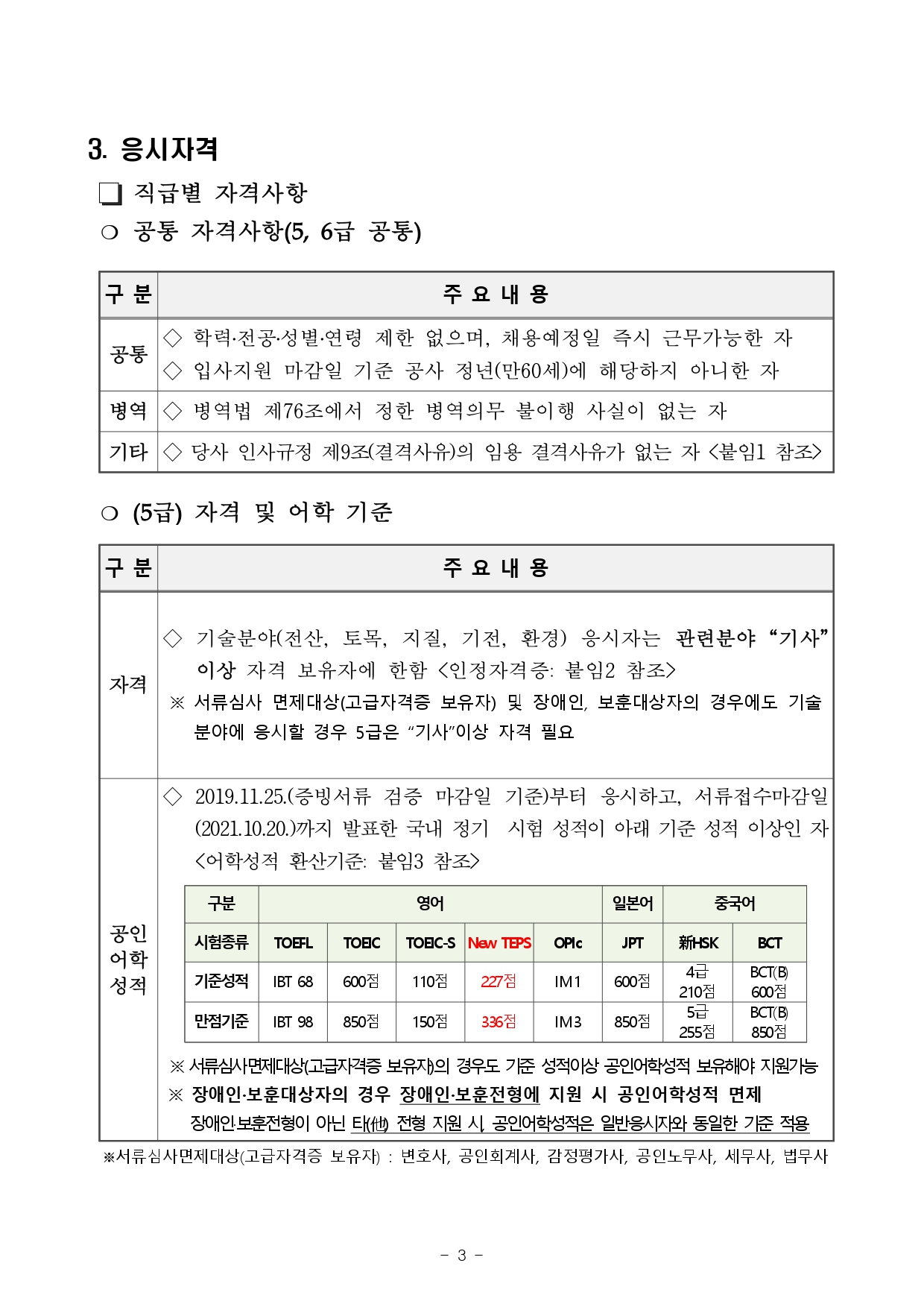 - 자격 : 기술분야 5급(전산, 토목, 지질, 기전, 환경) 응시자는 관련분야 “기사”이상 자격 보유자, 기술분야 6급(토목, 기전, 환경) 응시자는 관련분야 "산업기사" 이상 자격 보유자에 한함.