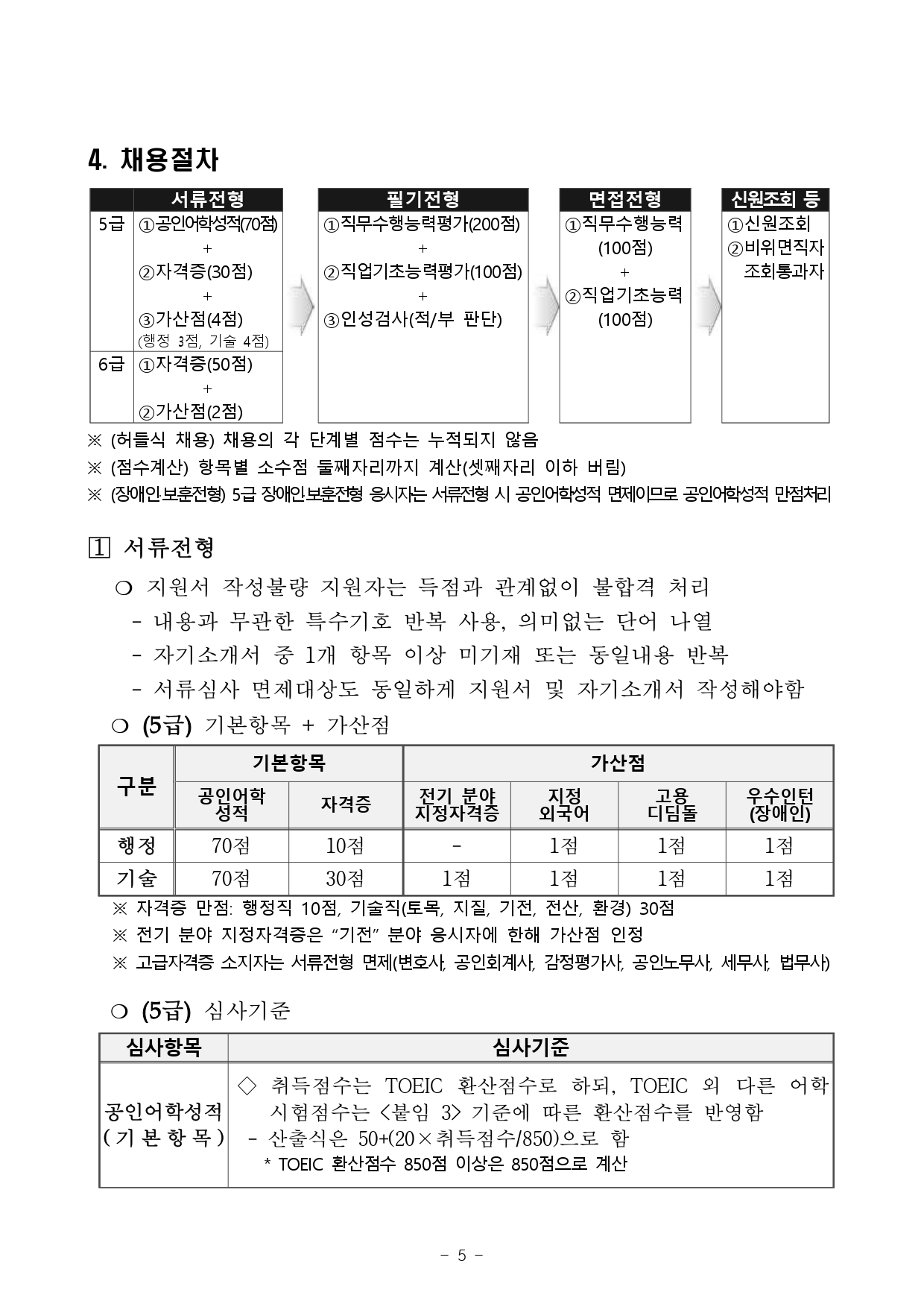 1) 서류전형 : 5급 ①공인어학성적(70점) + ②자격증(30점) + ③가산점(4점) 6급 ①자격증(50점) + 가산점(2점)