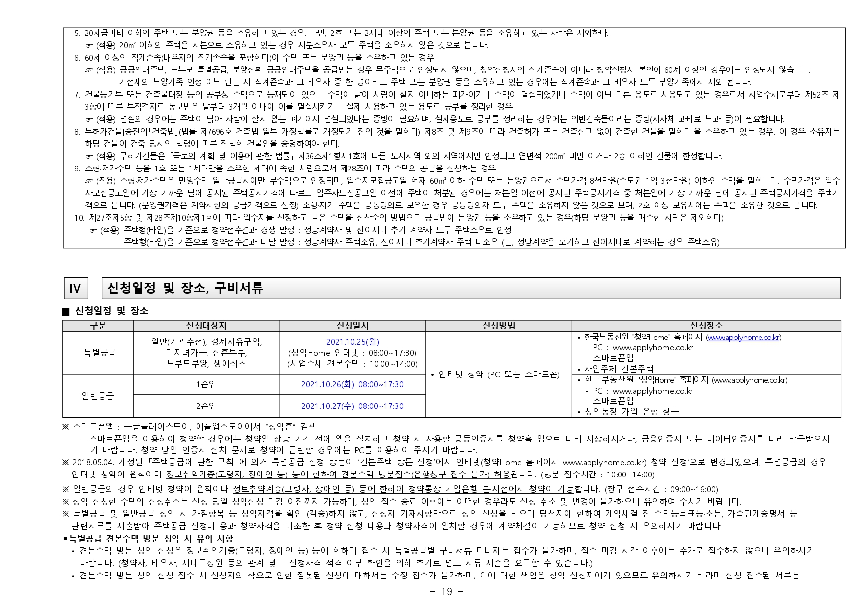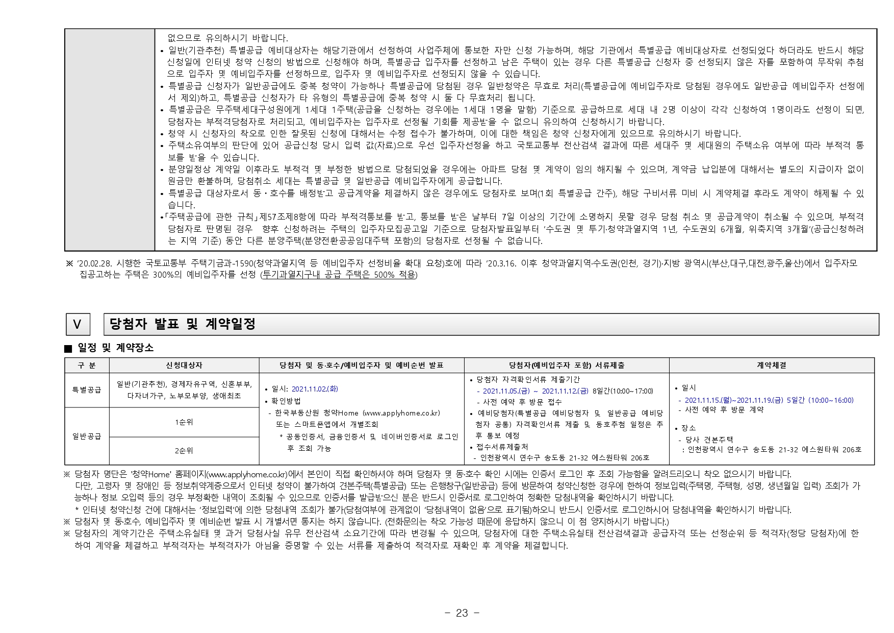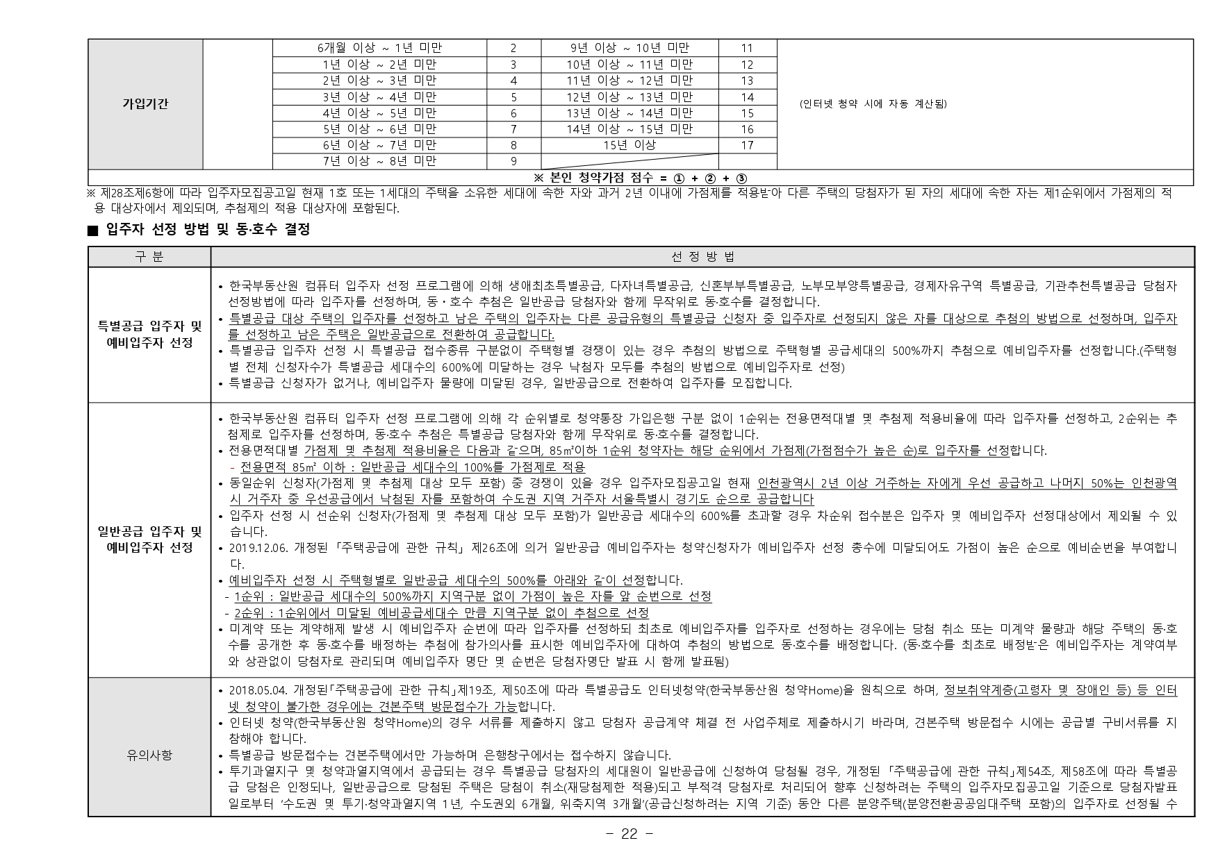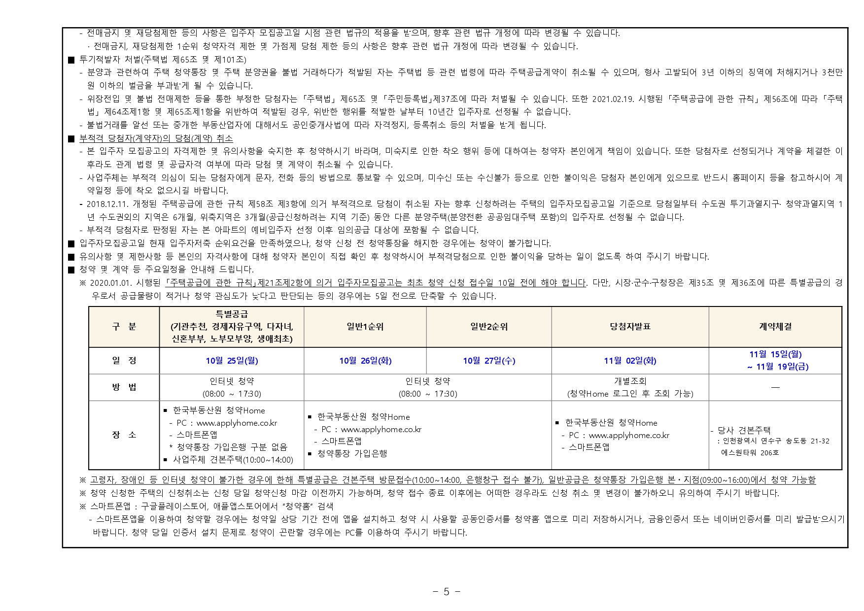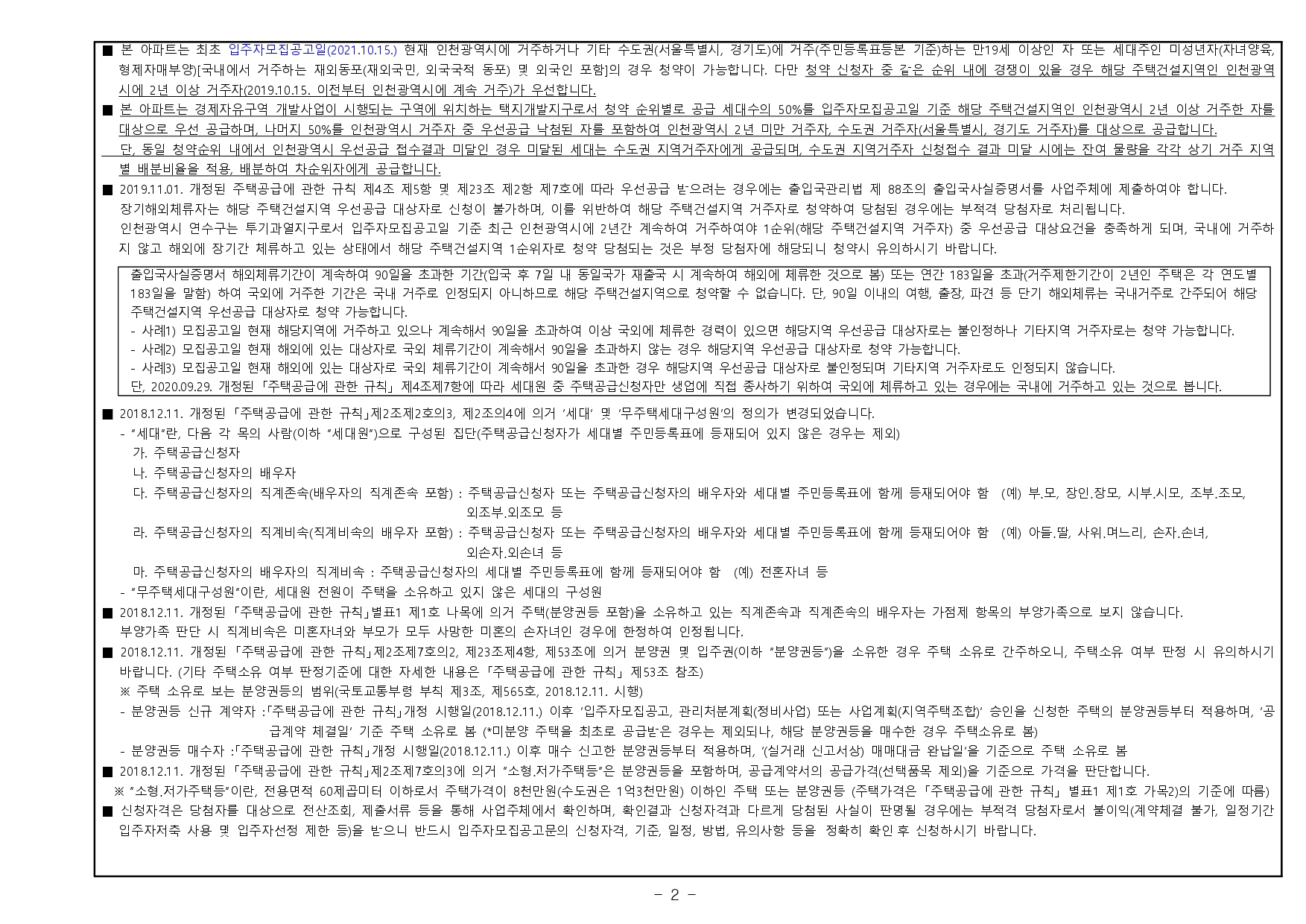 ■ 2019.11.01. 개정된 주택공급에 관한 규칙 제4조 제5항 및 제23조 제2항 제7호에 따라 우선공급 받으려는 경우에는 출입국관리법 제 88조의 출입국사실증명서를 사업주체에 제출하여야 합니다. 장기해외체류자는 해당 주택건설지역 우선공급 대상자로 신청이 불가하며, 이를 위반하여 해당 주택건설지역 거주자로 청약하여 당첨된 경우에는 부적격 당첨자로 처리됩니다. 인천광역시 연수구는 투기과열지구로서 입주자모집공고일 기준 최근 인천광역시에 2년간 계속하여 거주하여야 1순위(해당 주택건설지역 거주자) 중 우선공급 대상요건을 충족하게 되며, 국내에 거주하 지 않고 해외에 장기간 체류하고 있는 상태에서 해당 주택건설지역 1순위자로 청약 당첨되는 것은 부정 당첨자에 해당되니 청약시 유의하시기 바랍니다. |