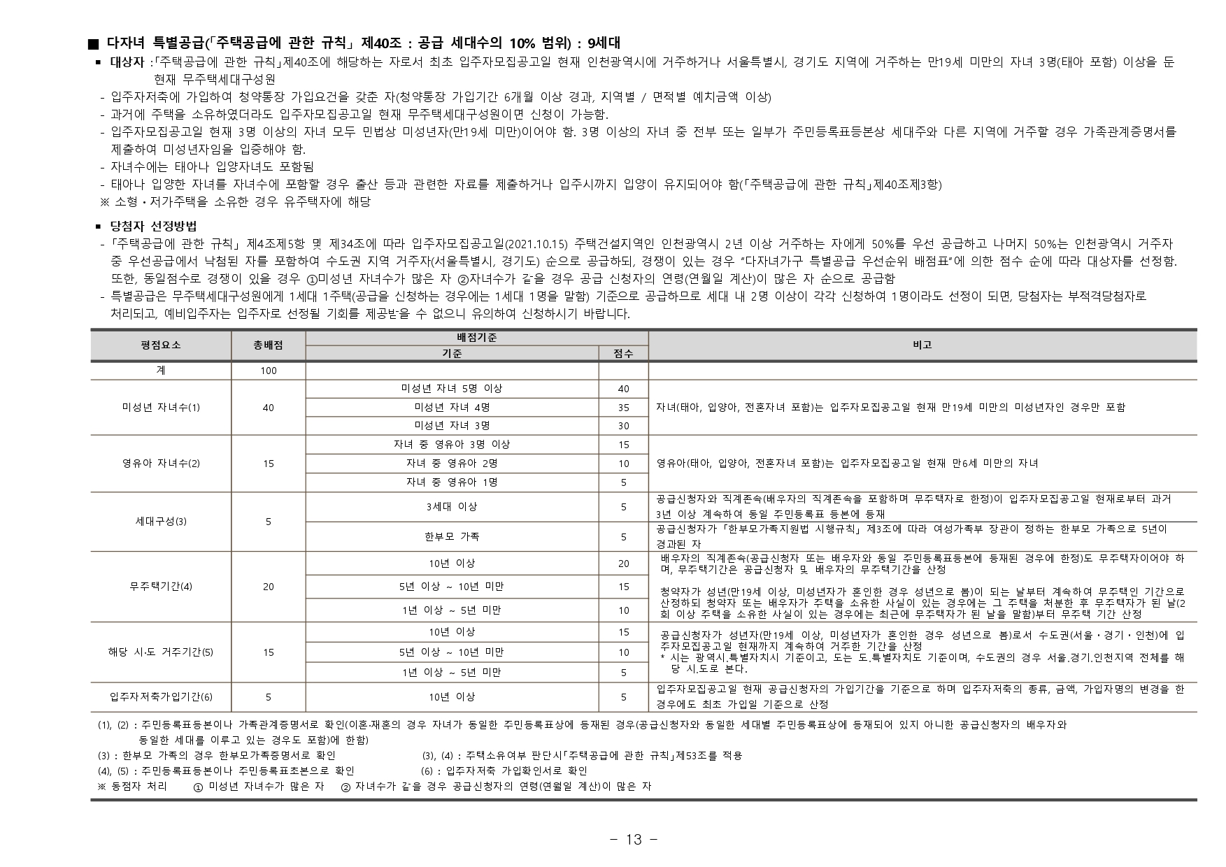 | ■ 본 아파트는 최초 입주자모집공고일(2021.10.15.) 현재 인천광역시에 거주하거나 기타 수도권(서울특별시, 경기도)에 거주(주민등록표등본 기준)하는 만19세 이상인 자 또는 세대주인 미성년자(자녀양육, 형제자매부양)[국내에서 거주하는 재외동포(재외국민, 외국국적 동포) 및 외국인 포함]의 경우 청약이 가능합니다. 다만 청약 신청자 중 같은 순위 내에 경쟁이 있을 경우 해당 주택건설지역인 인천광역 시에 2년 이상 거주자(2019.10.15. 이전부터 인천광역시에 계속 거주)가 우선합니다. ■ 본 아파트는 경제자유구역 개발사업이 시행되는 구역에 위치하는 택지개발지구로서 청약 순위별로 공급 세대수의 50%를 입주자모집공고일 기준 해당 주택건설지역인 인천광역시 2년 이상 거주한 자를 대상으로 우선 공급하며, 나머지 50%를 인천광역시 거주자 중 우선공급 낙첨된 자를 포함하여 인천광역시 2년 미만 거주자, 수도권 거주자(서울특별시, 경기도 거주자)를 대상으로 공급합니다. 단, 동일 청약순위 내에서 인천광역시 우선공급 접수결과 미달인 경우 미달된 세대는 수도권 지역거주자에게 공급되며, 수도권 지역거주자 신청접수 결과 미달 시에는 잔여 물량을 각각 상기 거주 지역별 배분비율을 적용, 배분하여 차순위자에게 공급합니다. |