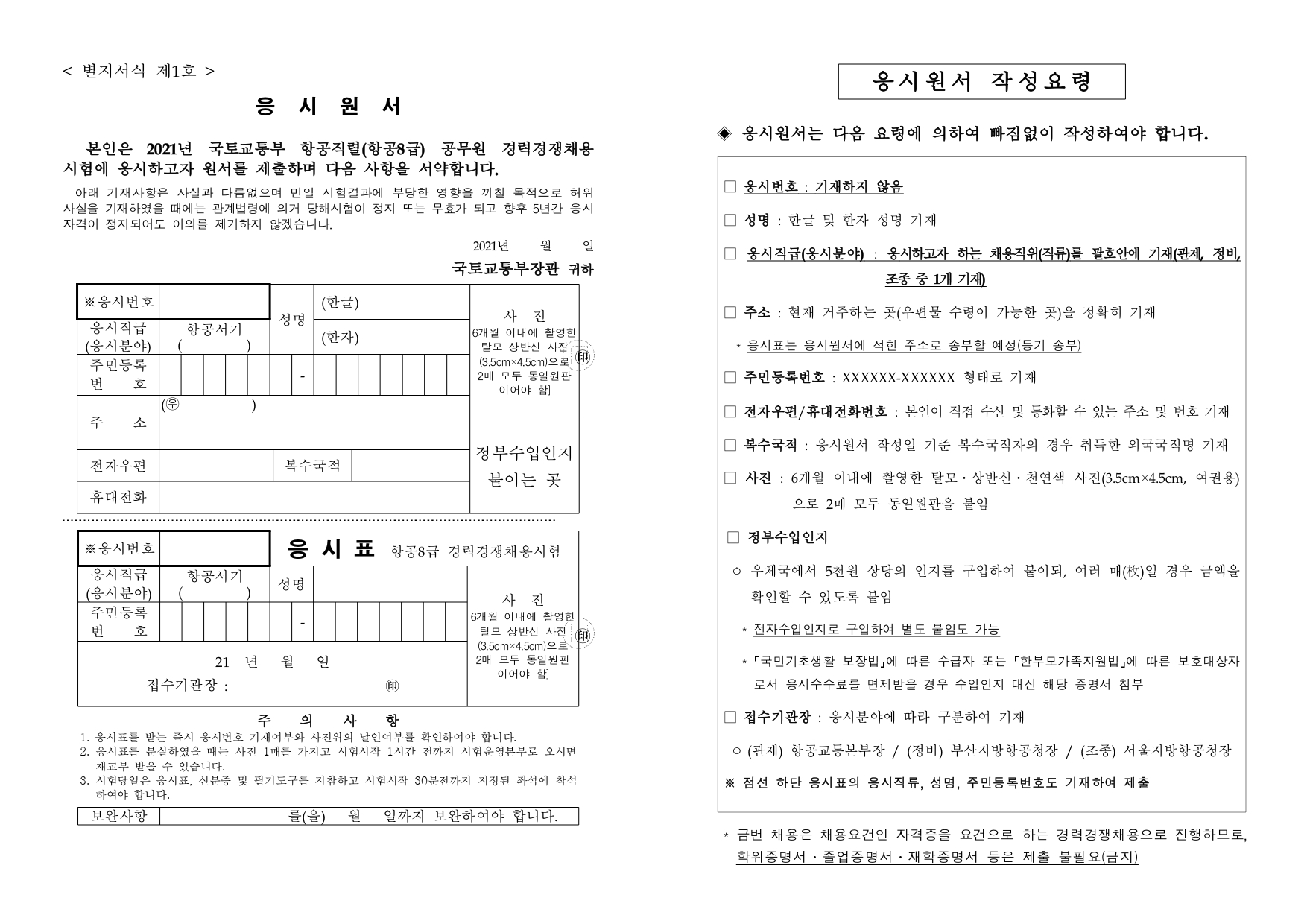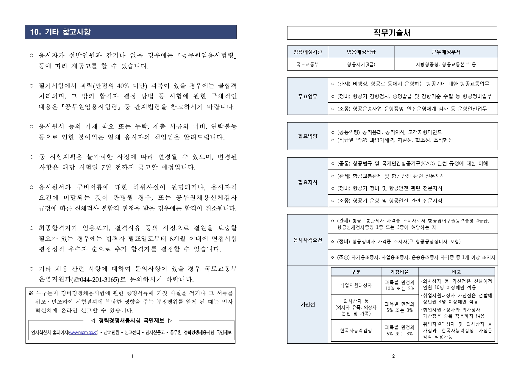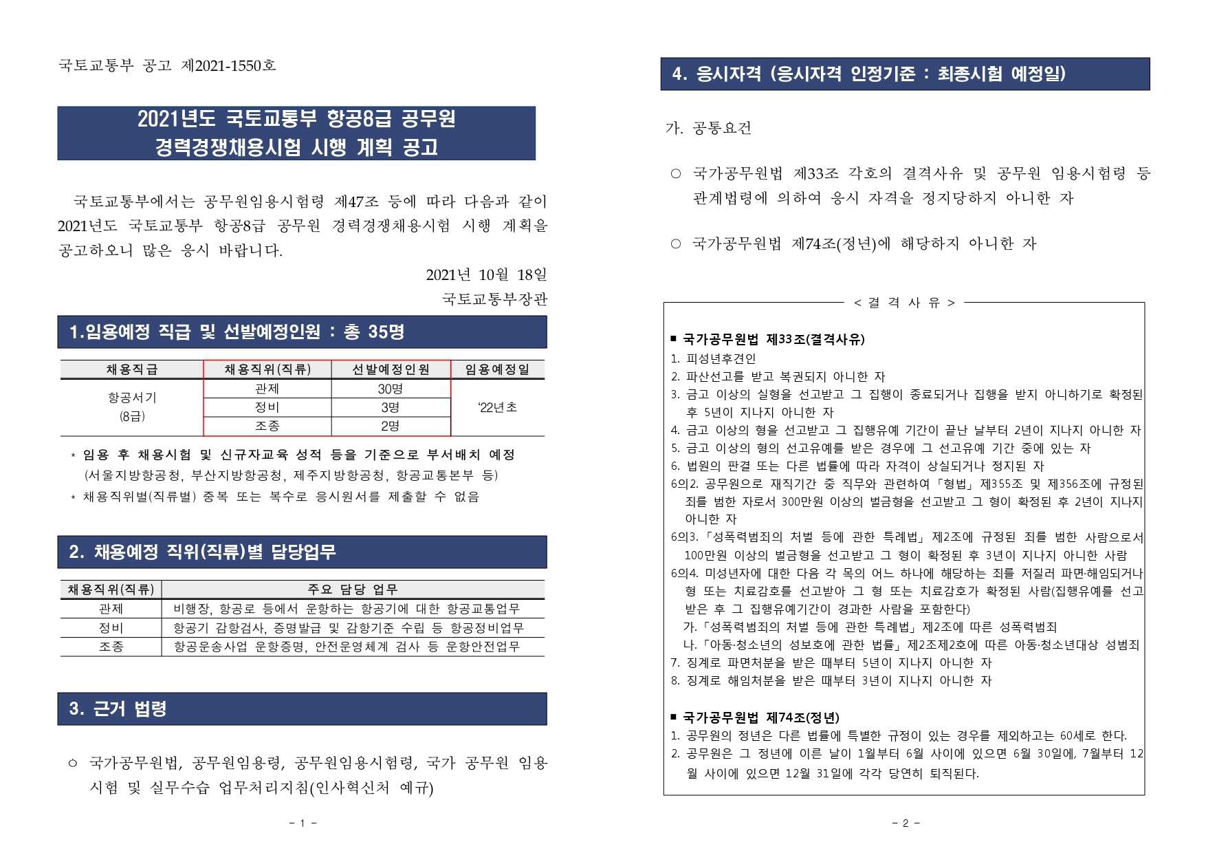 국토교통부에서는 공무원임용시험령 제47조 등에 따라 다음과 같이 2021년도 국토교통부 항공8급 공무원 경력경쟁채용시험 시행 계획을 공고하오니 많은 응시 바랍니다.