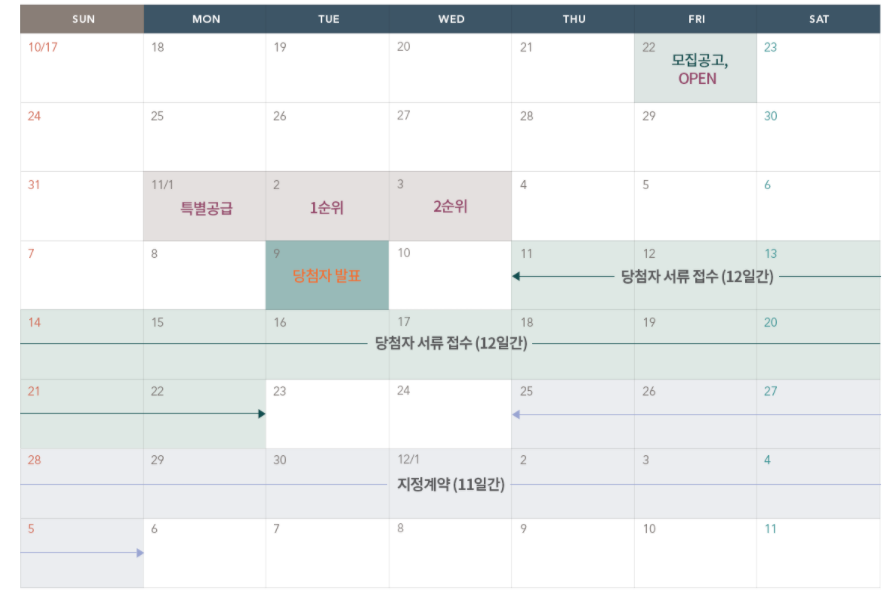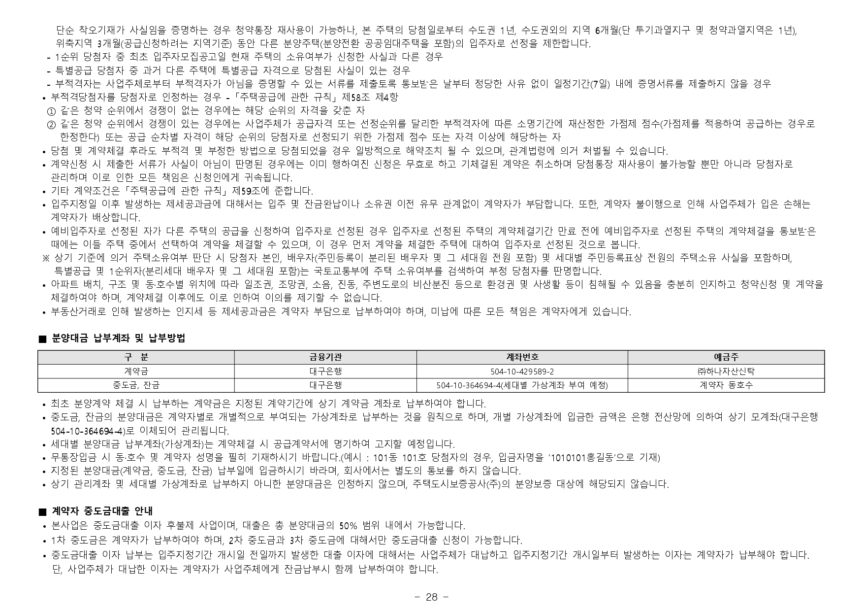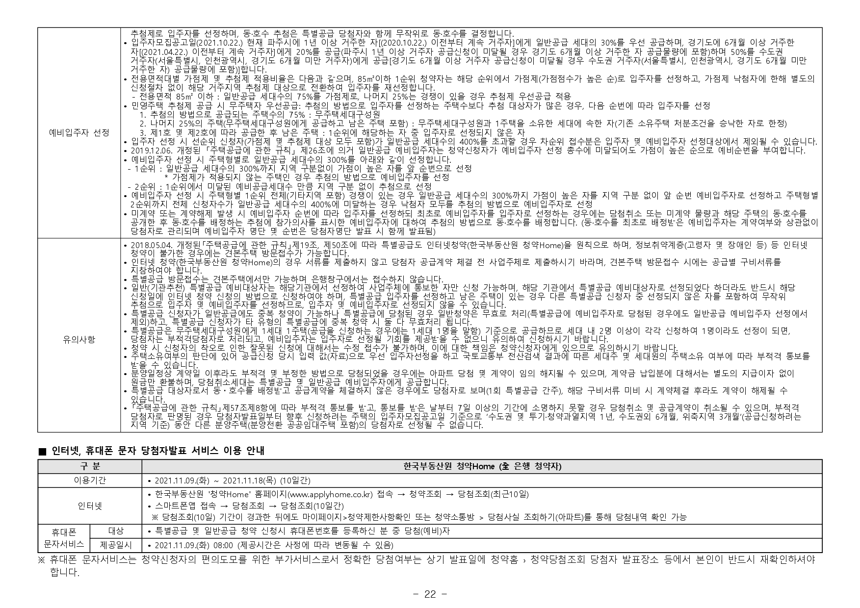 - 본 아파트의 당첨자로 선정 시 당첨자 및 세대에 속한 자는 당첨일로부터 향후 5년간 투기과열지구 및 청약과열지역에서 공급하는 주택의 1순위 청약접수가 제한되오니 유의하시기 바랍니다