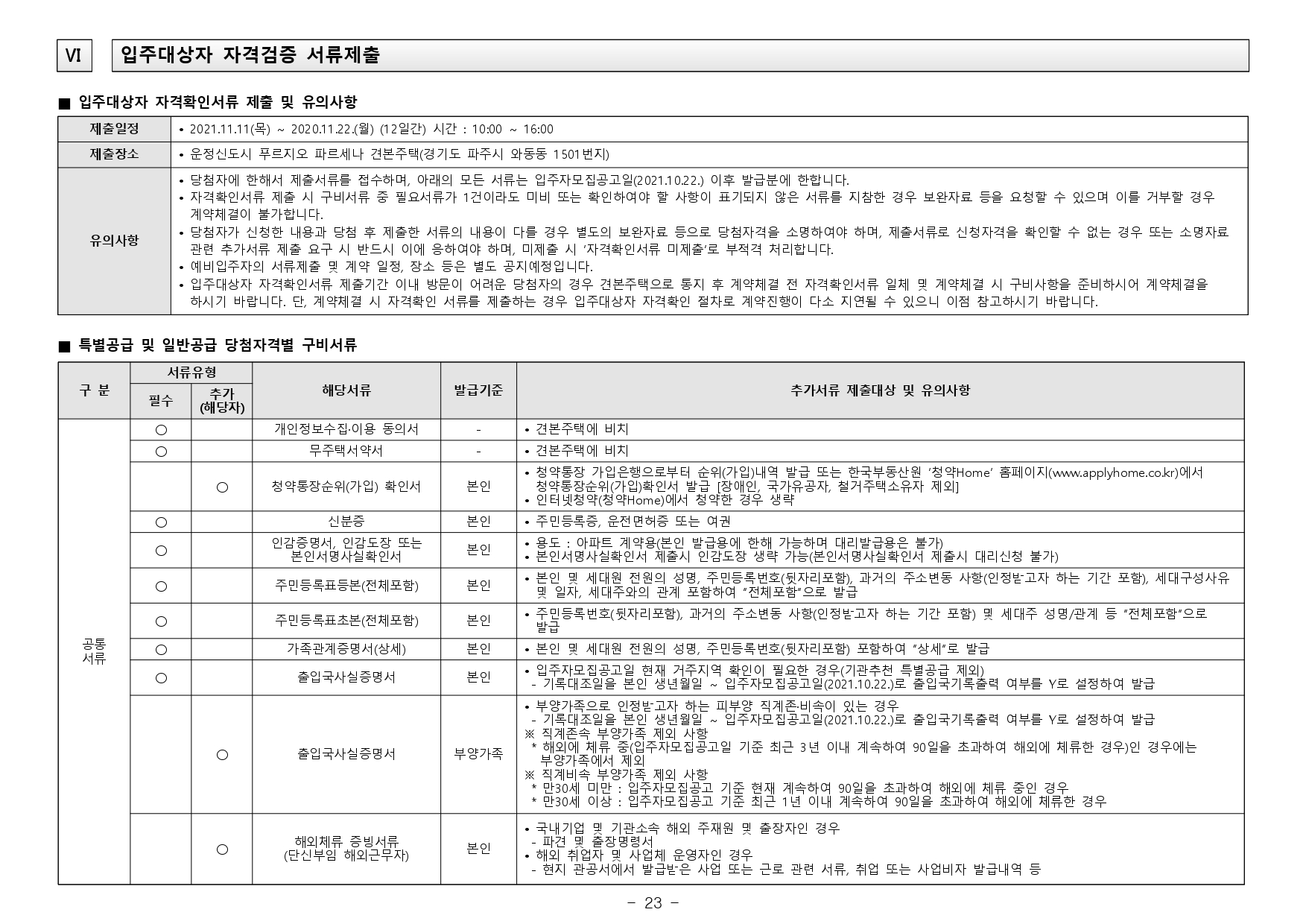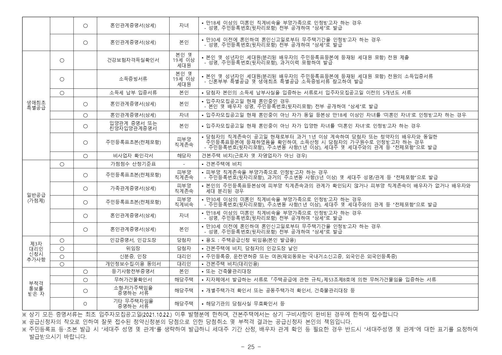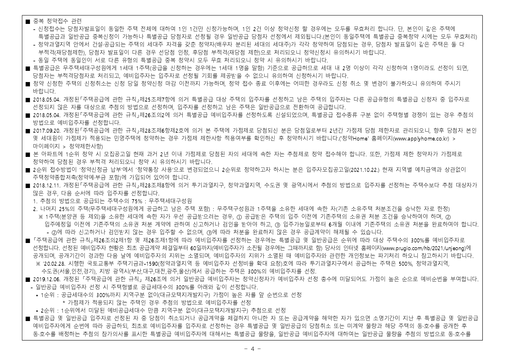 - 2019.11.01. 개정된 「주택공급에 관한 규칙」 제4조제5항 및 제23조제2항제7호에 따라 우선공급 받으려는 경우에는「출입국관리법」제88조의 출입국사실증명서를 사업주체에 제출해야 합니다. 장기해외체류자는 해당 주택건설지역 우선공급 대상자로 신청이 불가하며, 이를 위반하여 해당 주택건설지역 거주자로 청약하여 당첨된 경우에는 부적격 당첨자로 처리됩니다.