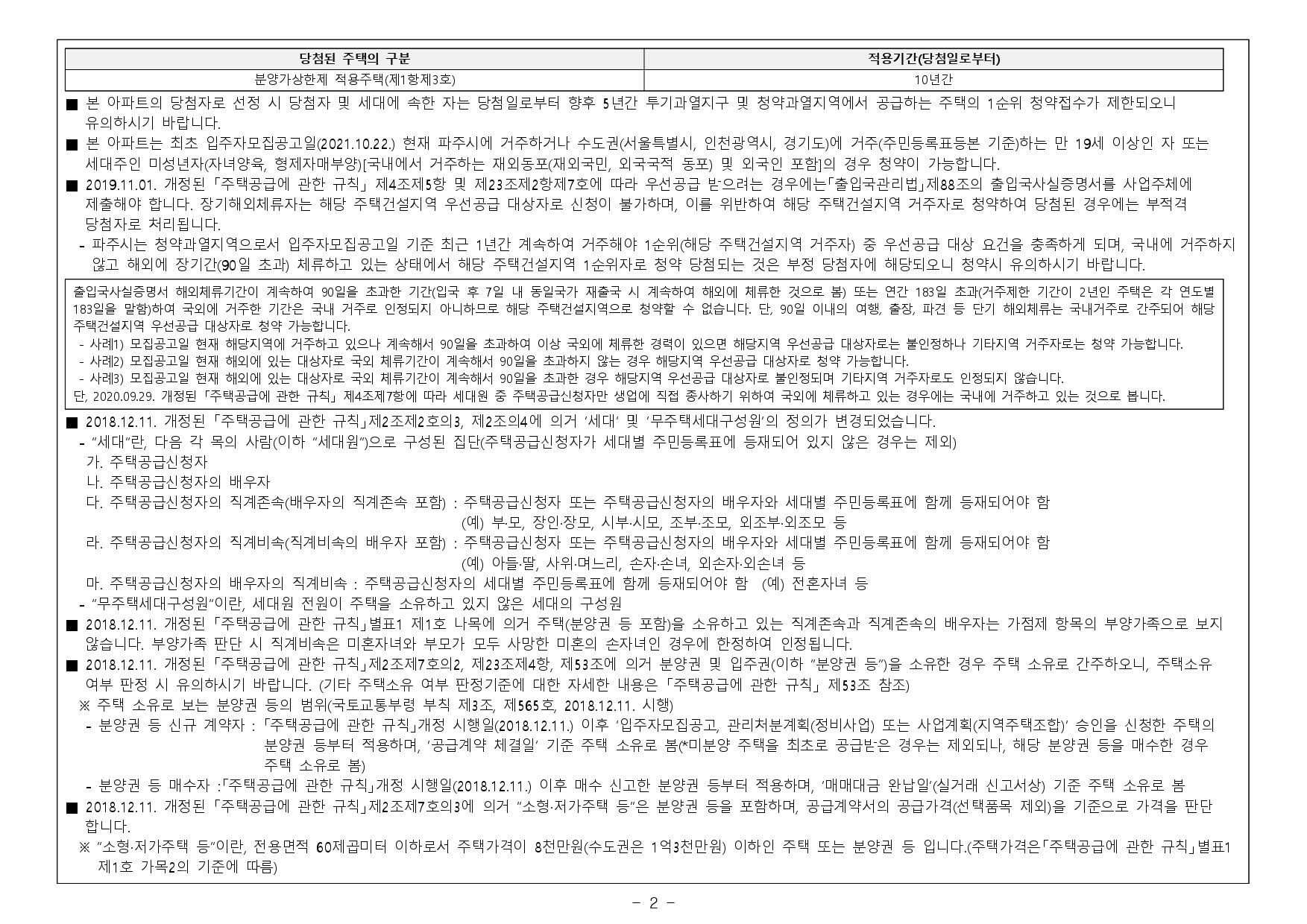 - 2019.11.01. 개정된 「주택공급에 관한 규칙」 제4조제5항 및 제23조제2항제7호에 따라 우선공급 받으려는 경우에는「출입국관리법」제88조의 출입국사실증명서를 사업주체에 제출해야 합니다. 장기해외체류자는 해당 주택건설지역 우선공급 대상자로 신청이 불가하며, 이를 위반하여 해당 주택건설지역 거주자로 청약하여 당첨된 경우에는 부적격 당첨자로 처리됩니다.