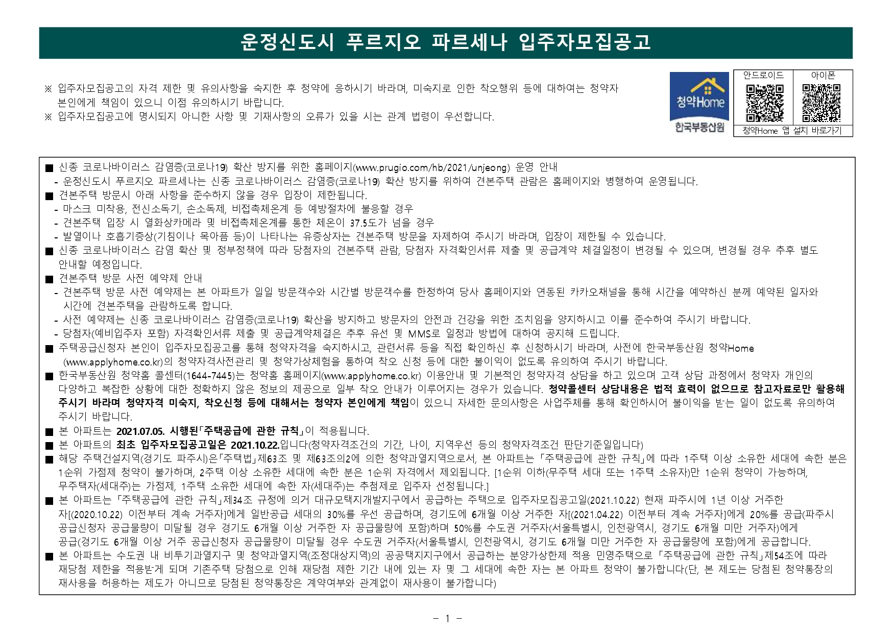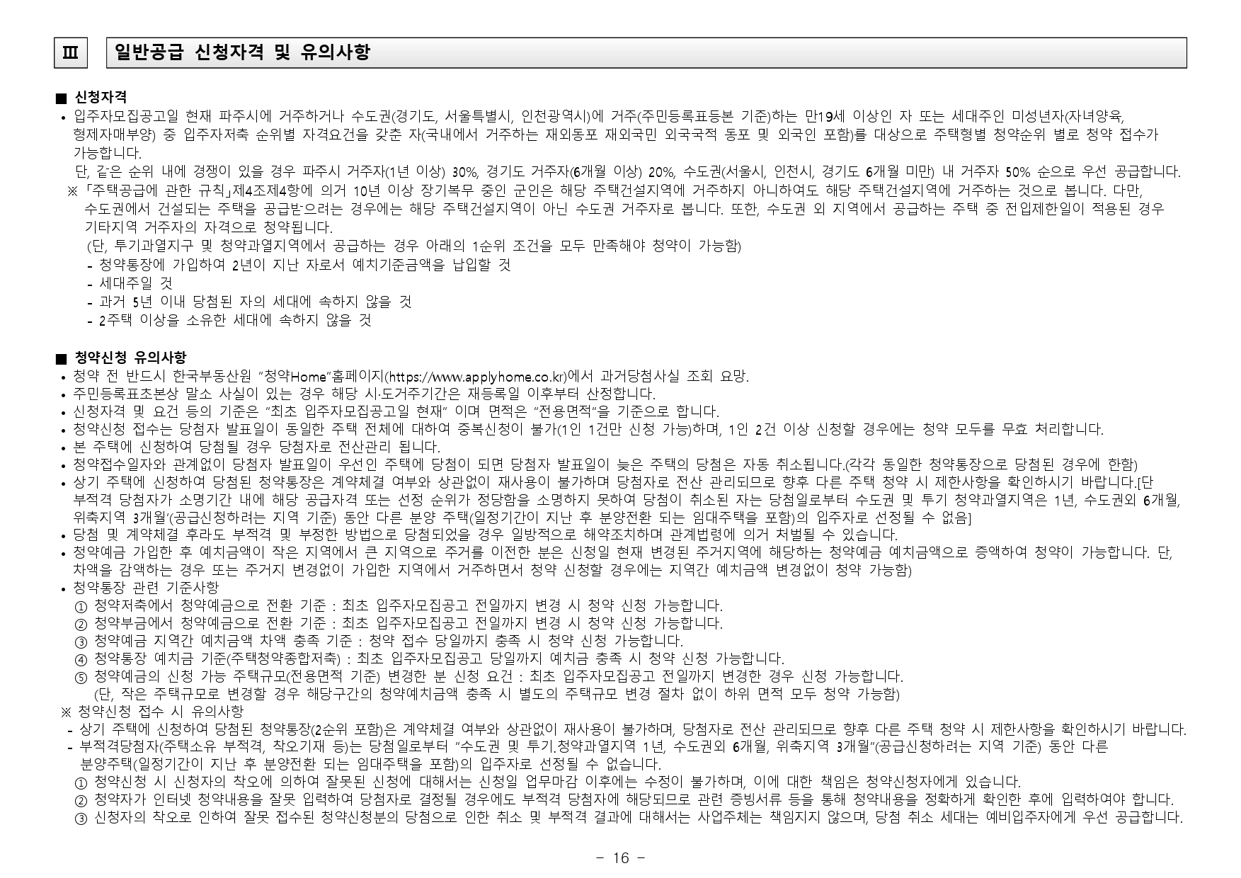 - - 파주시는 청약과열지역으로서 입주자모집공고일 기준 최근 1년간 계속하여 거주해야 1순위(해당 주택건설지역 거주자) 중 우선공급 대상 요건을 충족하게 되며, 국내에 거주하지 않고 해외에 장기간(90일 초과) 체류하고 있는 상태에서 해당 주택건설지역 1순위자로 청약 당첨되는 것은 부정 당첨자에 해당되오니 청약시 유의하시기 바랍니다.