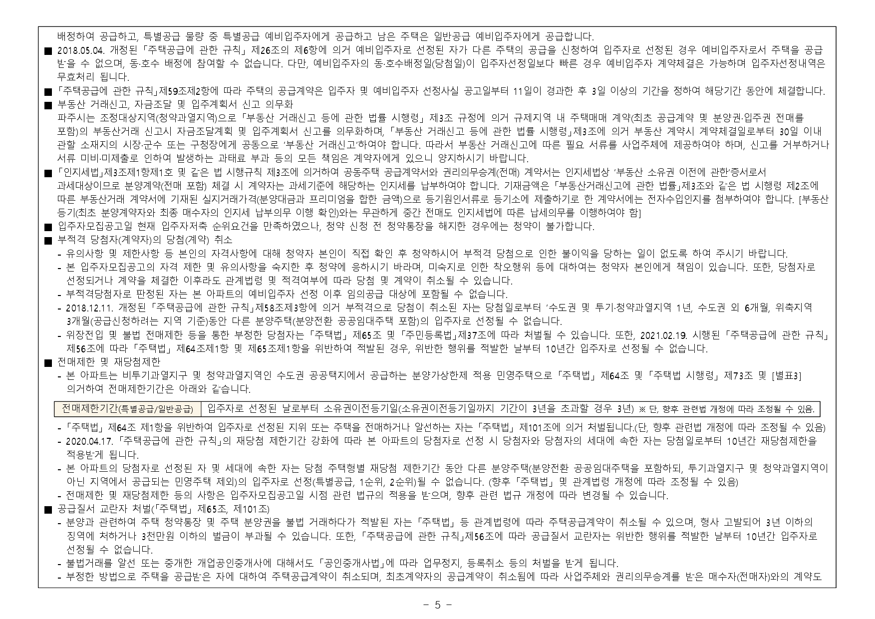 - 본 아파트의 당첨자로 선정 시 당첨자 및 세대에 속한 자는 당첨일로부터 향후 5년간 투기과열지구 및 청약과열지역에서 공급하는 주택의 1순위 청약접수가 제한되오니 유의하시기 바랍니다