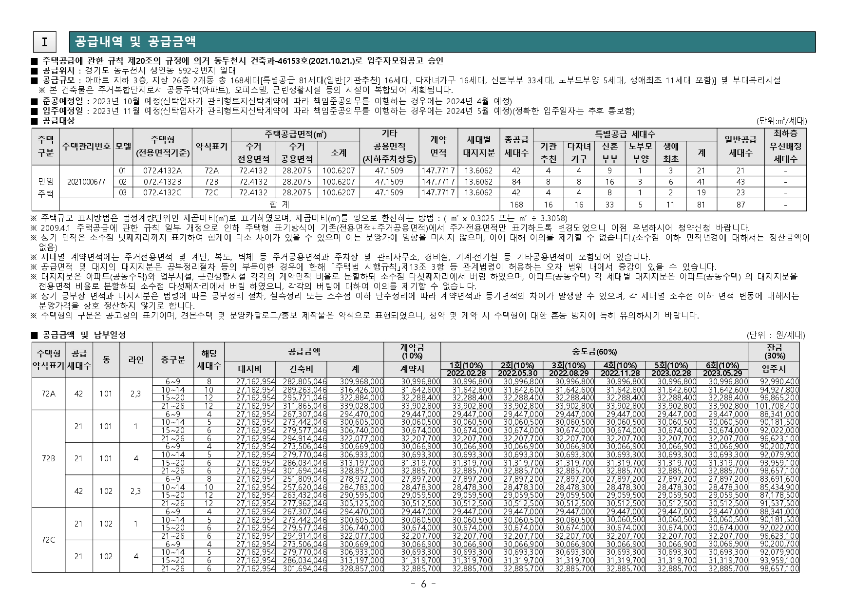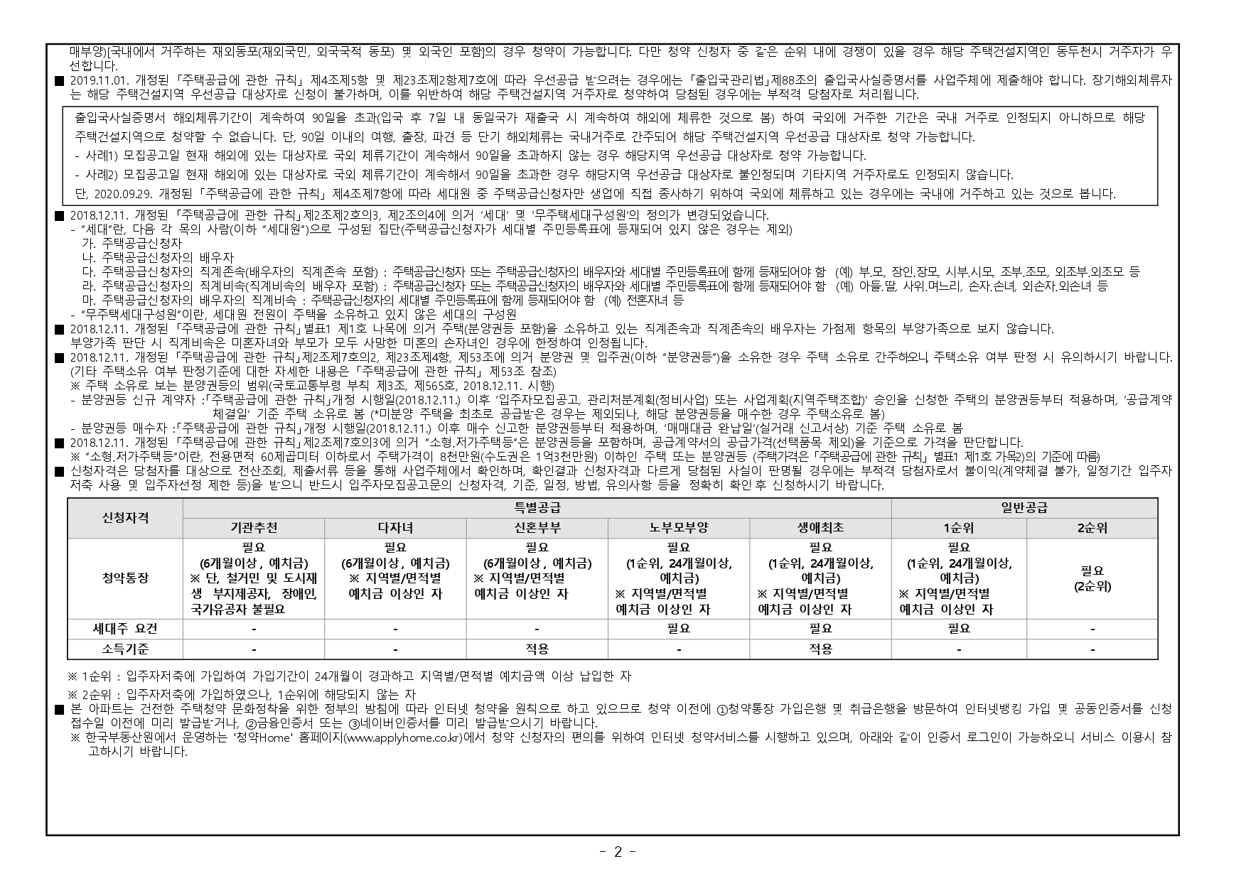 ■ 본 아파트 주택건설지역인 동두천시는 「주택법」 제63조 및 제63조의2에 의한 비투기과열지구 및 청약과열지역으로서, 본 아파트는 「주택공급에 관한 규칙」에 따라 2주택 이상 소유한 세대에 속한 분은 1순 위 자격에서 제외됩니다.(무주택 세대 또는 1주택을 소유한 세대에 속한 분만 1순위 청약 가능)