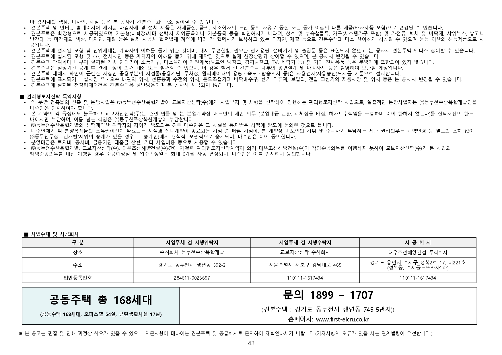 ■ 본 아파트의 입주자모집공고와 관련하여 보다 자세한 안내가 이루어질 수 있도록 상담전화(☎1899-1707)를 실시할 예정이오나, 간혹 폭주하는 상담전화와 신청자 개인의 다양하고 복잡한 상황에 대하여 정확하지 않은 정보 제공으로 청약관련 사항에 착오 안내가 이루어지는 경우가 있습니다. 고객 여러분께서는 청약과 관련한 상담은 청약신청 시 참고자료로만 활용해 주시기 바라며, 청약신청 시 입주자모집공고를 통해 청약자격 등을 숙지하신 후 관련 서류 등 확인하시어 청약신청하시기 바랍니다. 청약자격 미숙지, 착오 신청 등에 대해서는 신청자 본인에게 책임이 있으니 불이익을 당하는 일이 없도록 주의하시기 바랍니다.