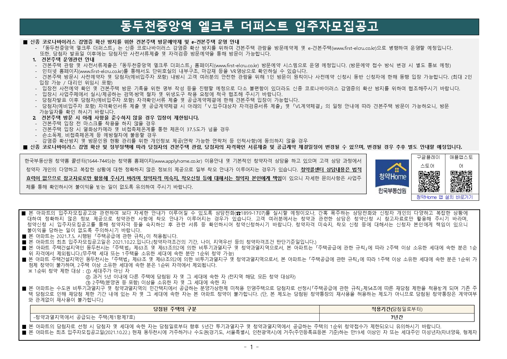■ 본 아파트 주택건설지역인 동두천시는 「주택법」 제63조 및 제63조의2에 의한 비투기과열지구 및 청약과열지역으로서, 본 아파트는 「주택공급에 관한 규칙」에 따라 2주택 이상 소유한 세대에 속한 분은 1순 위 자격에서 제외됩니다.(무주택 세대 또는 1주택을 소유한 세대에 속한 분만 1순위 청약 가능)