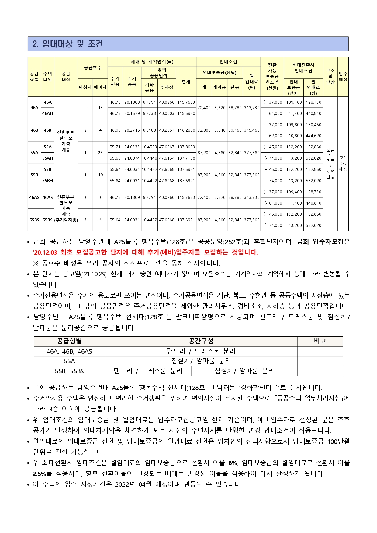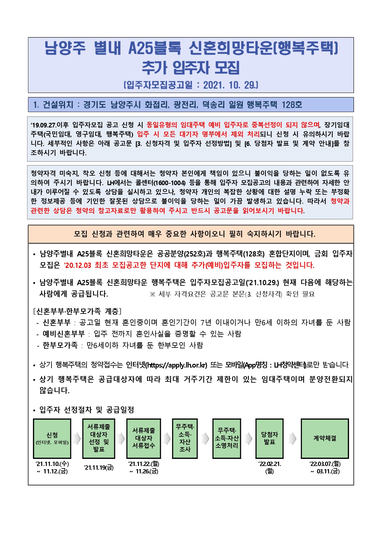 • 남양주별내 A25블록 신혼희망타운은 공공분양(252호)과 행복주택(128호) 혼합단지이며, 금회 입주자 모집은 ‘20.12.03 최초 모집공고한 단지에 대해 추가(예비)입주자를 모집하는 것입니다.