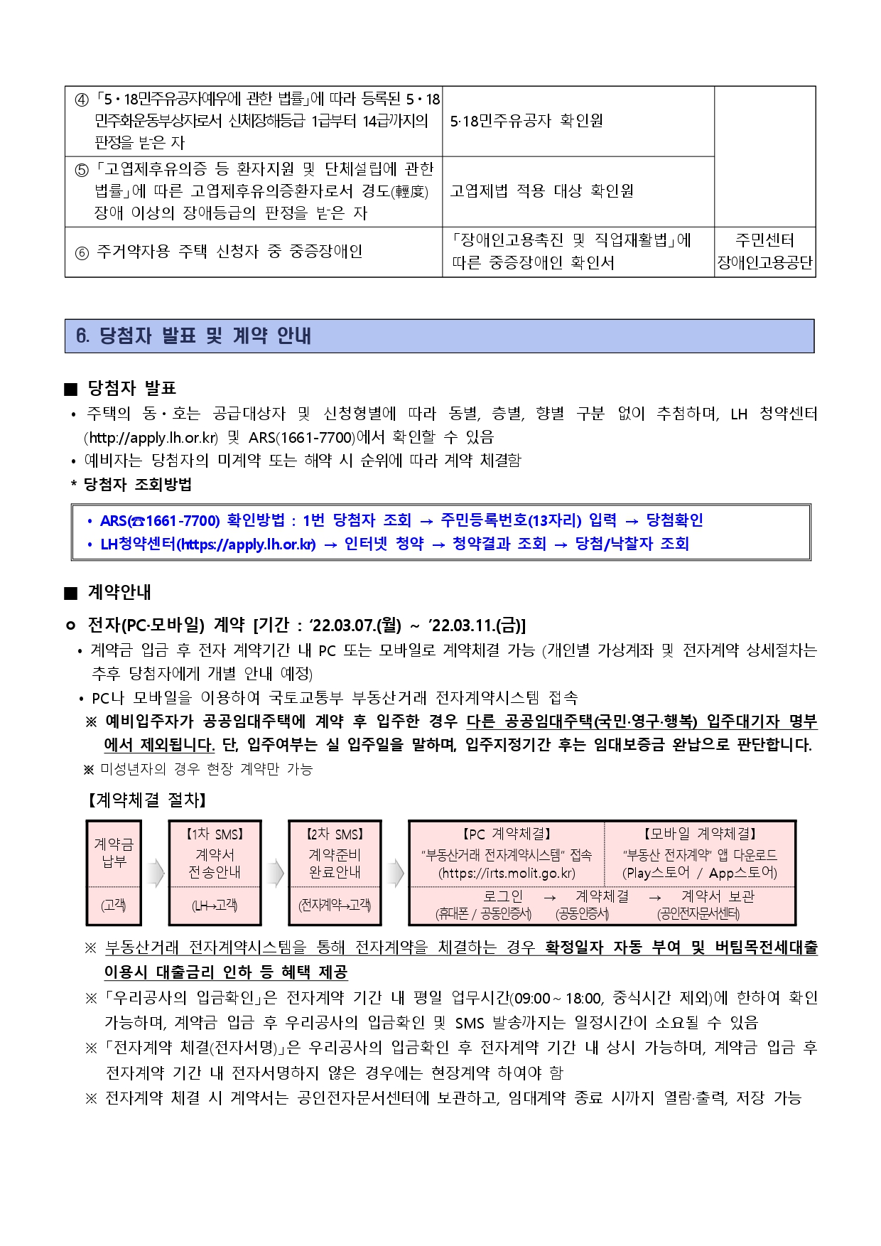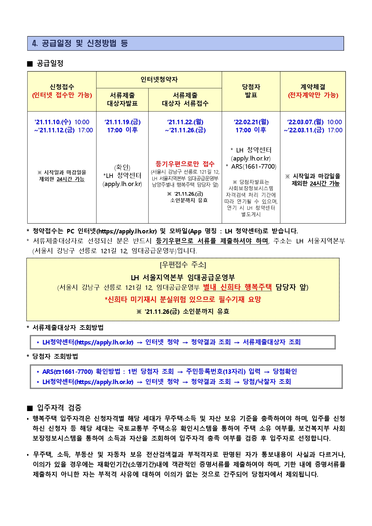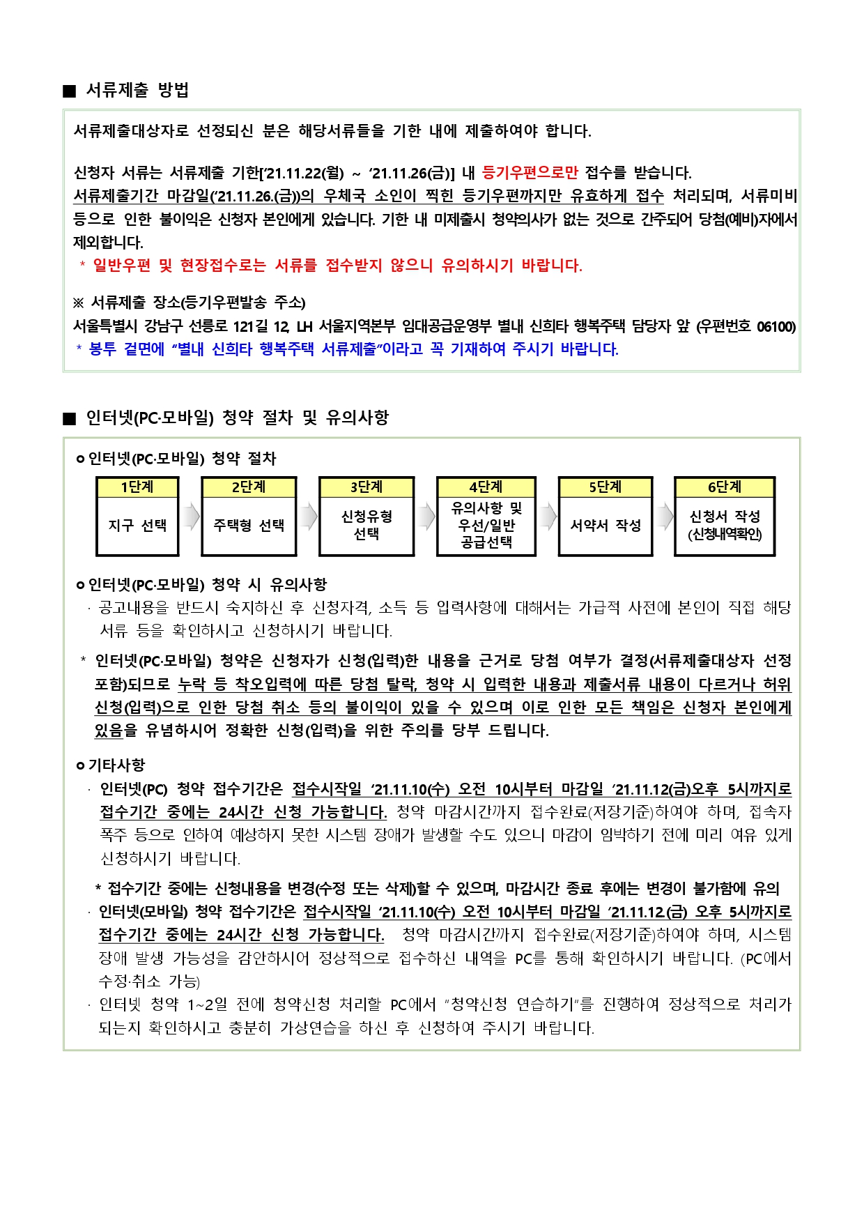 • 상기 행복주택의 청약접수는 인터넷(https://apply.lh.or.kr) 또는 모바일(App명칭 : LH청약센터)로만 받습니다. • 상기 행복주택은 공급대상자에 따라 최대 거주기간 제한이 있는 임대주택이며 분양전환되지 않습니다.