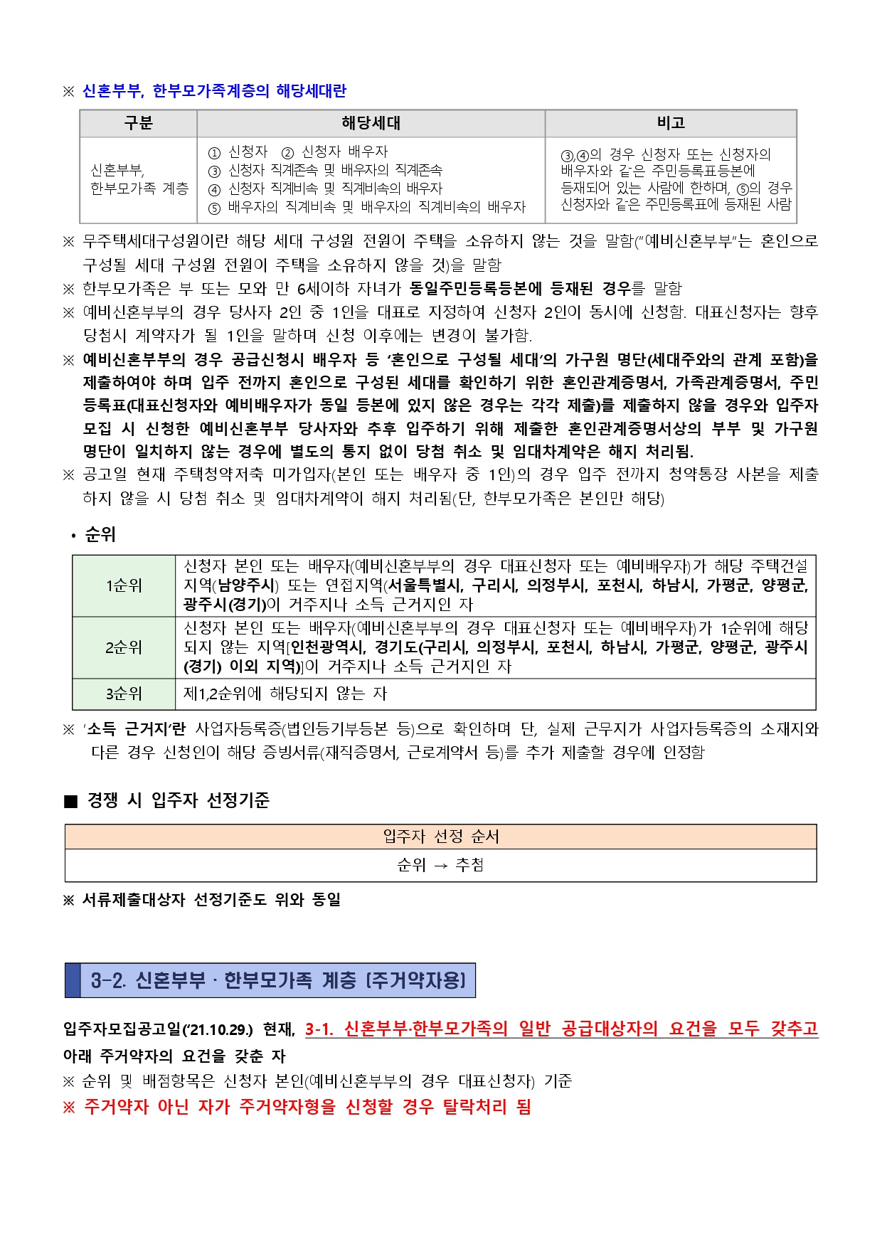 • 남양주별내 A25블록 신혼희망타운 행복주택은 입주자모집공고일(‘21.10.29.) 현재 다음에 해당하는 사람에게 공급됩니다. ※ 세부 자격요건은 공고문 본문(3. 신청자격) 확인 필요〔신혼부부·한부모가족 계층〕