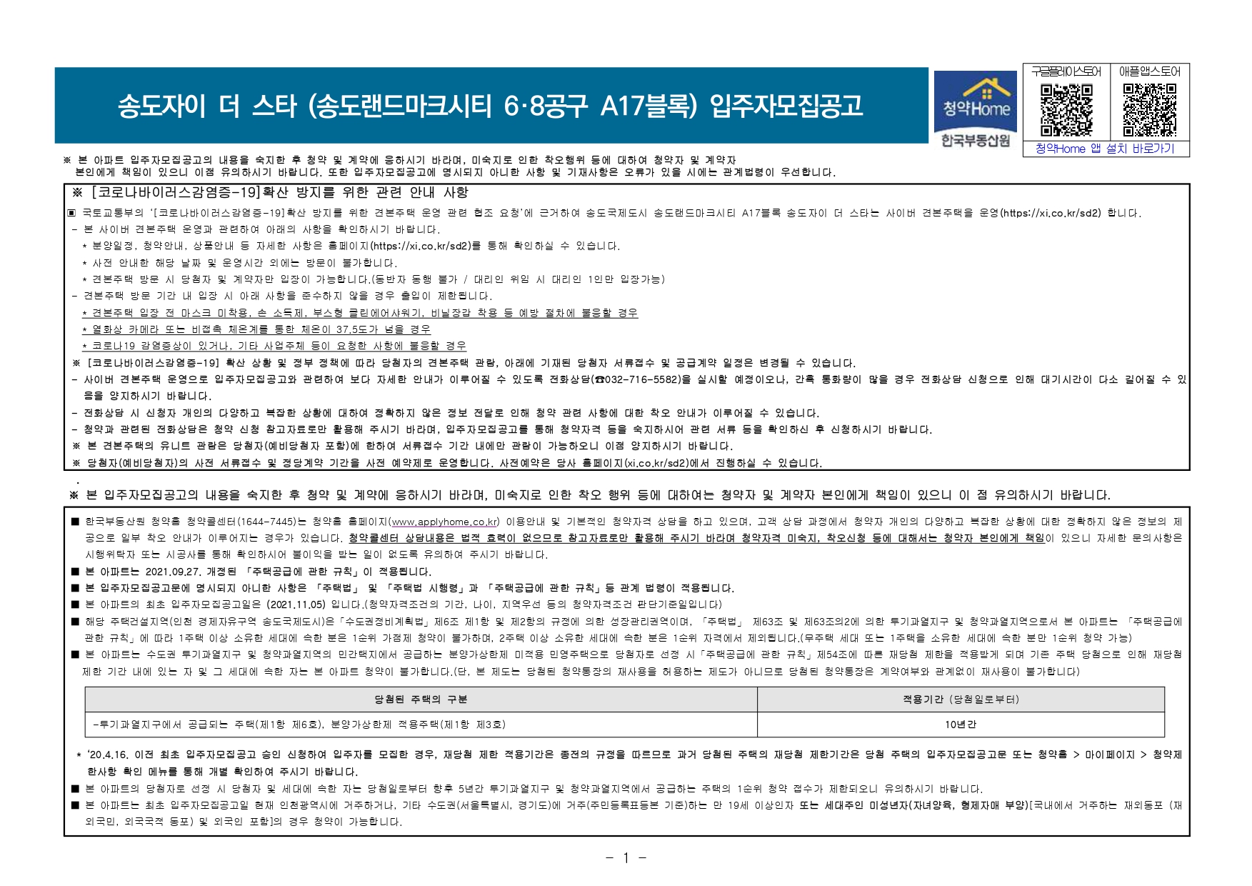 - 해당 주택건설지역(인천 경제자유구역 송도국제도시)은「수도권정비계획법」제6조 제1항 및 제2항의 규정에 의한 성장관리권역이며, 「주택법」 제63조 및 제63조의2에 의한 투기과열지구 및 청약과열지역으로서 본 아파트는 「주택공급에제한 기간 내에 있는 자 및 그 세대에 속한 자는 본 아파트 청약이 불가합니다.(단, 본 제도는 당첨된 청약통장의 재사용을 허용하는 제도가 아니므로 당첨된 청약통장은 계약여부와 관계없이 재사용이 불가합니다)