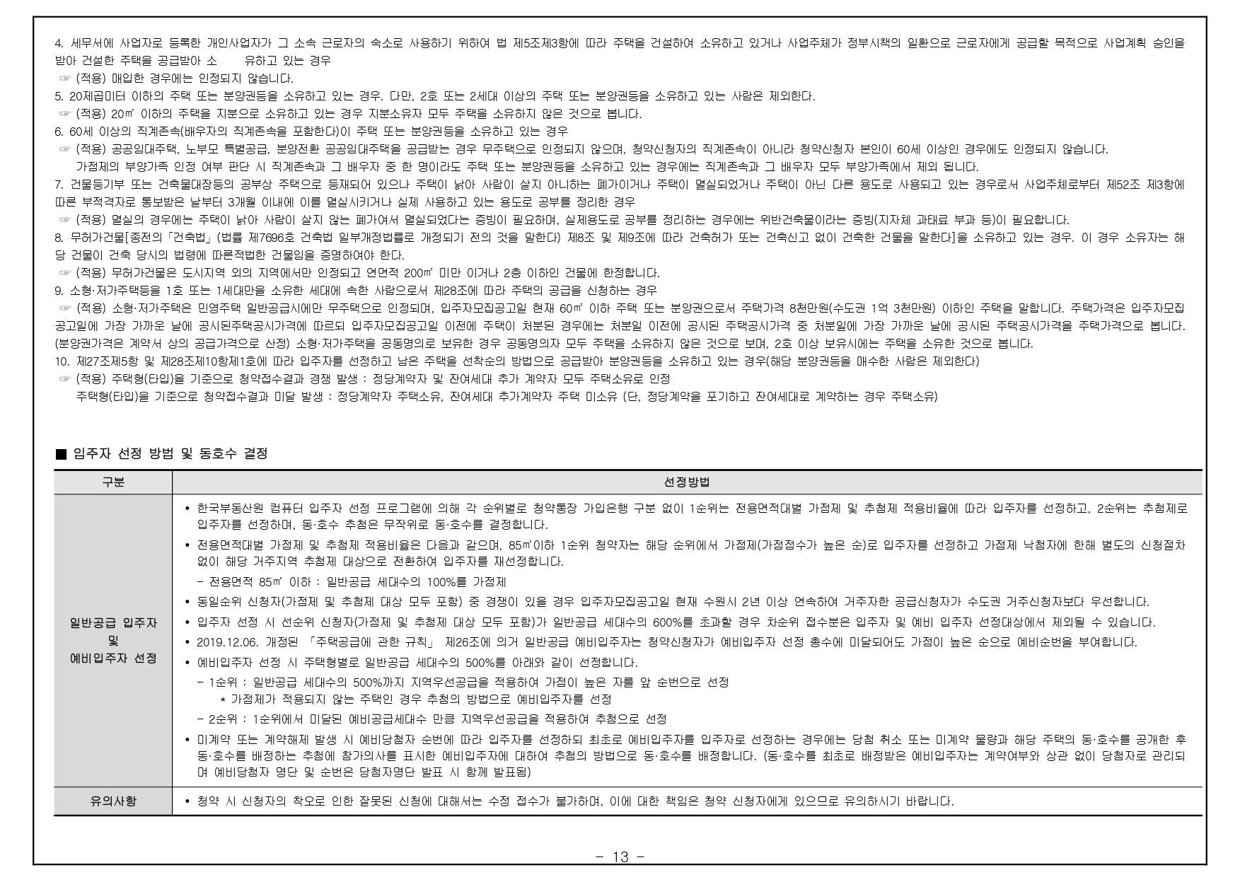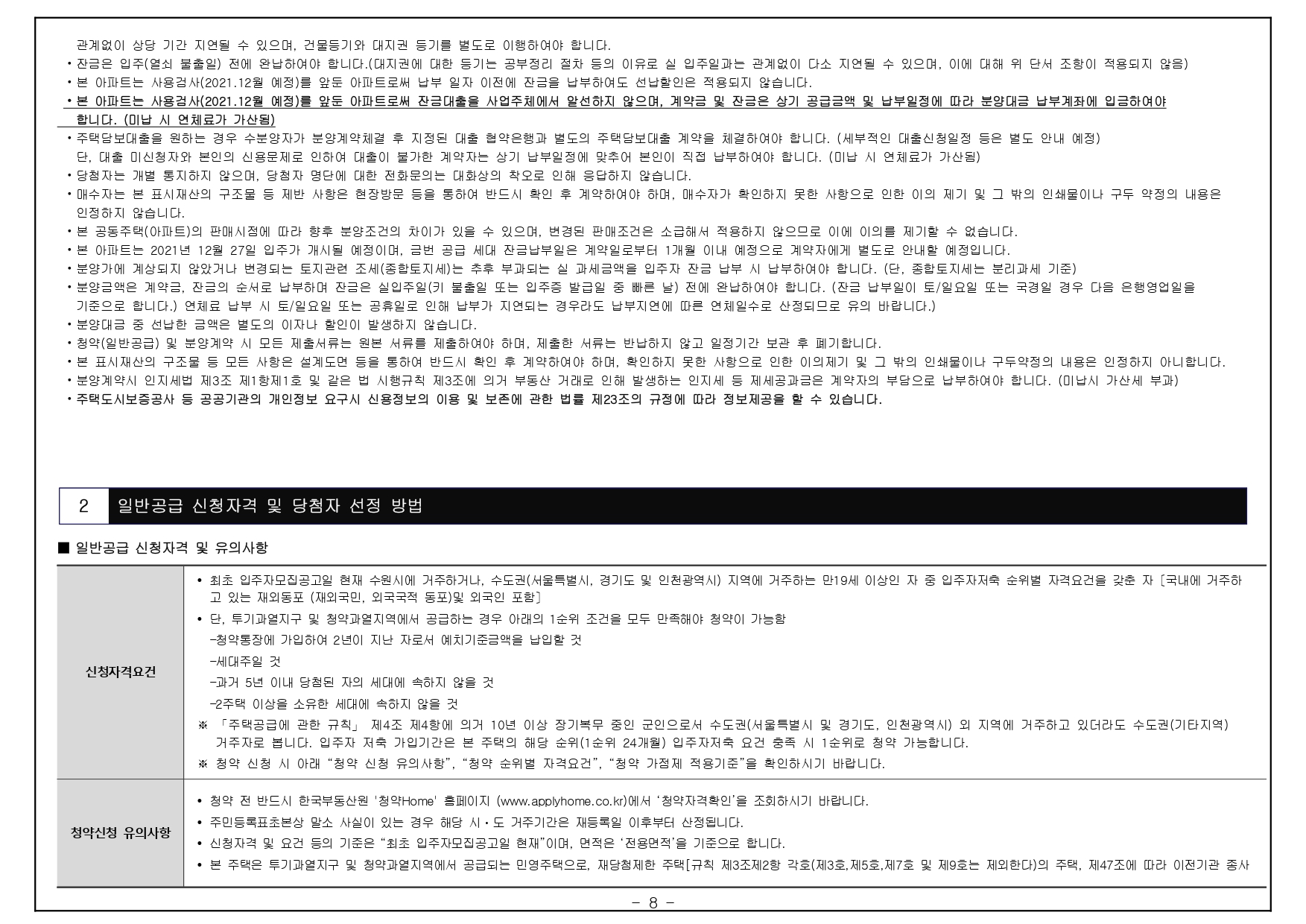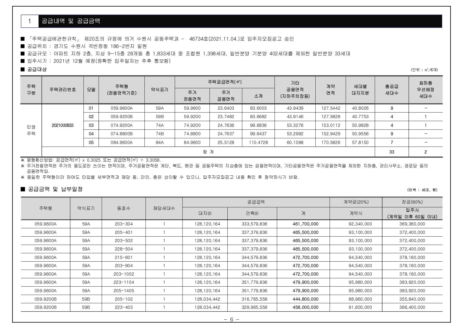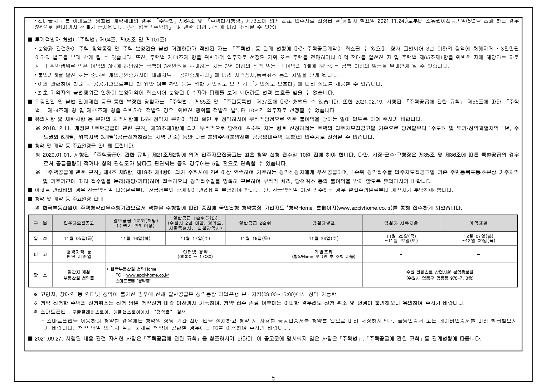 ■ 본 아파트는 2021.09.27. 시행된 「주택공급에 관한 규칙」이 적용됩니다. ■ 본 아파트의 최초 입주자모집공고일은 2021.11.05. 입니다.(청약자격조건의 기간, 나이, 지역우선 등의 청약자격조건 판단기준일입니다.) ■ 해당 주택건설지역(수원시)은 「주택법」 제63조 및 제63조의2에 의한 투기과열지구 및 청약과열지역으로서, 본 아파트는 「주택공급에 관한 규칙」에 따라 2주택 이상 소유한 세대에 속한 분은 1순위 자격 에서 제외됩니다.(무주택 세대 또는 1주택을 소유한 세대에 속한 분만 1순위 청약 가능) ■ 해당 주택건설지역(수원시)은 「주택법」 제63조 및 제63조의2에 의한 투기과열지구 및 청약과열지역으로서, 본 아파트는 「주택공급에 관한 규칙」에 따라 1주택 이상 소유한 세대에 속한 분은 1순위 가점제 청약이 불가하며, 2주택 이상 소유한 세대에 속한 분은 1순위 자격에서 제외됩니다.