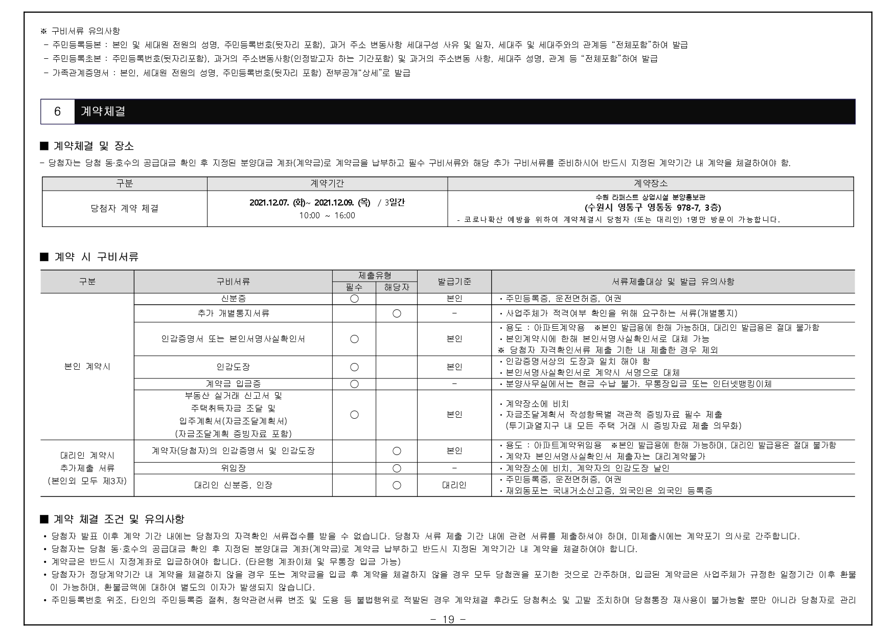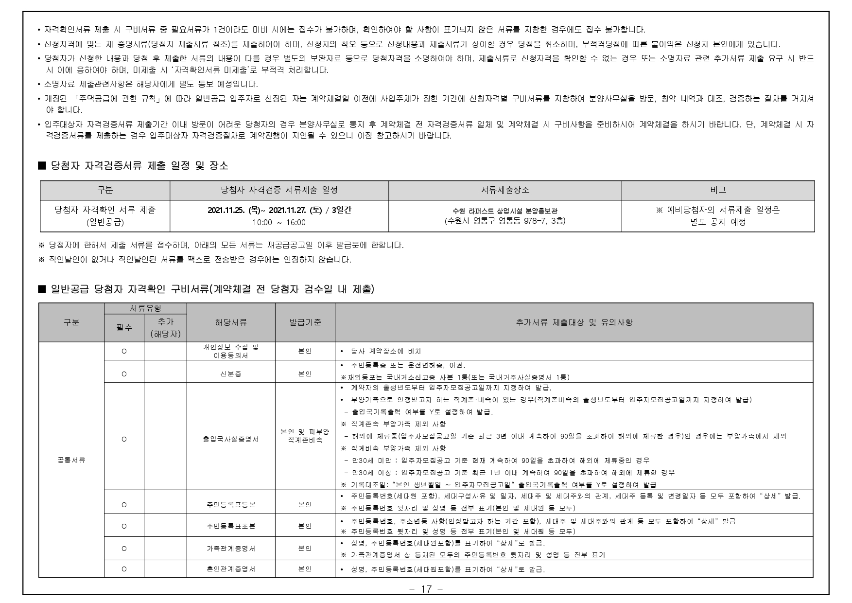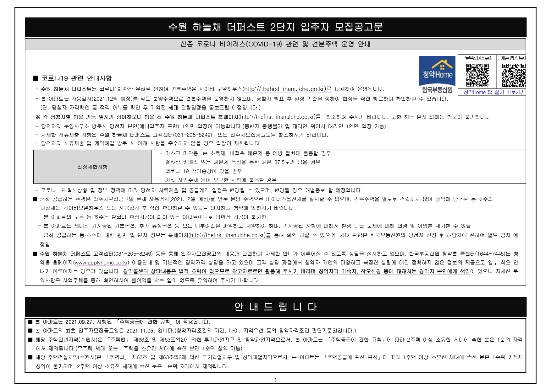 | 수원 하늘채 더퍼스트 1단지 입주자 모집공고문(21.11.5) (0) | 2021.11.08 |