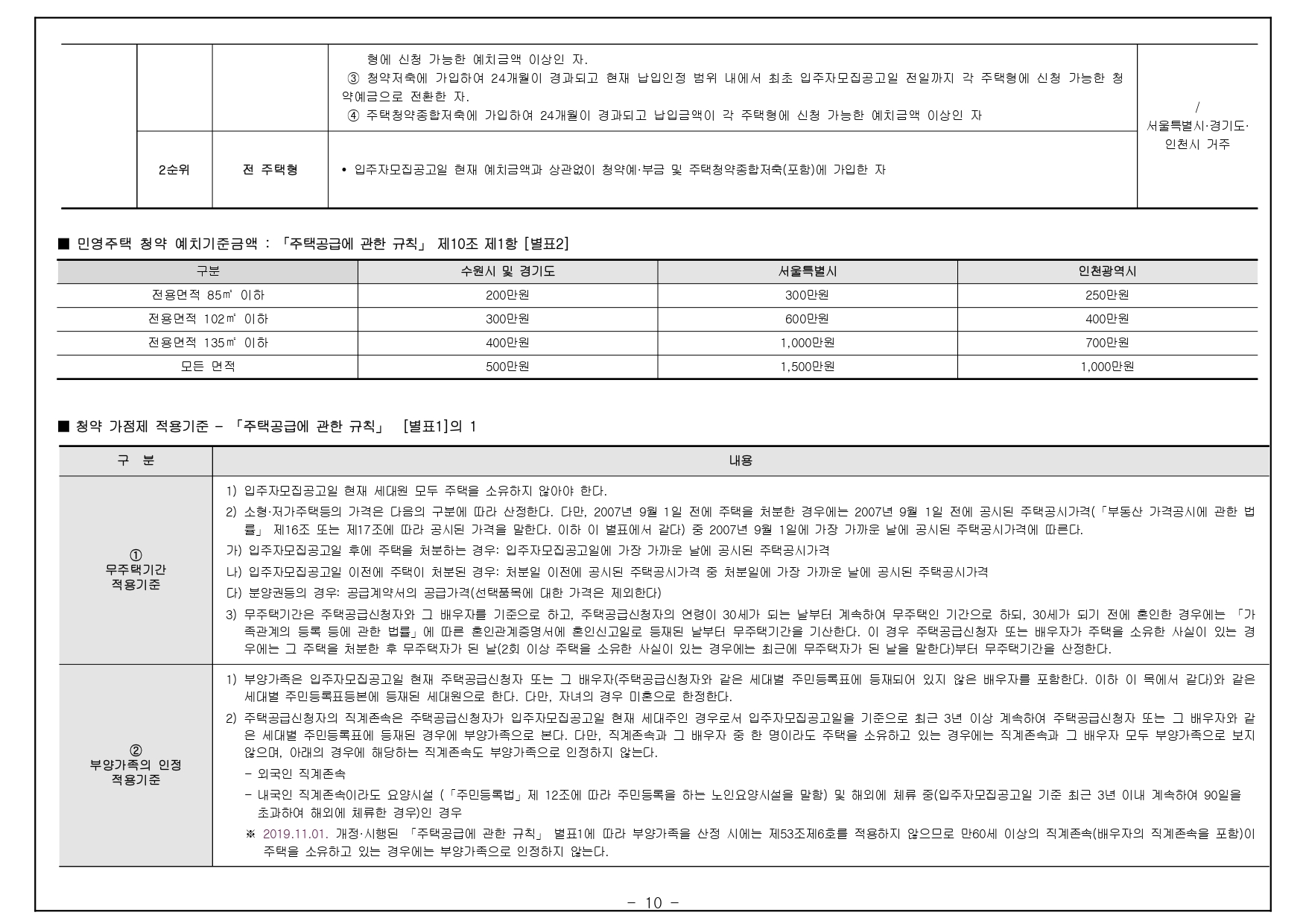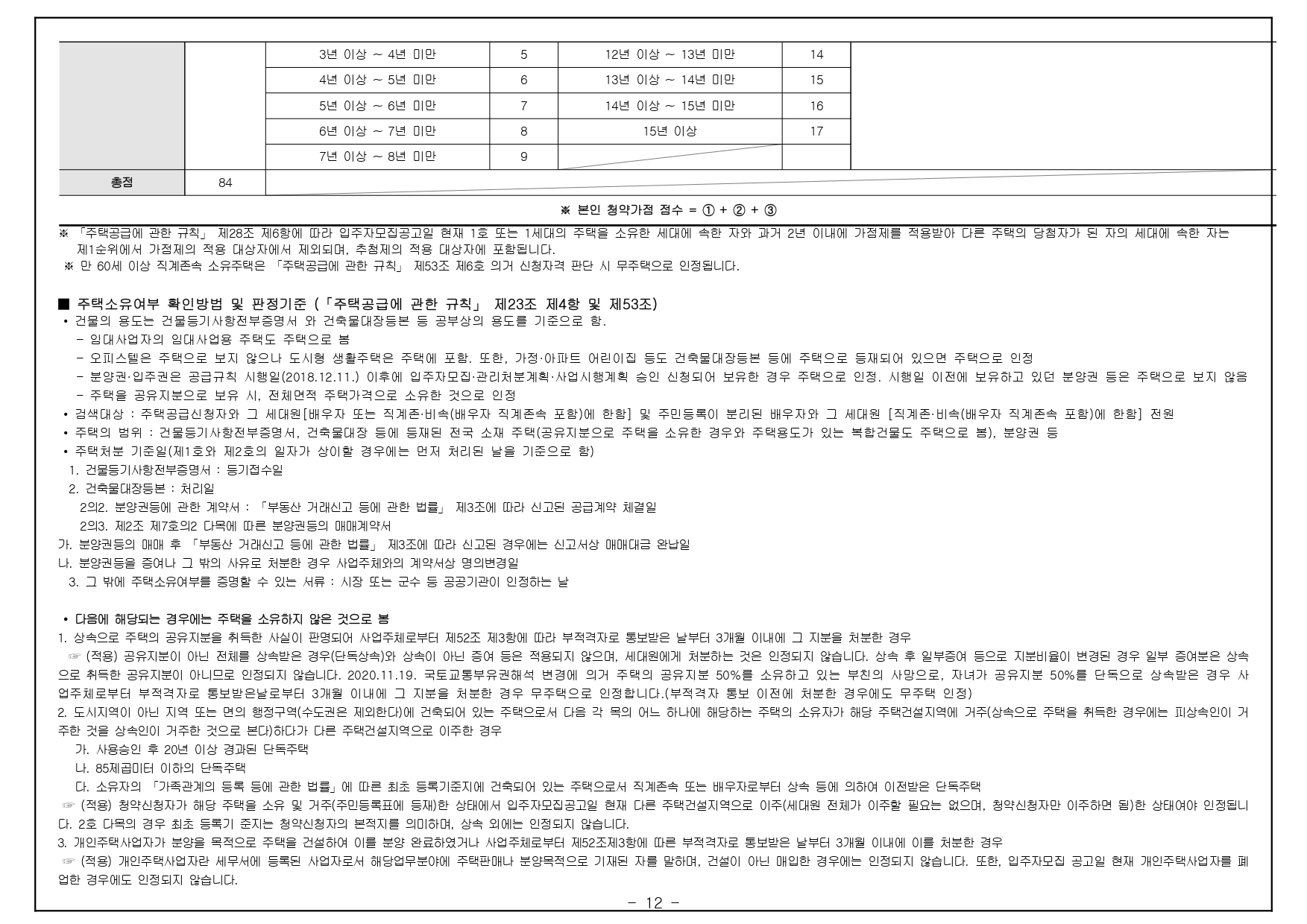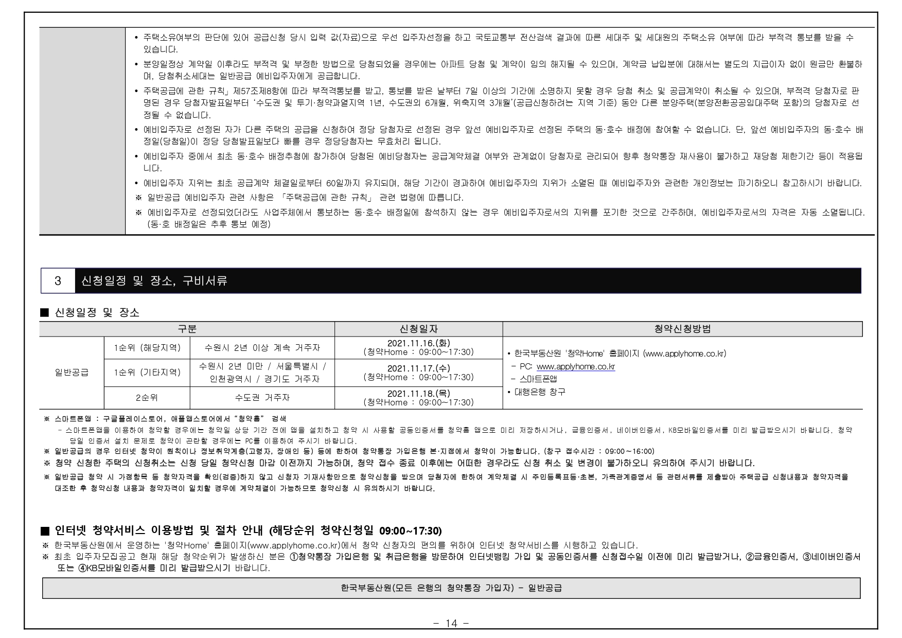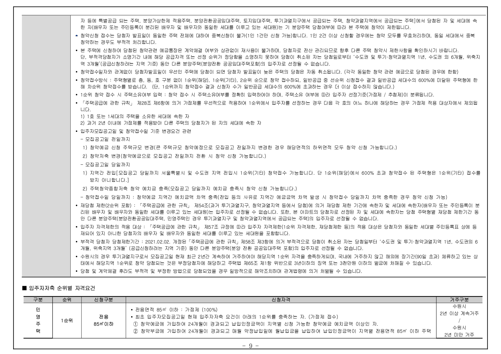 ■ 본 아파트는 2021.09.27. 시행된 「주택공급에 관한 규칙」이 적용됩니다. ■ 본 아파트의 최초 입주자모집공고일은 2021.11.05. 입니다.(청약자격조건의 기간, 나이, 지역우선 등의 청약자격조건 판단기준일입니다.) ■ 해당 주택건설지역(수원시)은 「주택법」 제63조 및 제63조의2에 의한 투기과열지구 및 청약과열지역으로서, 본 아파트는 「주택공급에 관한 규칙」에 따라 2주택 이상 소유한 세대에 속한 분은 1순위 자격 에서 제외됩니다.(무주택 세대 또는 1주택을 소유한 세대에 속한 분만 1순위 청약 가능) ■ 해당 주택건설지역(수원시)은 「주택법」 제63조 및 제63조의2에 의한 투기과열지구 및 청약과열지역으로서, 본 아파트는 「주택공급에 관한 규칙」에 따라 1주택 이상 소유한 세대에 속한 분은 1순위 가점제 청약이 불가하며, 2주택 이상 소유한 세대에 속한 분은 1순위 자격에서 제외됩니다.