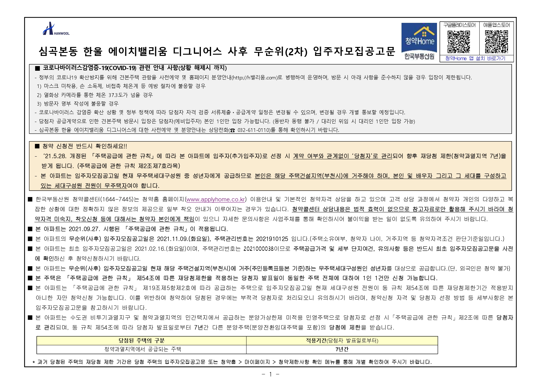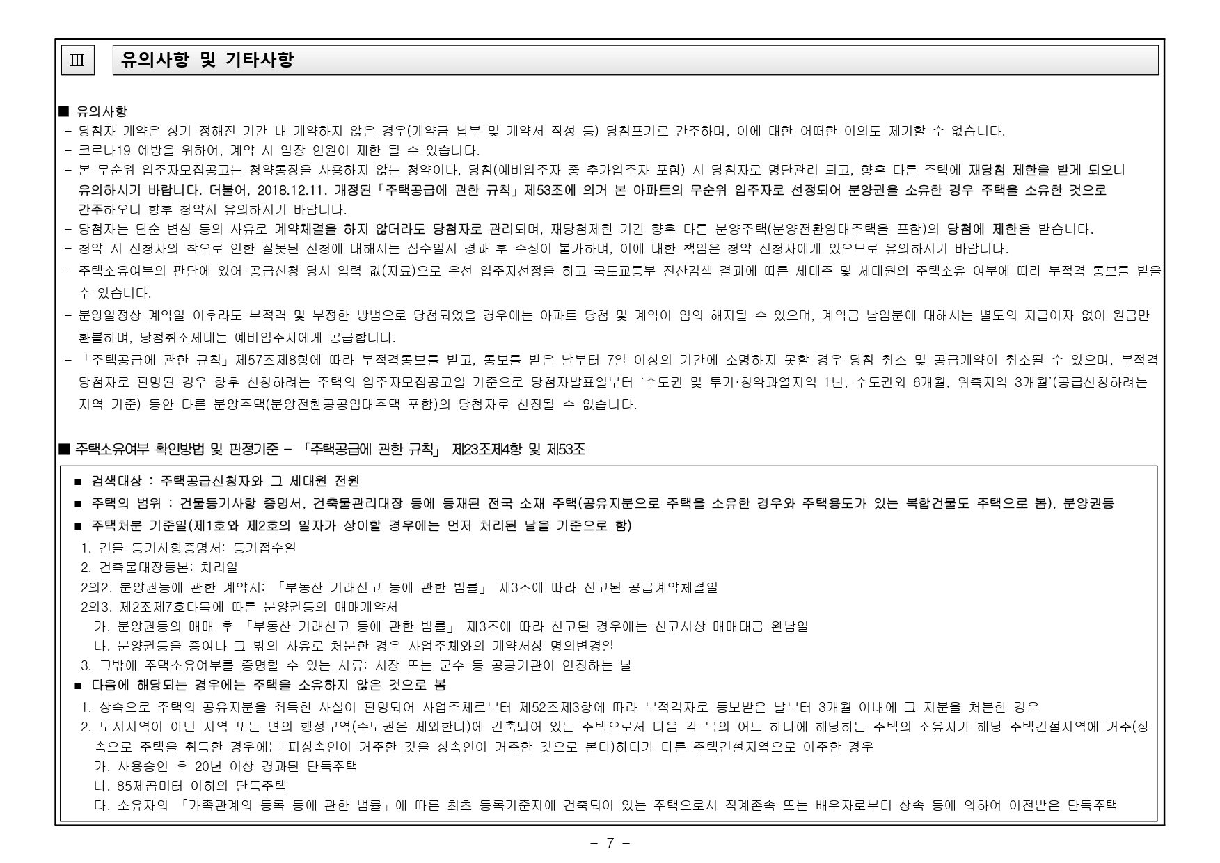 ■ 본 아파트는 수도권 비투기과열지구 및 청약과열지역의 민간택지에서 공급하는 분양가상한제 미적용 민영주택으로 당첨자로 선정 시「주택공급에 관한 규칙」제2조에 따른 당첨자 로 관리되며, 동 규칙 제54조에 따라 당첨자 발표일로부터 7년간 다른 분양주택(분양전환임대주택을 포함)의 당첨에 제한을 받습니다.