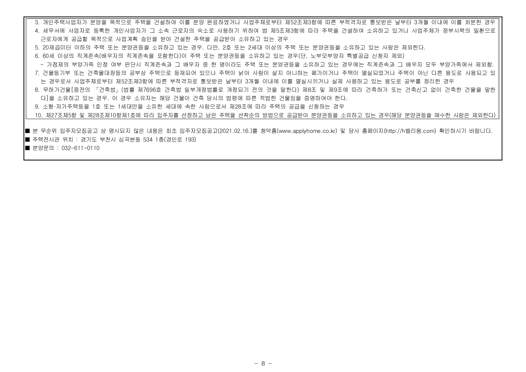 ■ 본 아파트는 무순위(사후) 입주자모집공고일 현재 해당 주택건설지역(부천시)에 거주(주민등록표등본 기준)하는 무주택세대구성원인 성년자를 대상으로 공급합니다.(단, 외국인은 청약 불가)