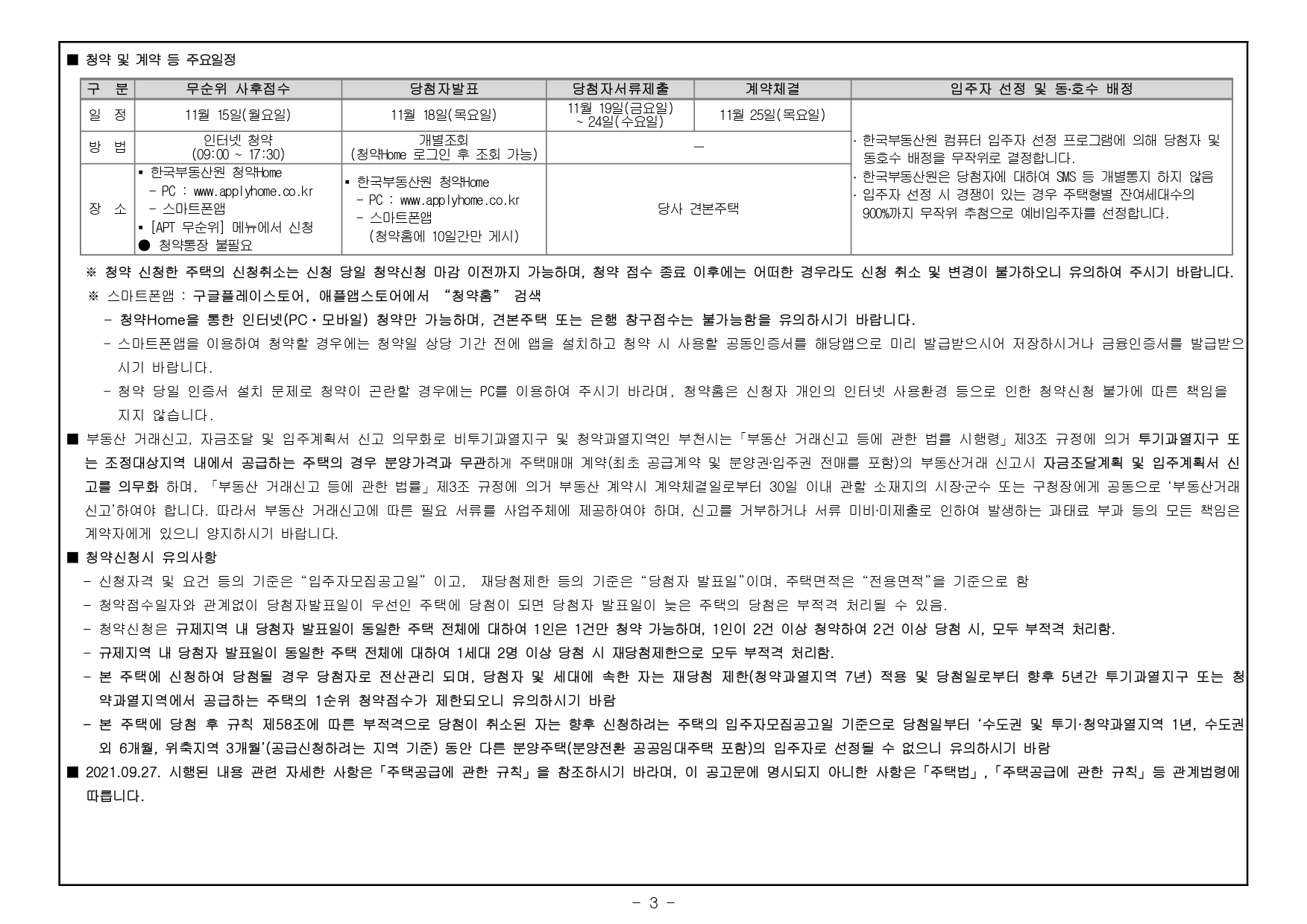 ■ 본 아파트는 수도권 비투기과열지구 및 청약과열지역의 민간택지에서 공급하는 분양가상한제 미적용 민영주택으로 당첨자로 선정 시「주택공급에 관한 규칙」제2조에 따른 당첨자 로 관리되며, 동 규칙 제54조에 따라 당첨자 발표일로부터 7년간 다른 분양주택(분양전환임대주택을 포함)의 당첨에 제한을 받습니다.