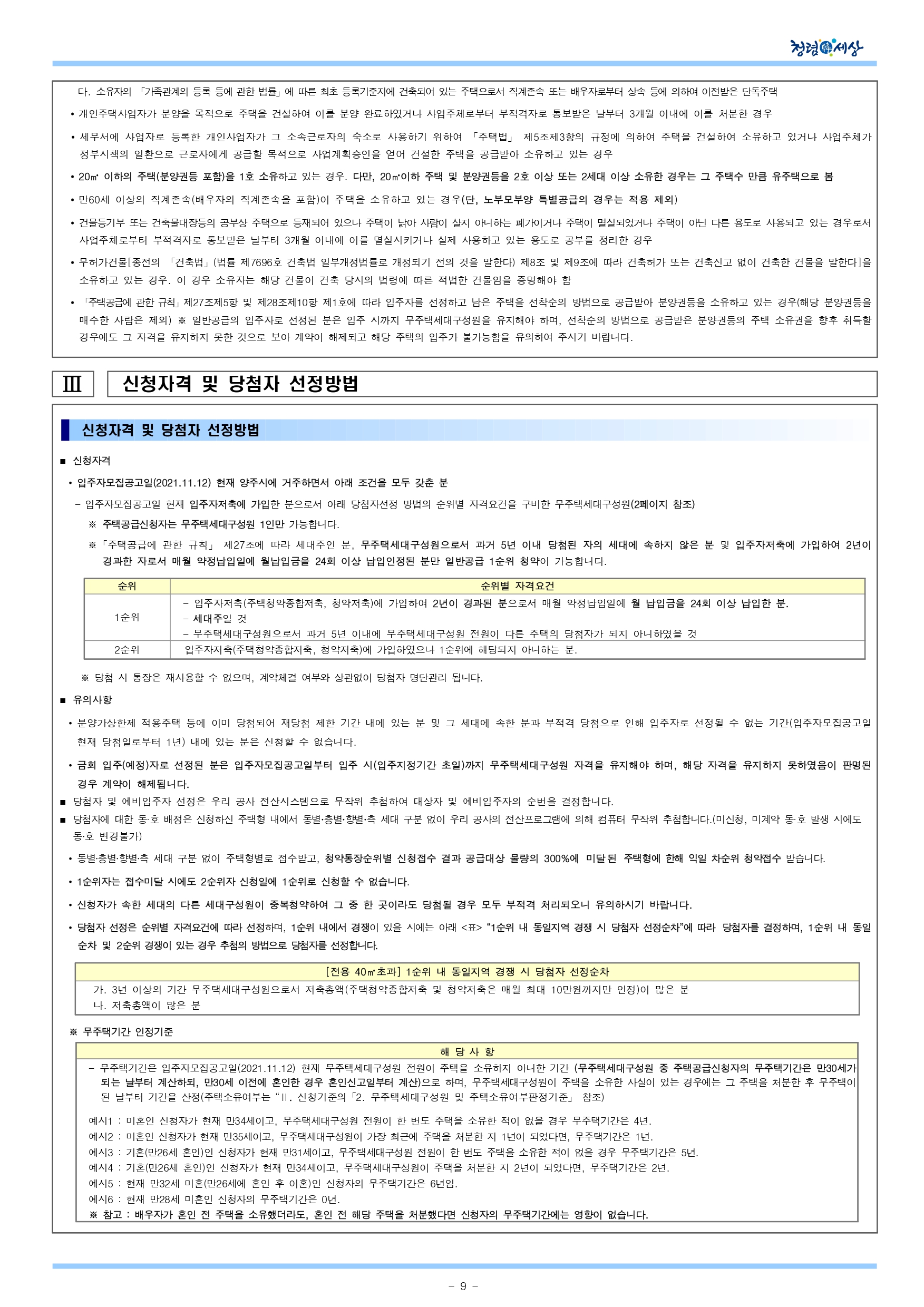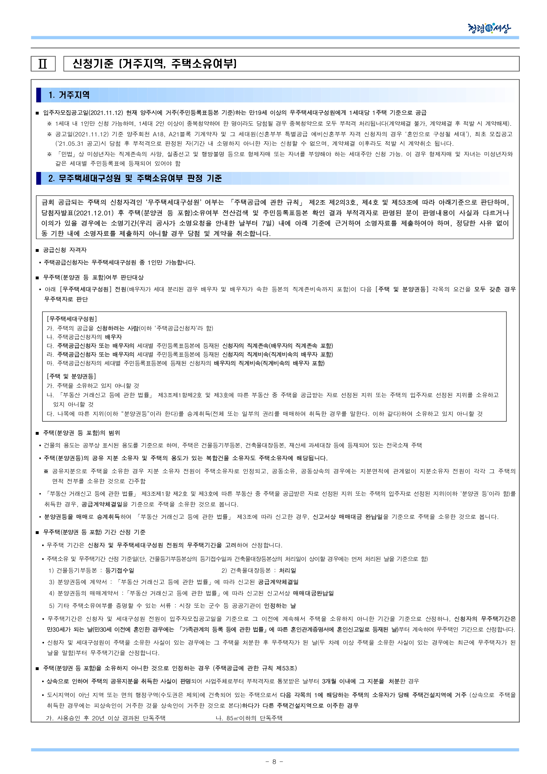 ◼ 공고일(2021.11.12) 기준 양주회천지구 A18, A21블록 기계약자 및 그 세대원(신혼부부 특별공급 예비신혼부부 자격 신청자의 경우 ‘혼인으로 구성될 세대’), 양주회천지구 A18, A21블록 최초 모집공고(’21.05.31 공고) 시 당첨 후 부적격으로 판정된 자(기간 내 소명하지 아니한 자)는 신청할 수 없으며, 계약체결 이후라도 적발 시 계약취소 됩니다. (‘세대원’은 아래 <표>의 ‘무주택세대구성원’을 의미합니다.)