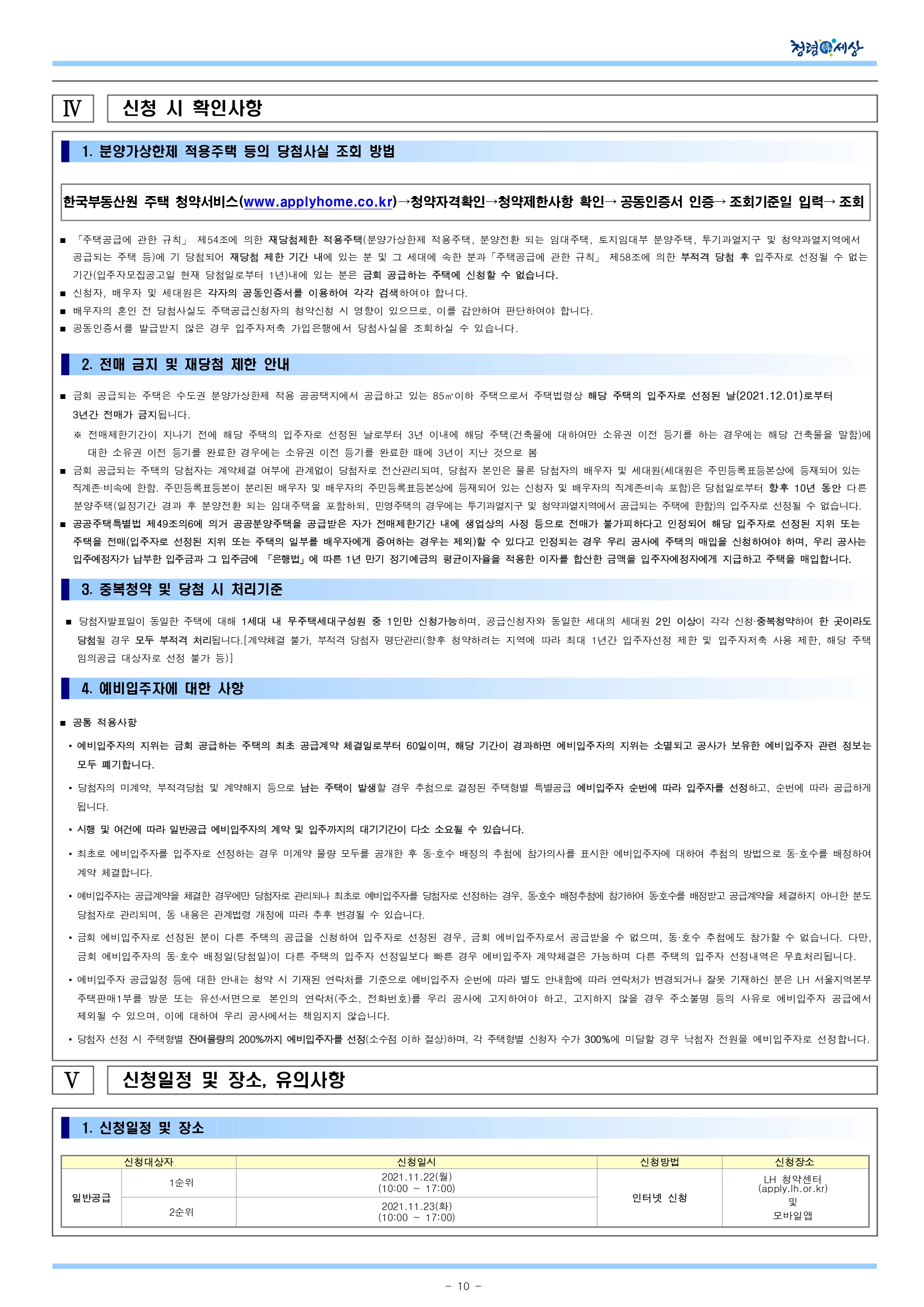 ◼ 금회 공급되는 주택은 「주택공급에 관한 규칙」 제54조에 따라 과거 재당첨 제한 대상 주택(분양가상한제 적용주택, 분양전환공공임대주택, 토지임대주택, 이전기관 종사자 특별공급주택, 투기과열지구 및 청약과열지역에서 공급되는 주택 등)에 당첨된 자의 세대에 속하여 재당첨 제한 기간 중에 있는 분은 청약할 수 없으며, 청약하여 당첨 시 부적격 당첨자로 처리되어 부적격 당첨자 본인은 향후 청약하려는 지역에 따라 최대 1년간 다른 분양주택(분양전환공공임대주택을 포함)의 입주자로 선정될 수 없는 불이익이 있으니 유의하여 주시기 바랍니다.