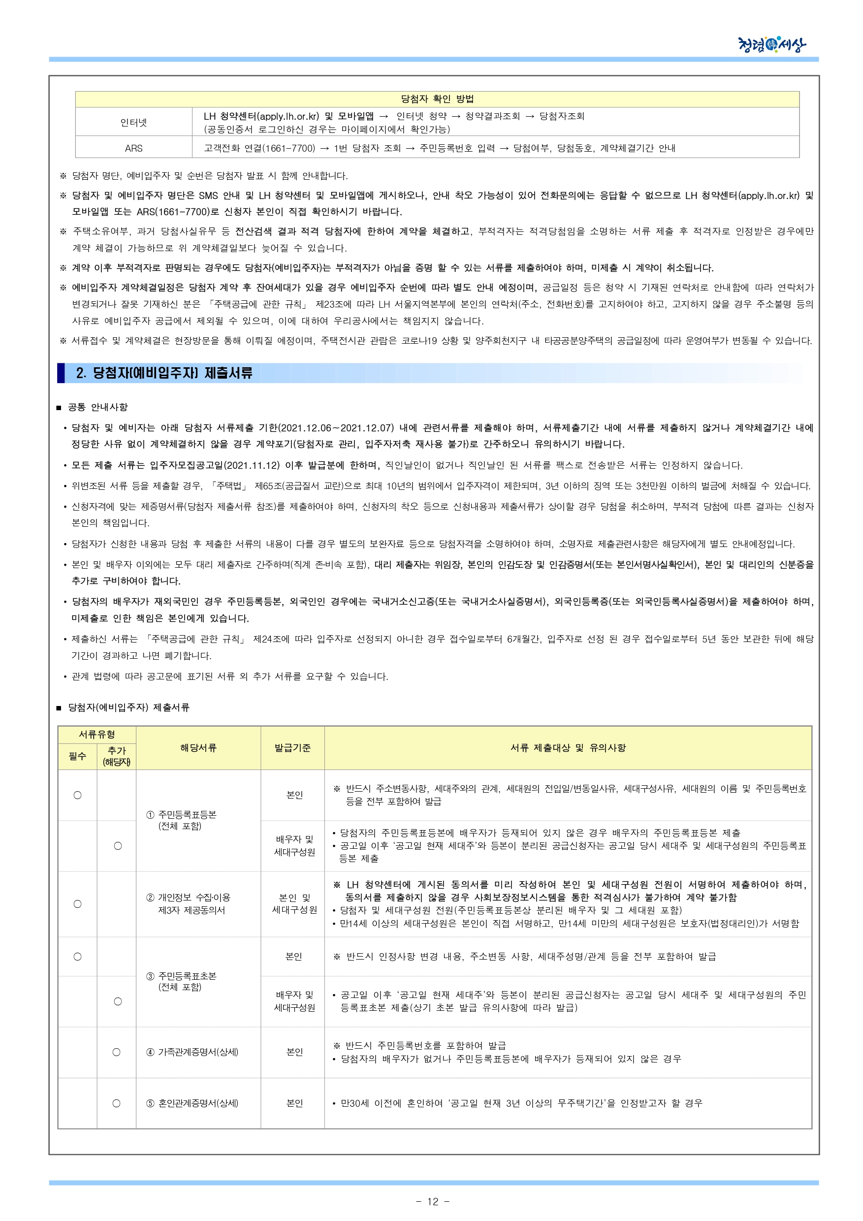 ◼ 또한 동일세대 내에서 1인 이상이 당첨자 발표일이 서로 다른 국민주택에 청약하는 경우 당첨자 발표일이 우선인 단지의 당첨만 유효 및 계약체결이 가능합니다. (후당첨 단지 무효 또는 부적격처리 됨)