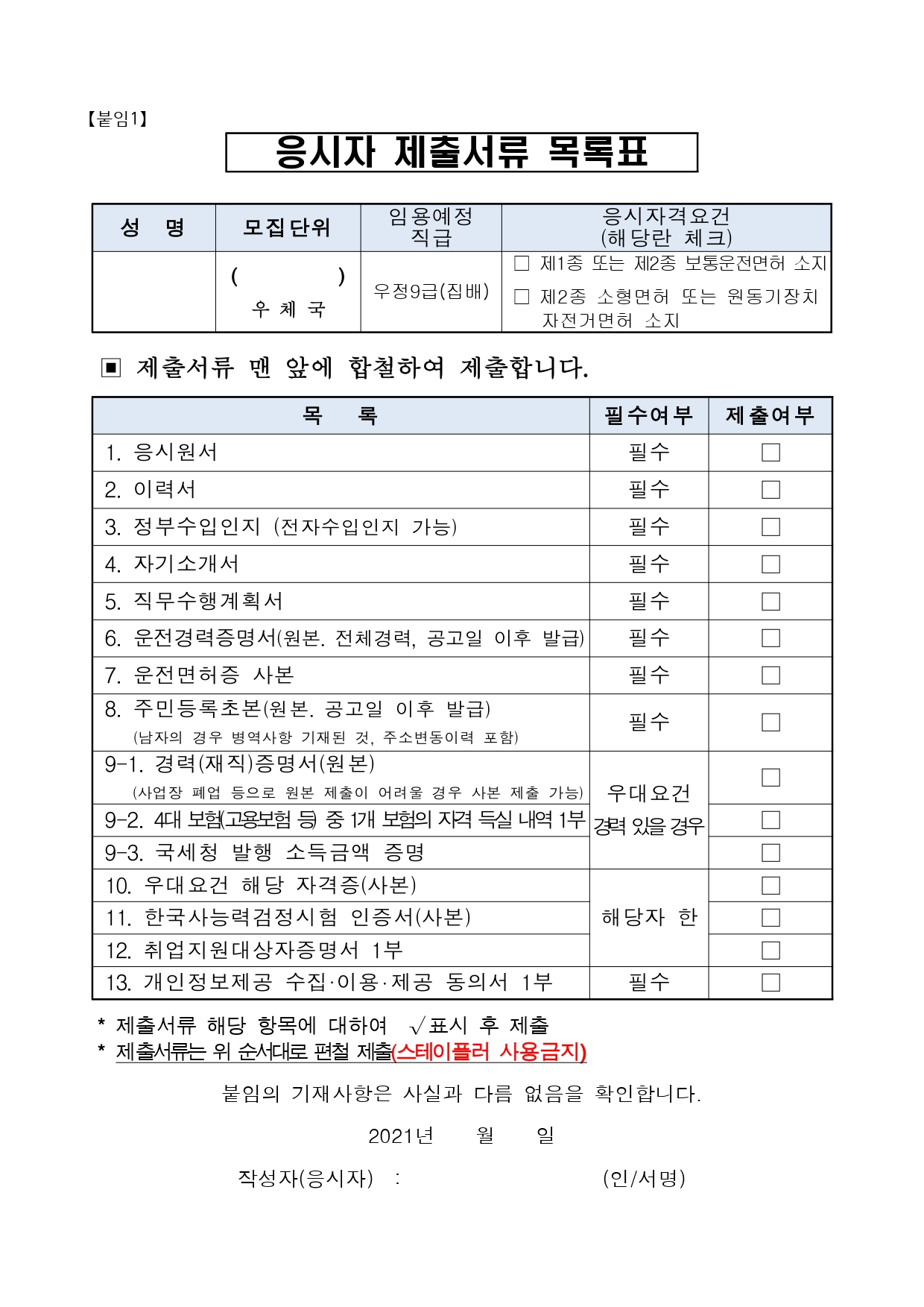211115_경북지방우정청_응시원서등제출서류(우정9급) (1).hwp