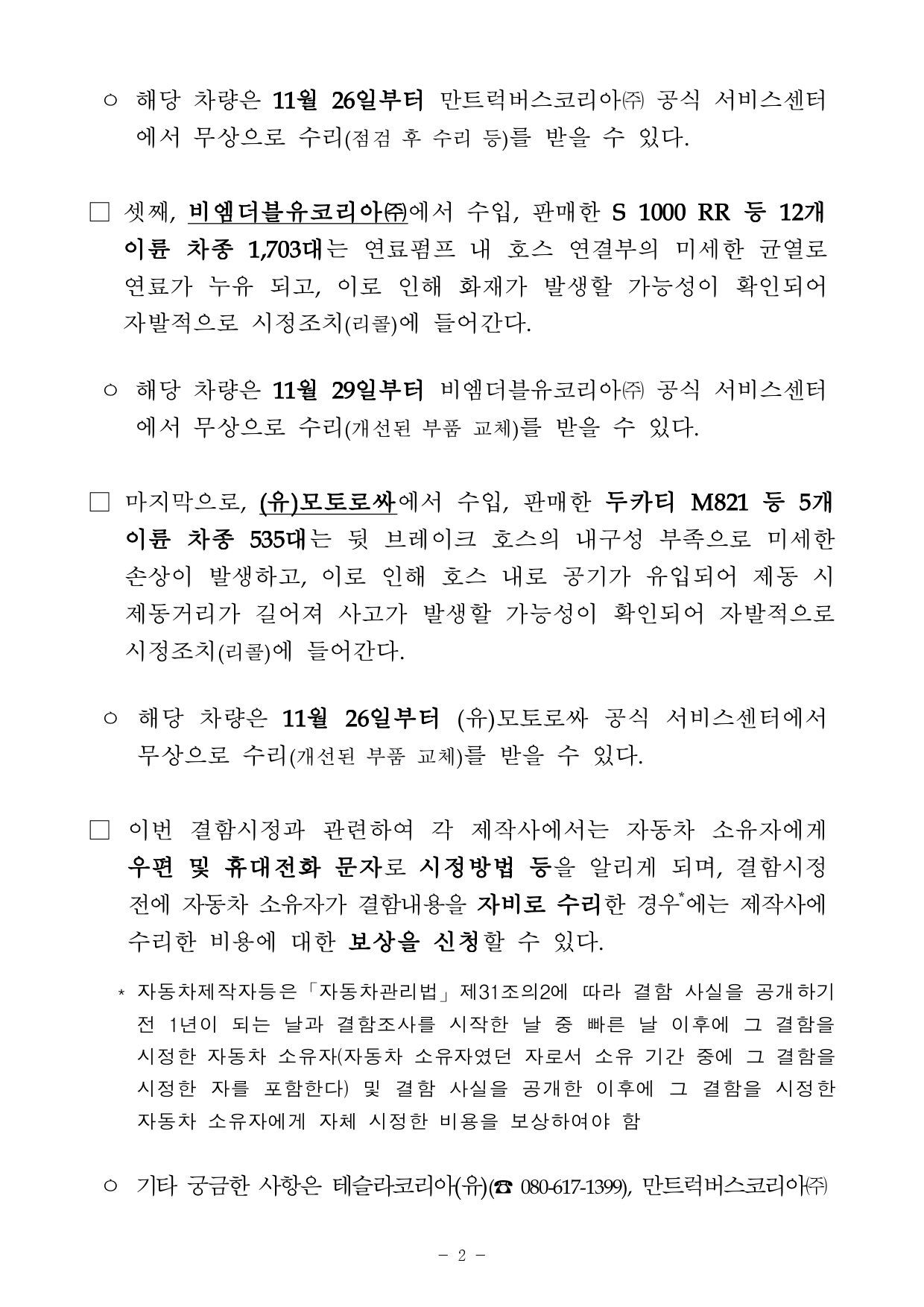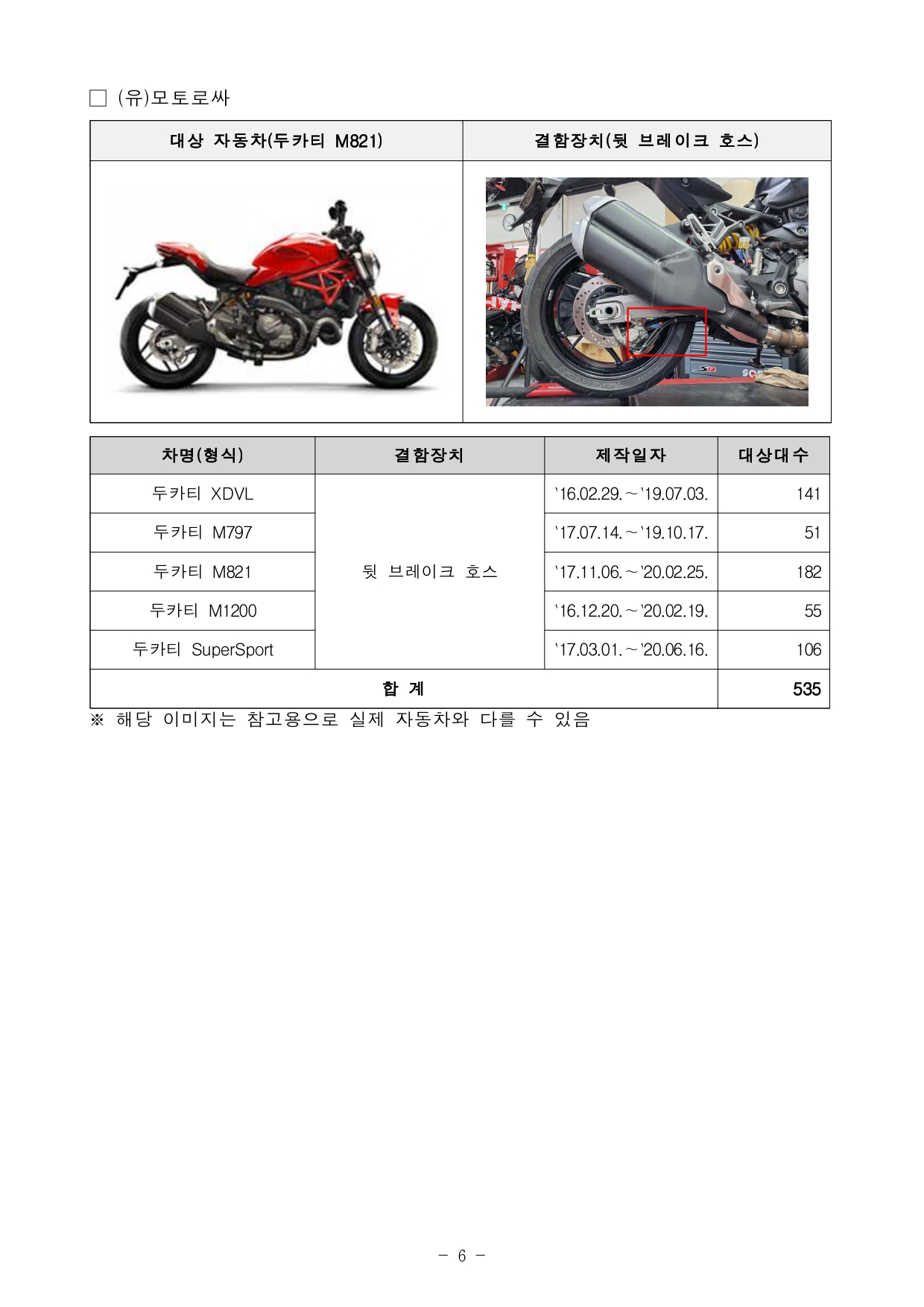 □ 마지막으로, (유)모토로싸에서 수입, 판매한 두카티 M821 등 5개 이륜 차종 535대는 뒷 브레이크 호스의 내구성 부족으로 미세한 손상이 발생하고, 이로 인해 호스 내로 공기가 유입되어 제동 시 제동거리가 길어져 사고가 발생할 가능성이 확인되어 자발적으로 시정조치(리콜)에 들어간다. ㅇ 해당 차량은 11월 26일부터 (유)모토로싸 공식 서비스센터에서 무상으로 수리(개선된 부품 교체)를 받을 수 있다.